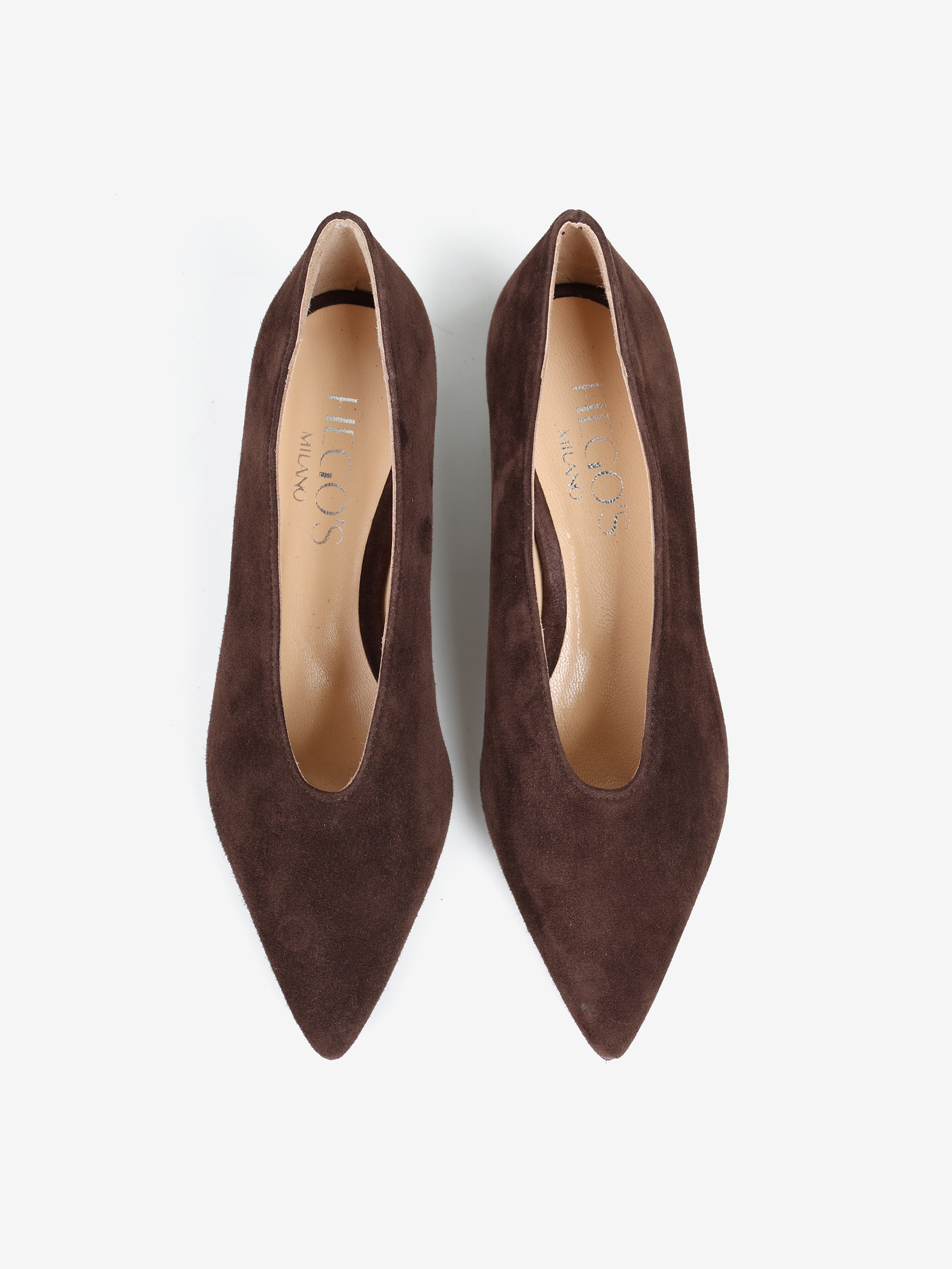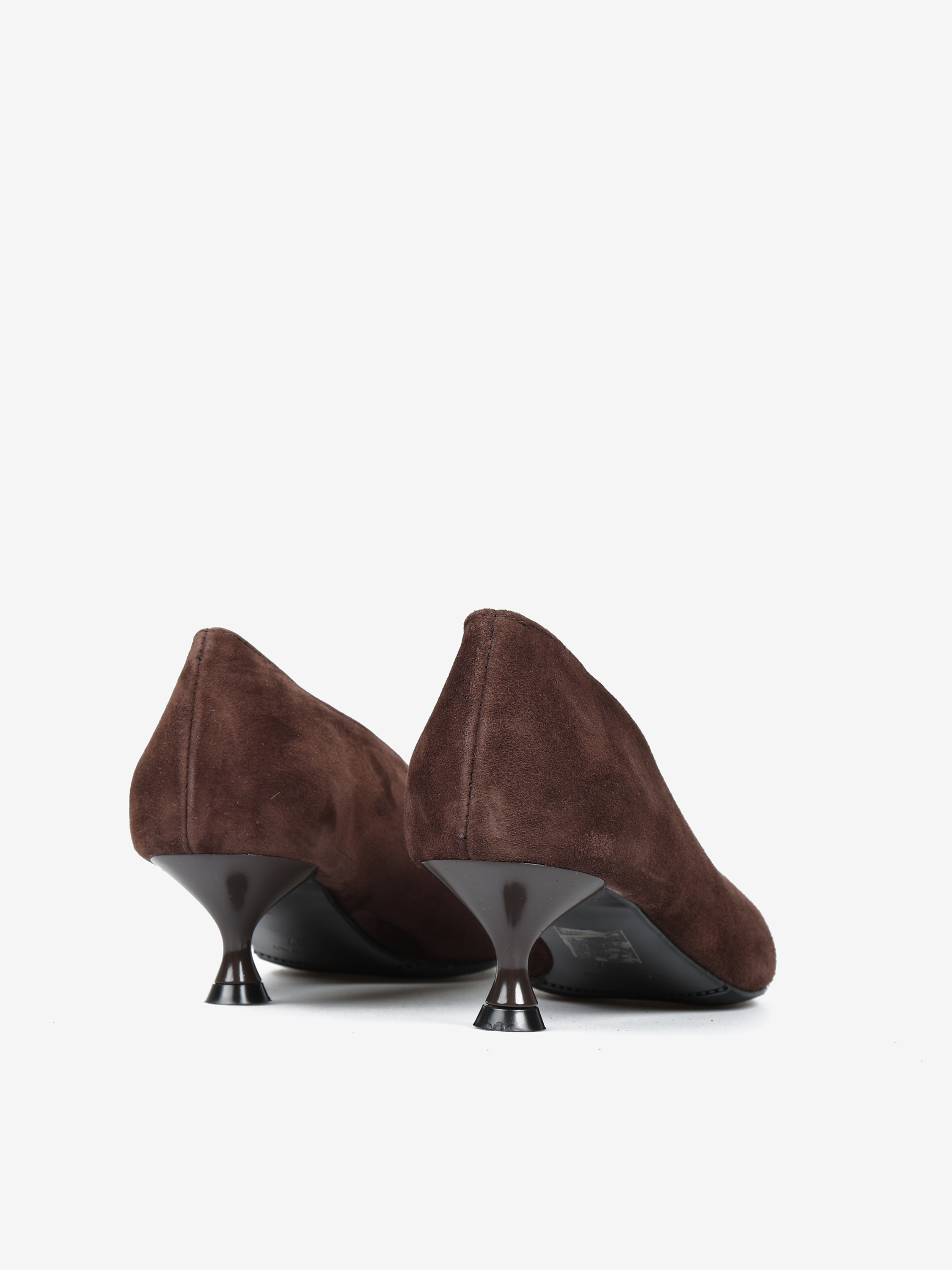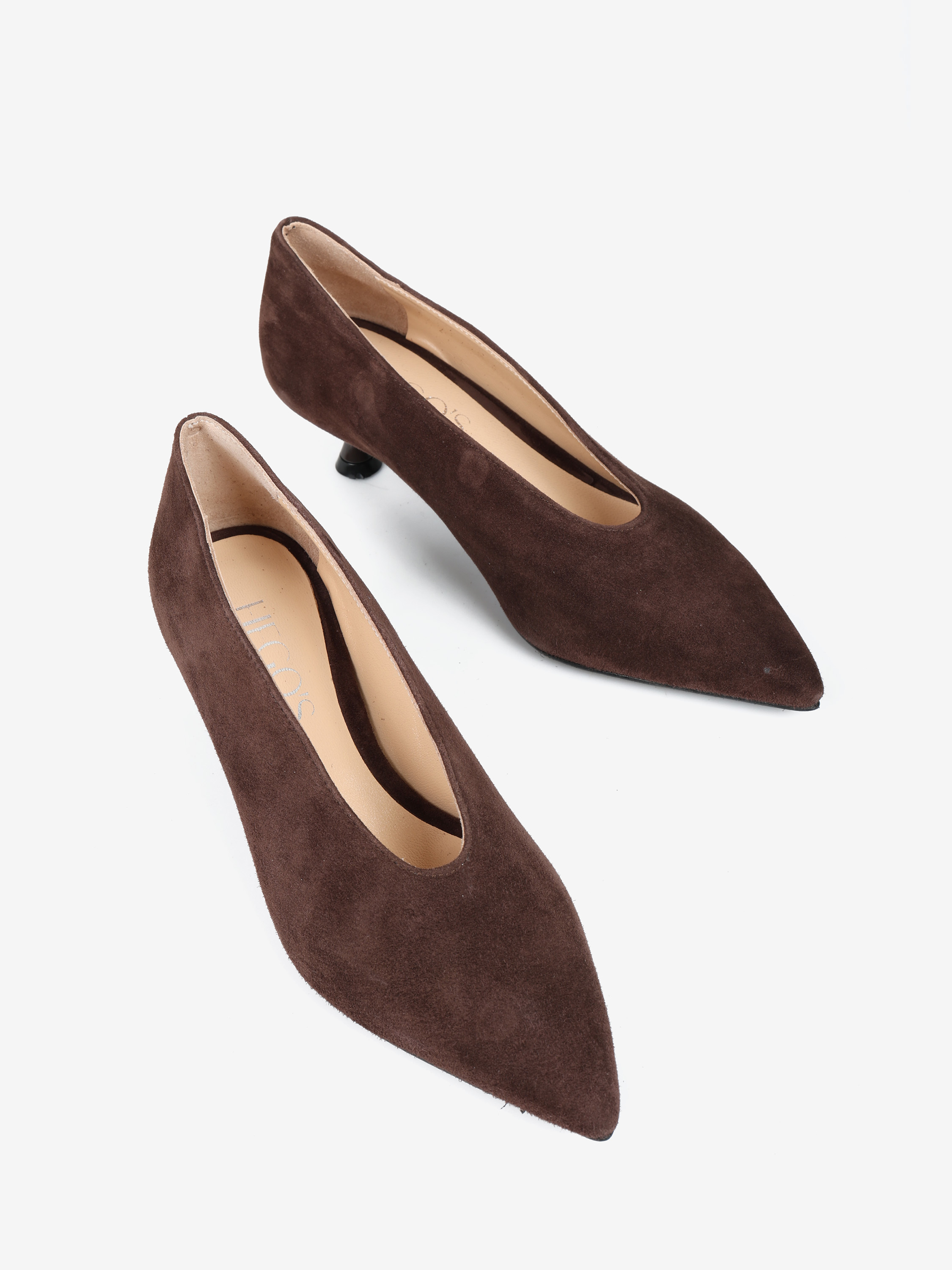 Niskie szpilki wykonane z brązowego zamszu. Noski w szpic i owalne wycięcia z zabudowanymi brzegami.