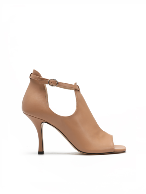 Szpilki z odkrytymi palcami to Trend sezonu. Cholewka w beżowym kolorze wykonana jest z naturalnej skóry. Charakterystyczne wycięcia cholewki wyróżniają ten model. Przy kostce zapinana regulowanym paskiem na sprzączkę. Model osadzony na stabilnym obcasie na szpilce.
