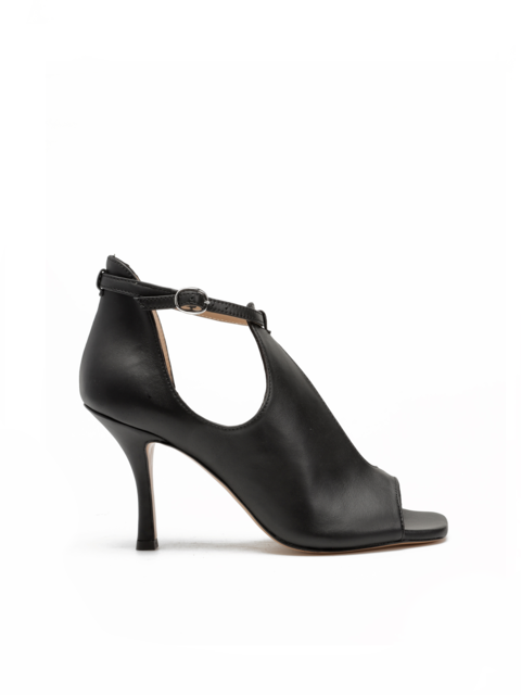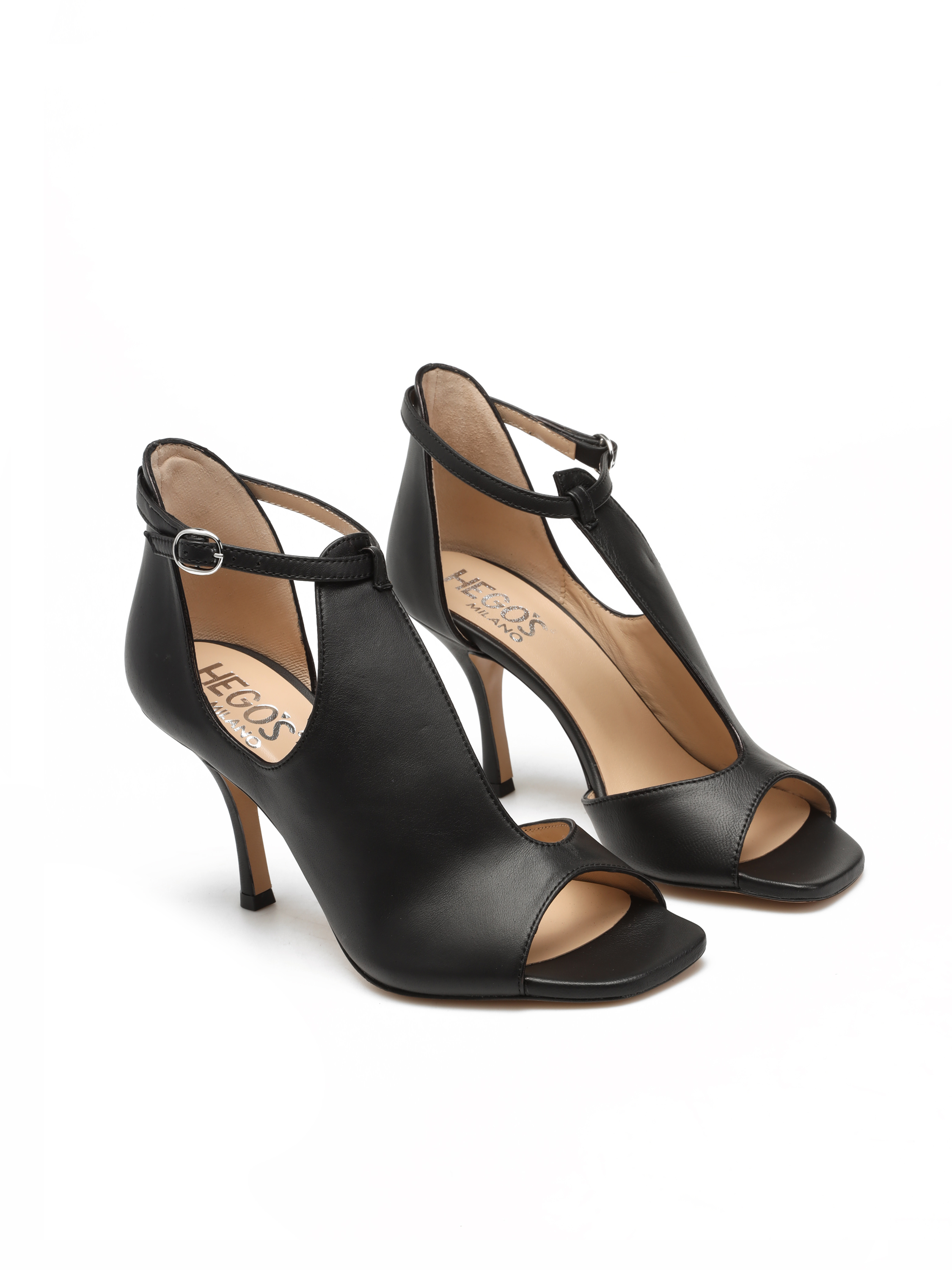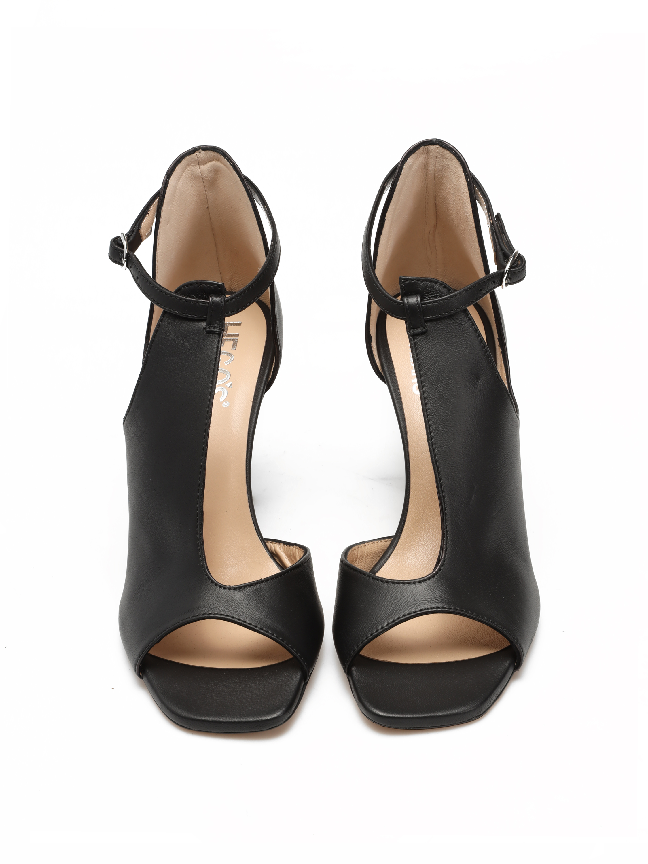 Szpilki z odkrytymi palcami to Trend sezonu. Cholewka w klasycznym, czarnym kolorze wykonana jest z naturalnej skóry. Charakterystyczne wycięcia cholewki wyróżniają ten model. Przy kostce zapinana regulowanym paskiem na sprzączkę. Model osadzony na stabilnym obcasie na szpilce.