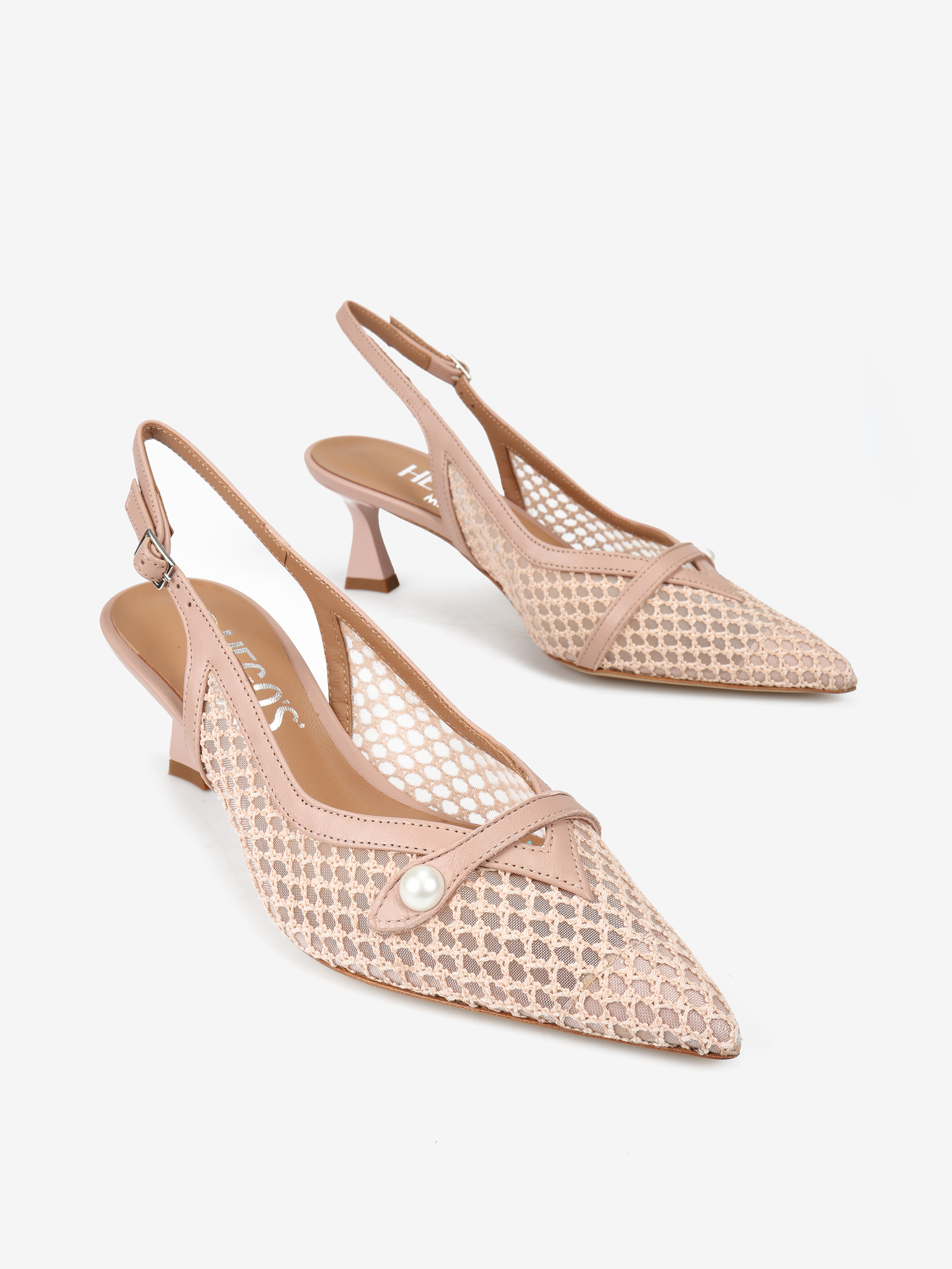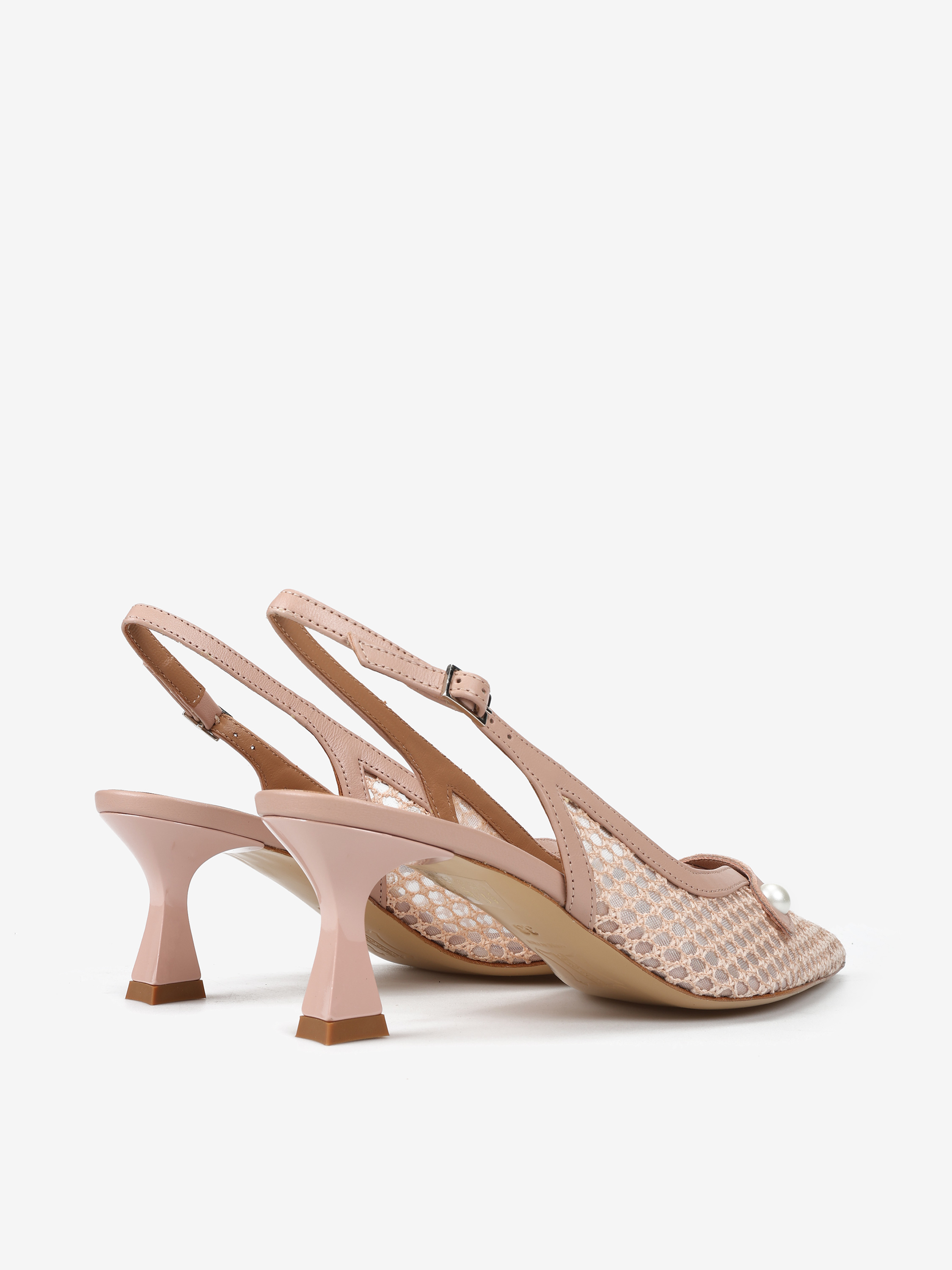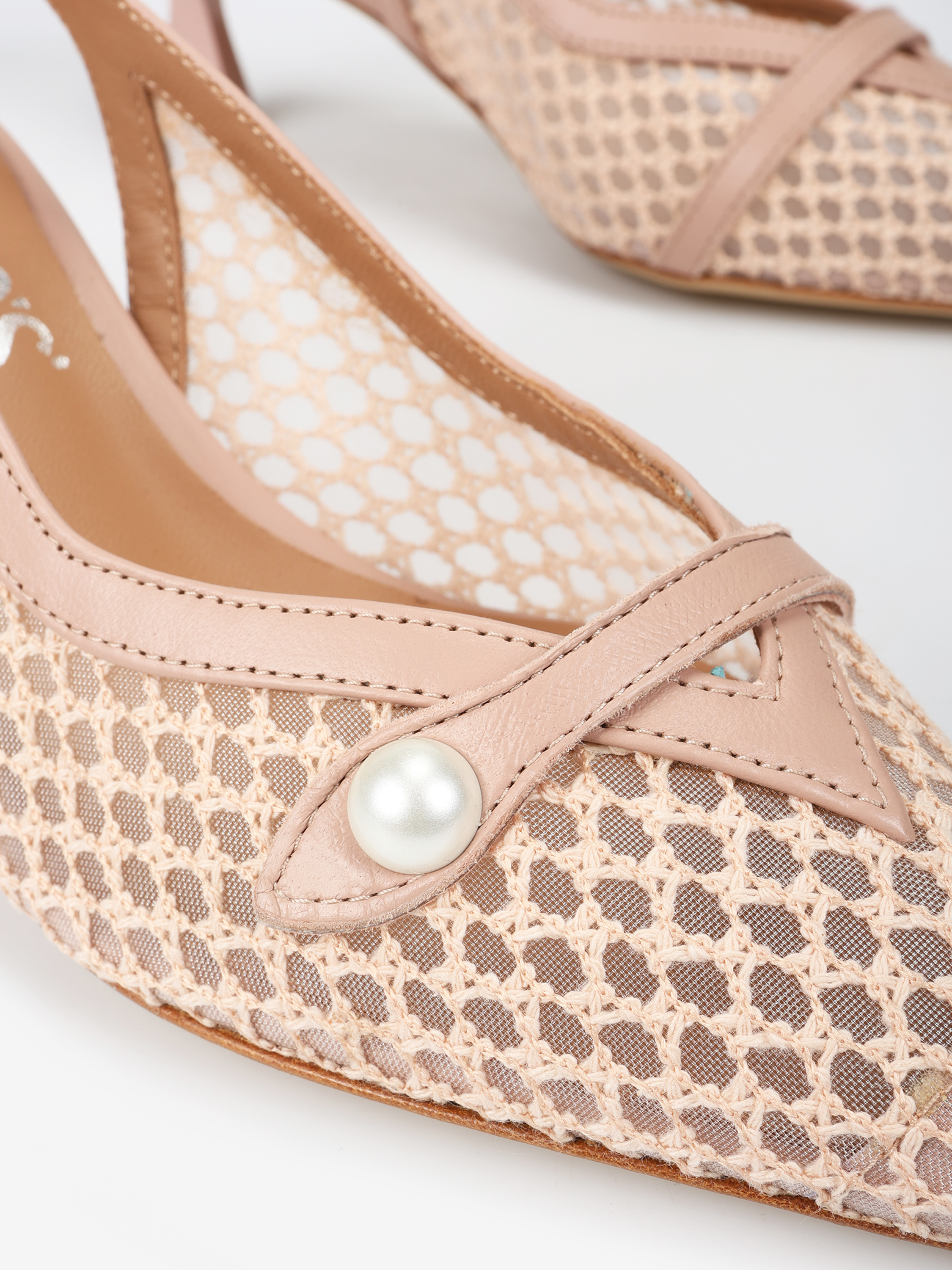 Eleganckie szpilki z przewiewnej siateczki i ozdobnym paskiem z perłą. Odkryta pięta i nosek w szpic.