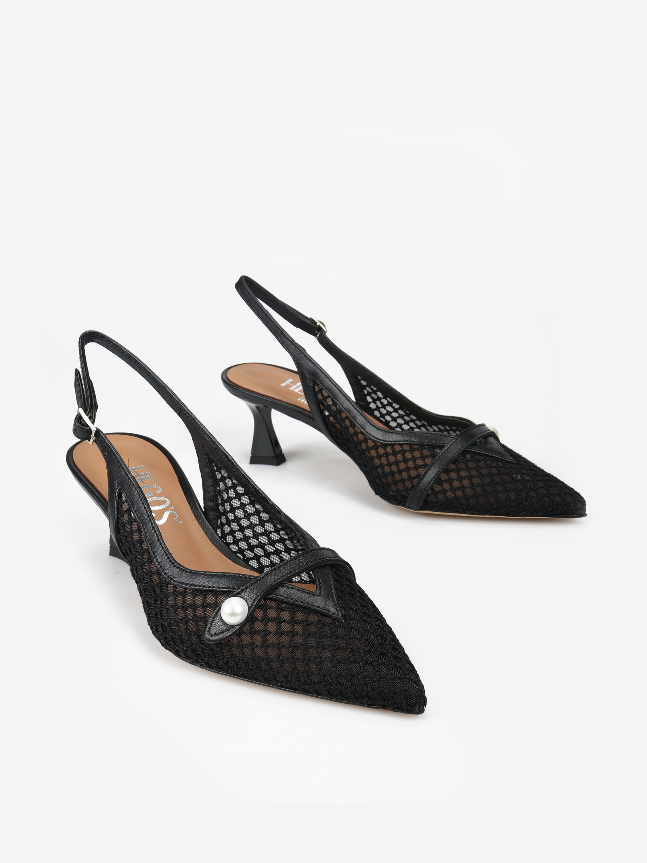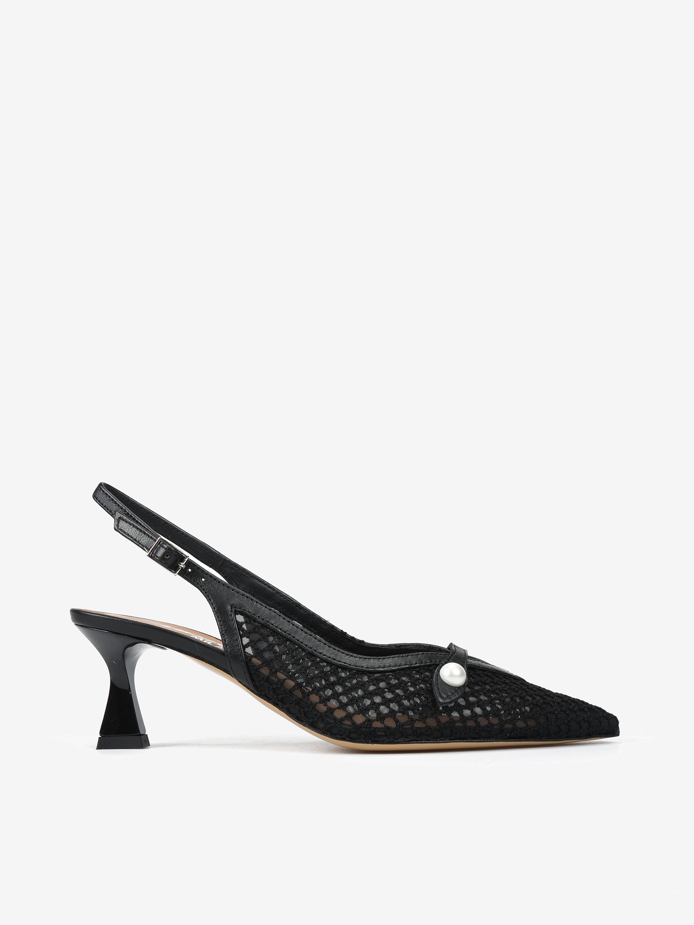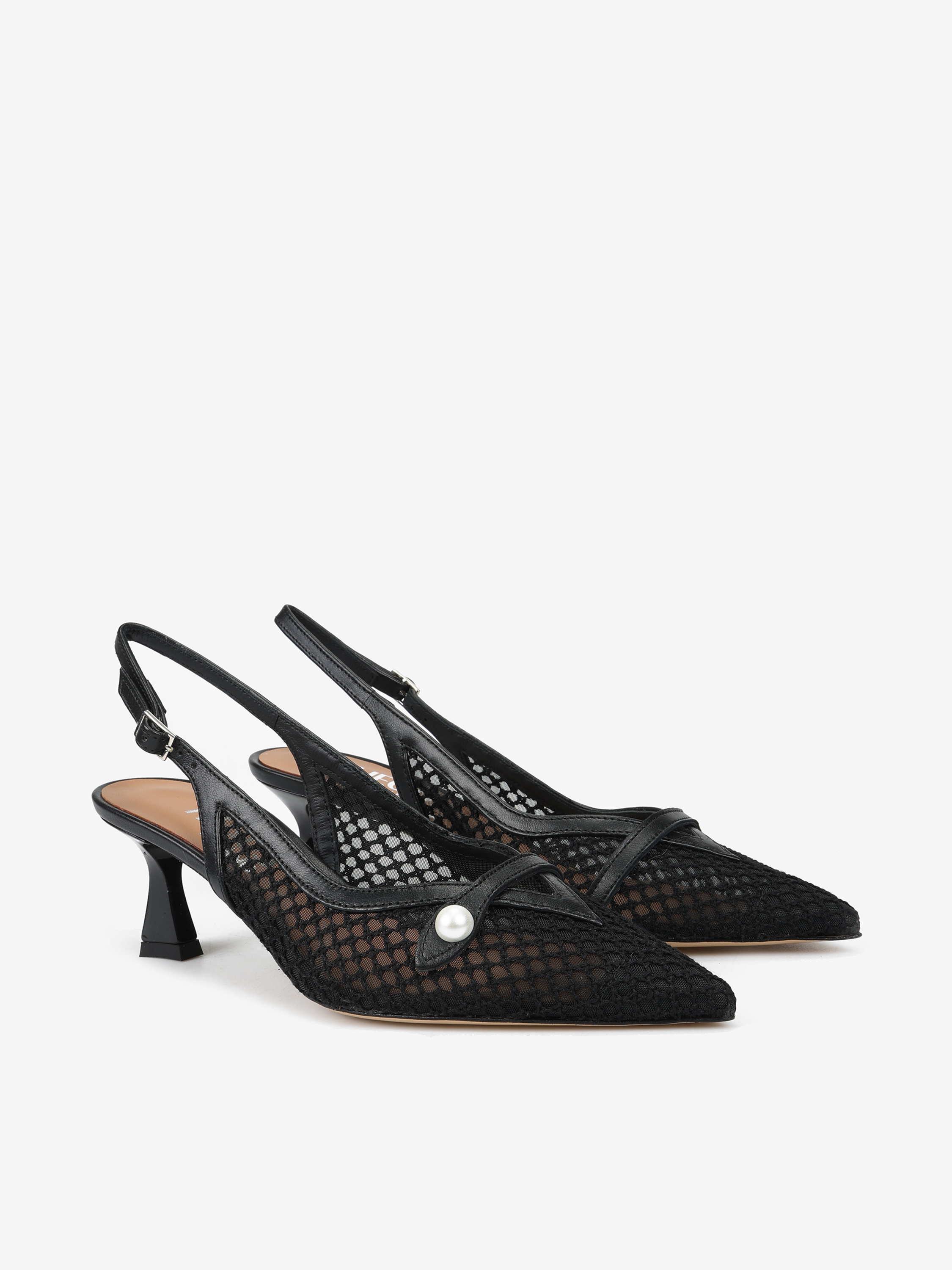 Eleganckie szpilki z przewiewnej siateczki i ozdobnym paskiem z perłą. Odkryta pięta i nosek w szpic.