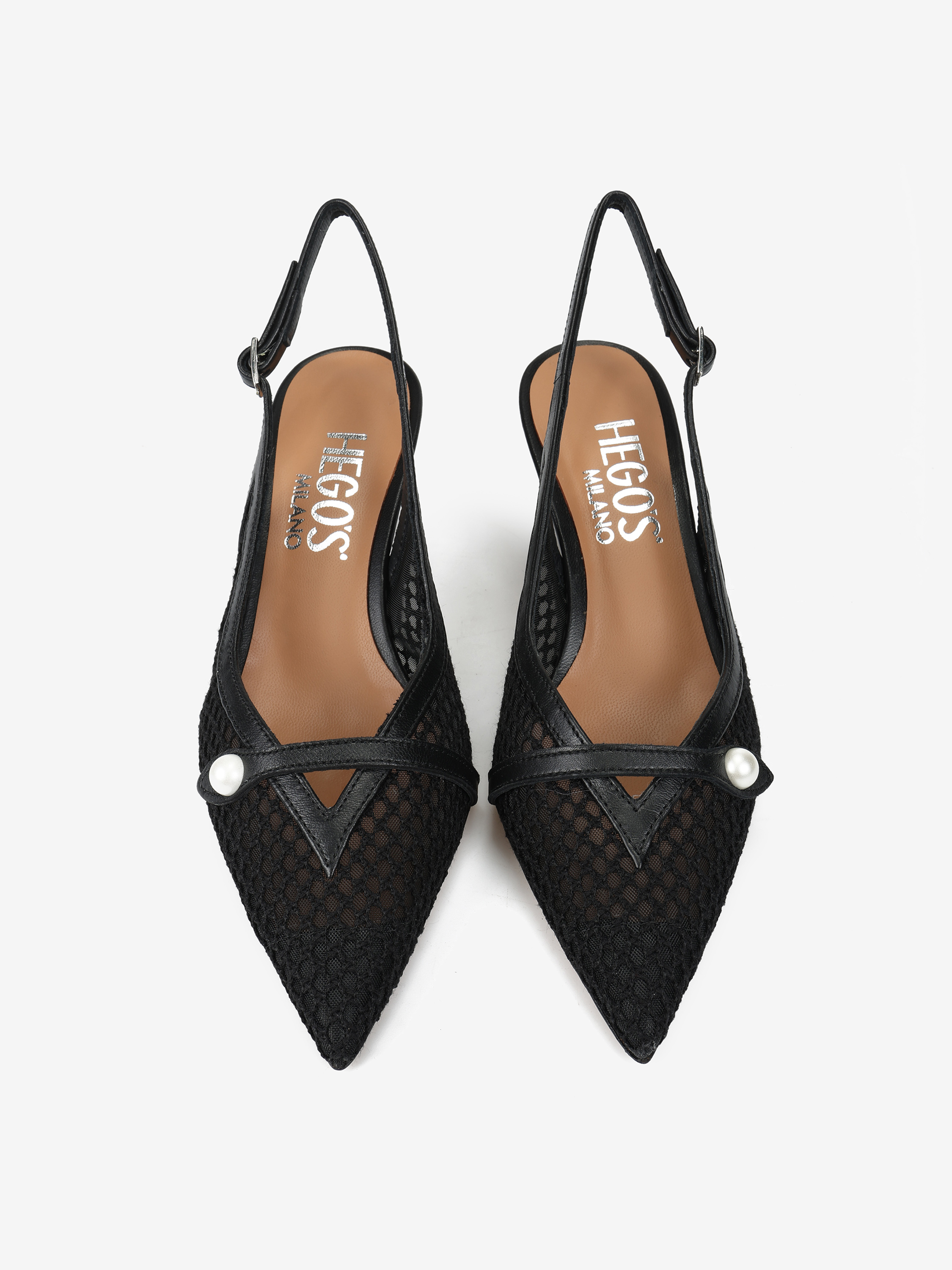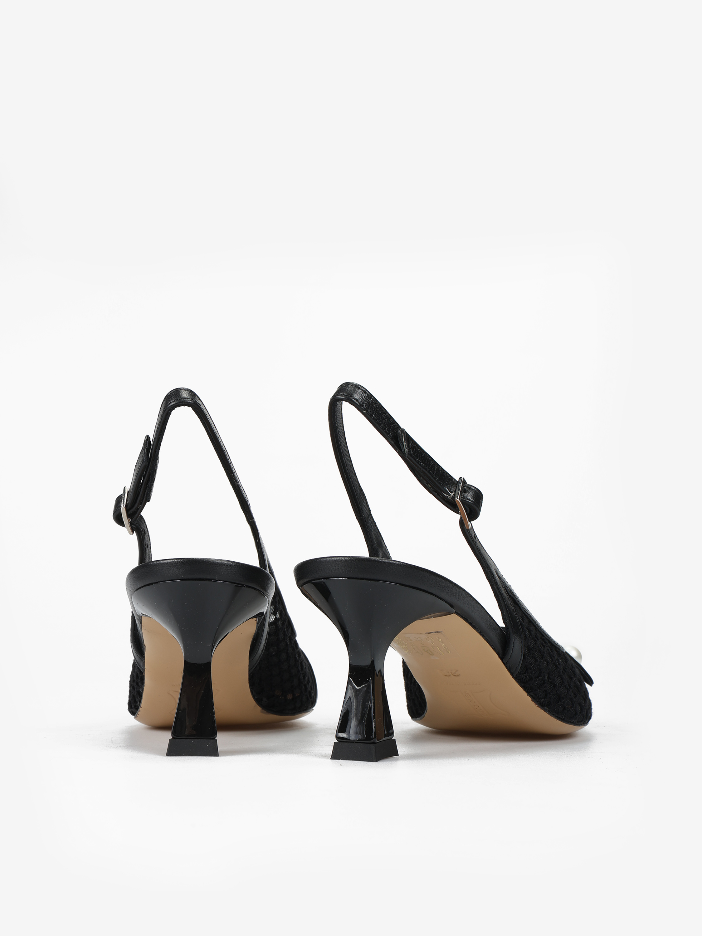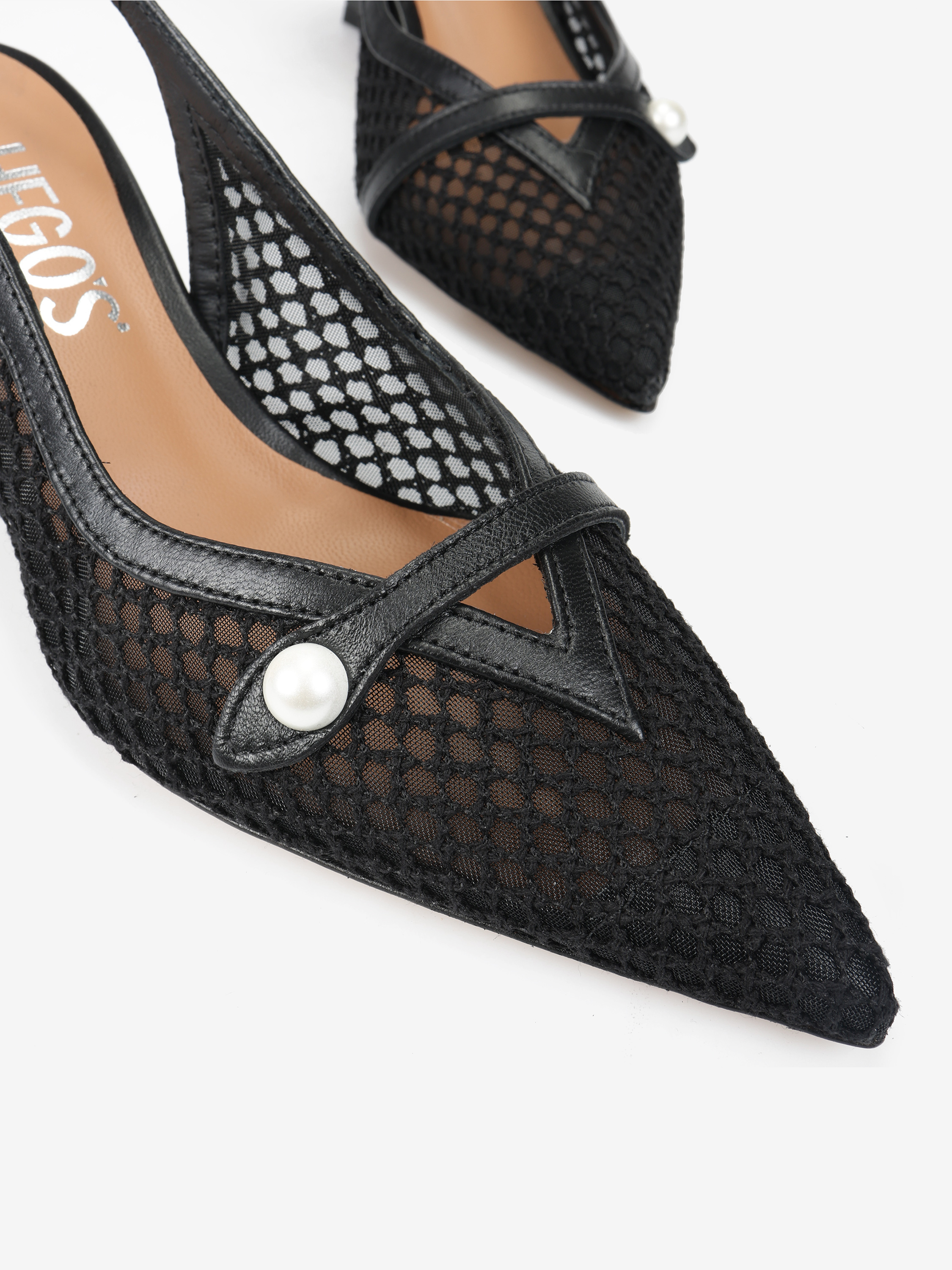Eleganckie szpilki z przewiewnej siateczki i ozdobnym paskiem z perłą. Odkryta pięta i nosek w szpic.