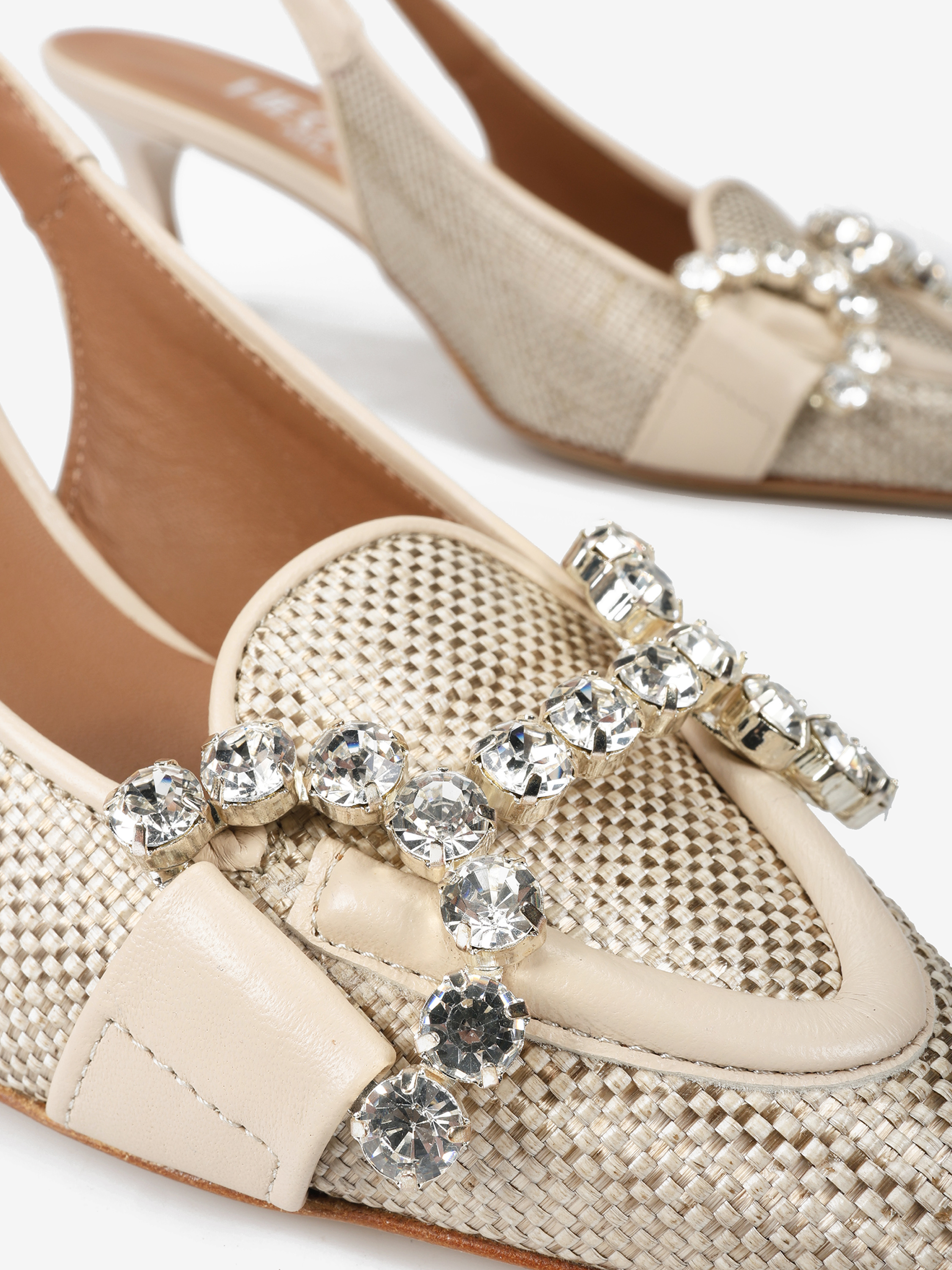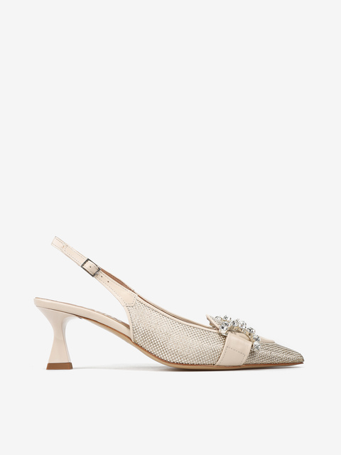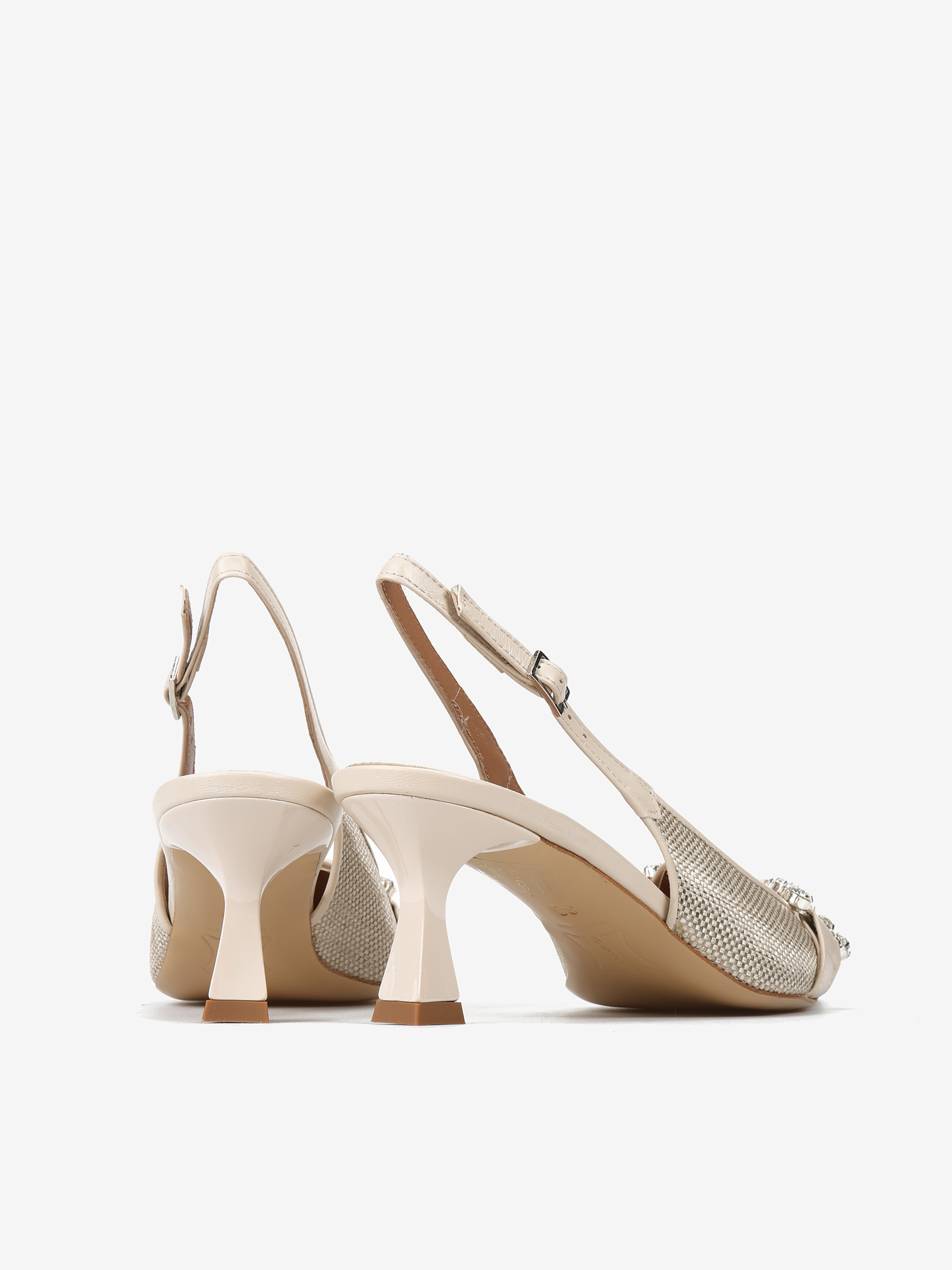 Eleganckie tweedowe szpilki z noskiem w szpic i ozdobną aplikacją. Odkryta pięta z regulowanym paskiem.