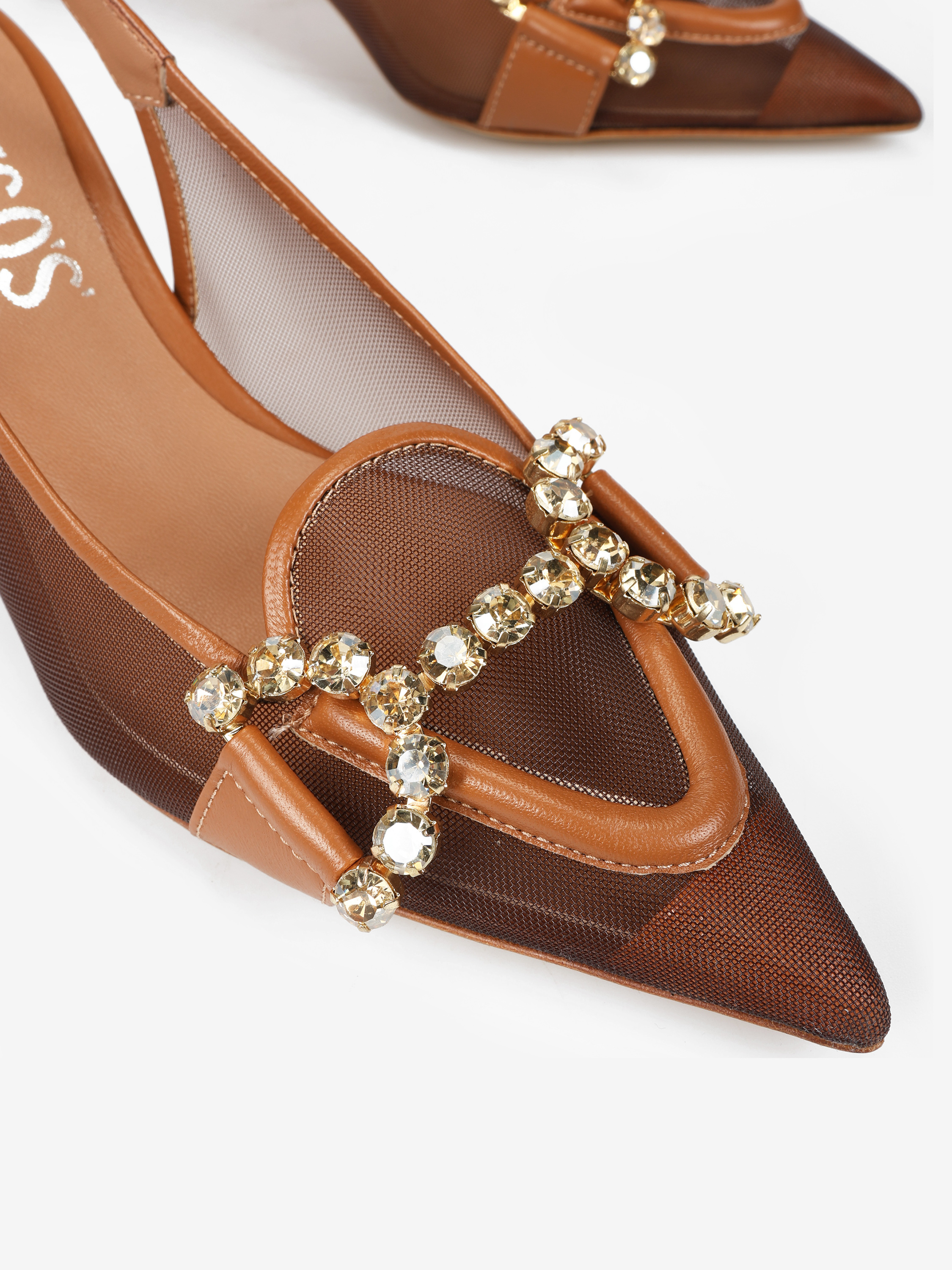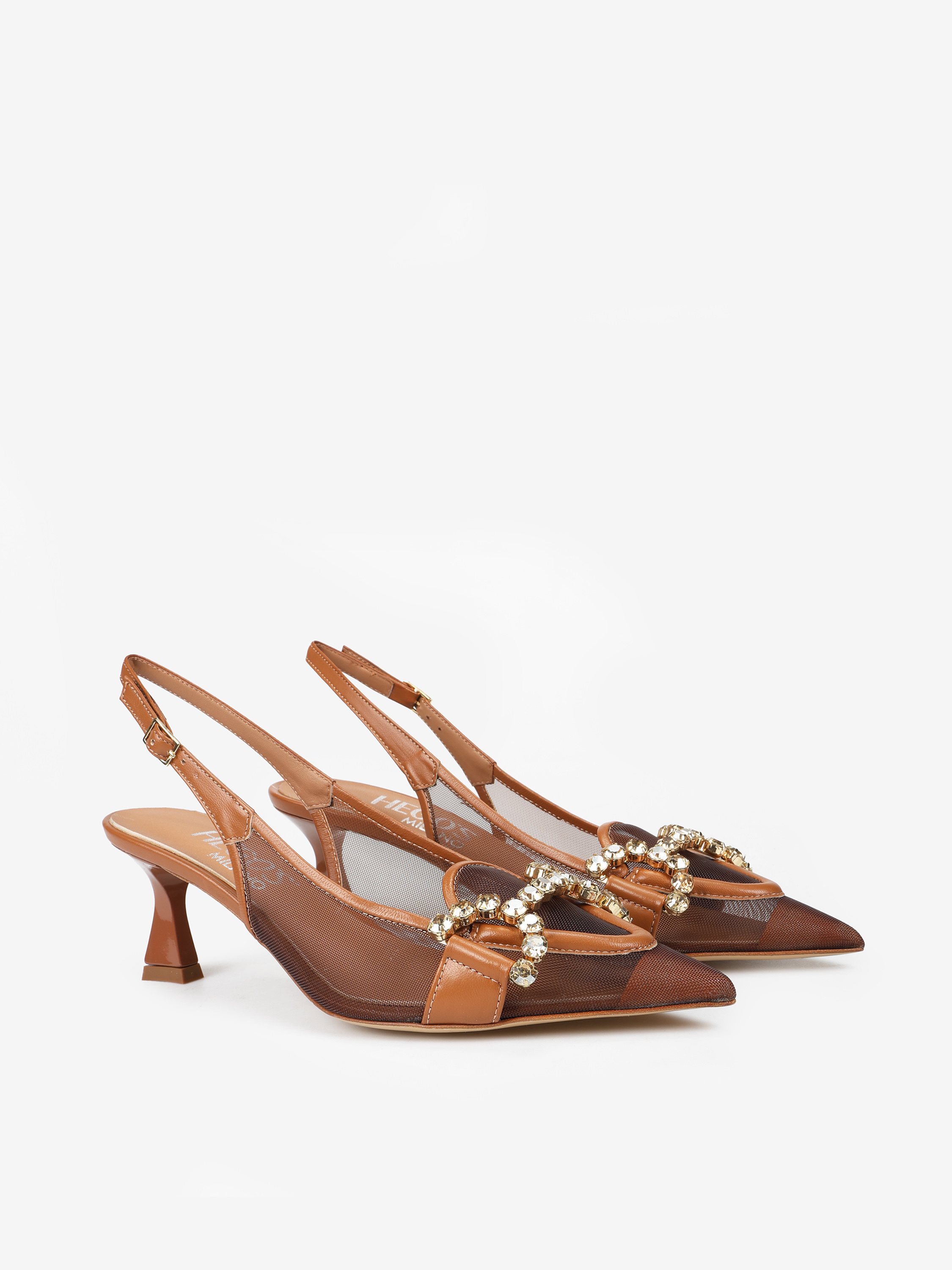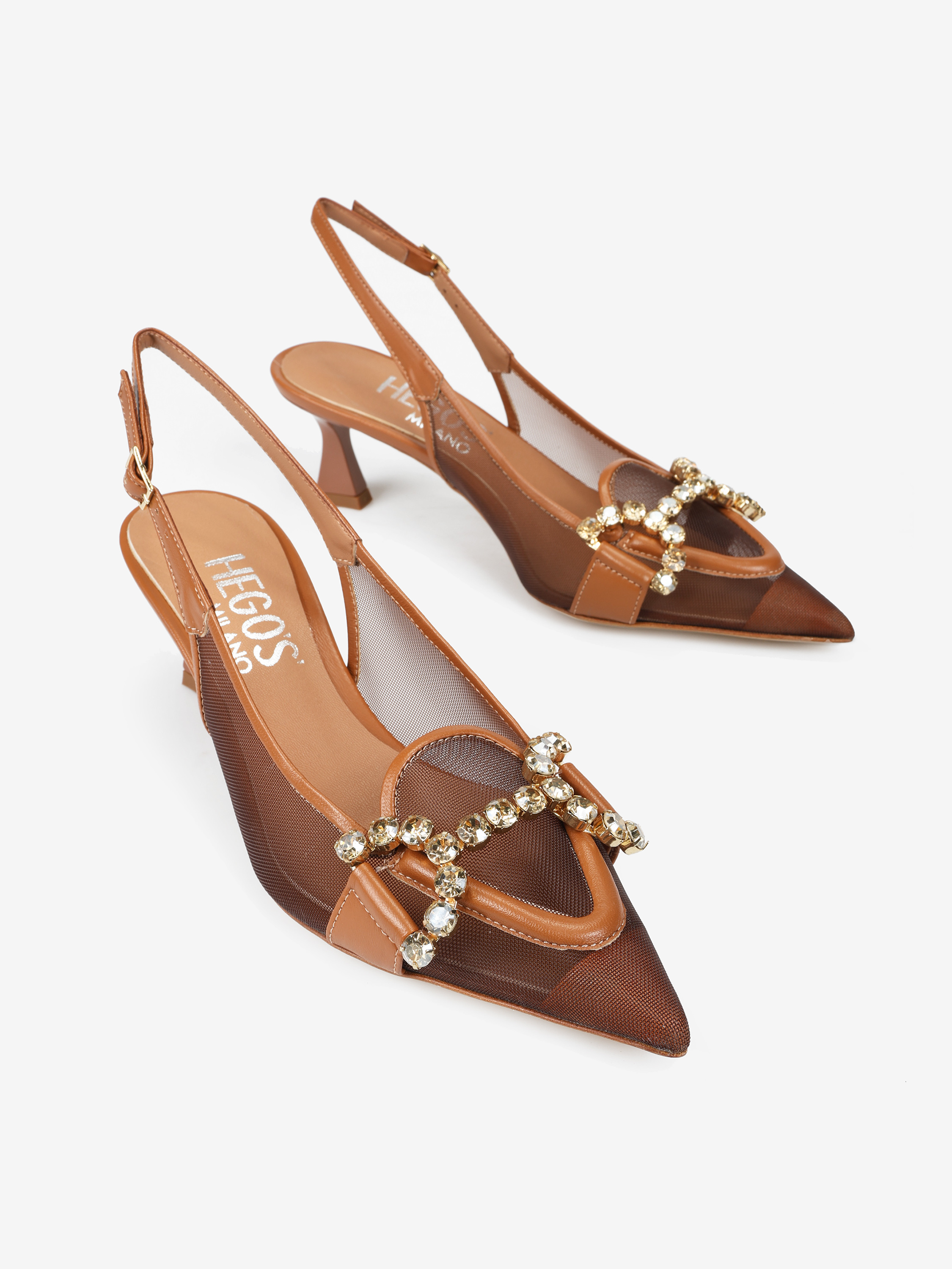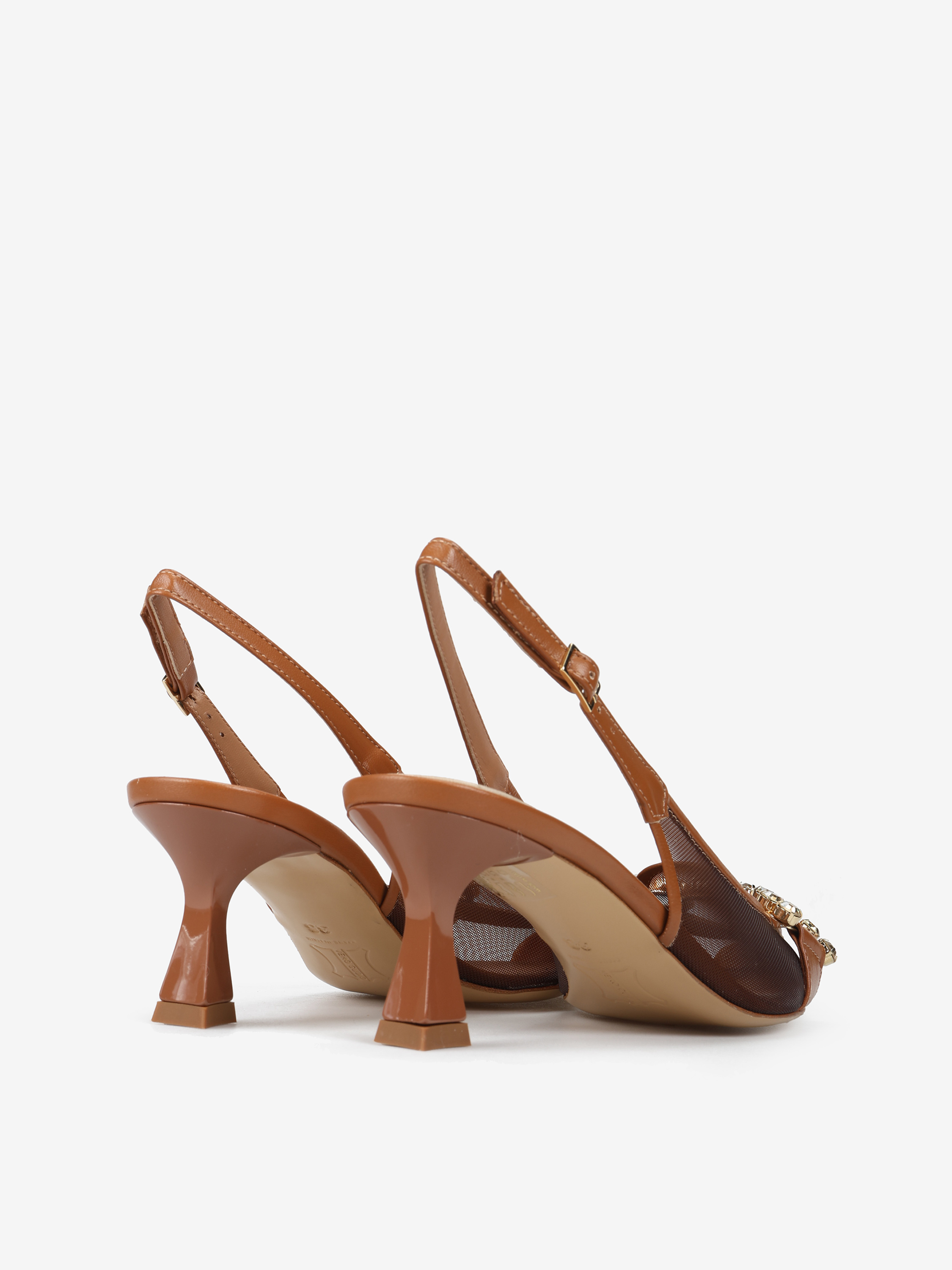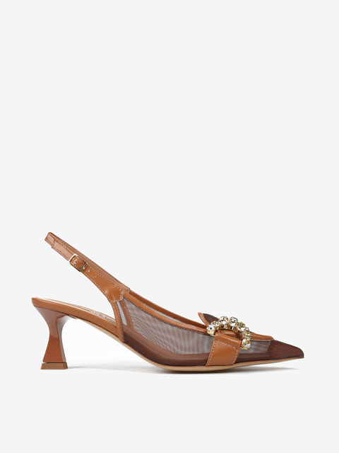 Eleganckie szpilki wykonane ze skóry i przewiewnej siateczki, z noskiem w szpic i ozdobną aplikacją. Odkryta pięta z regulowanym paskiem.