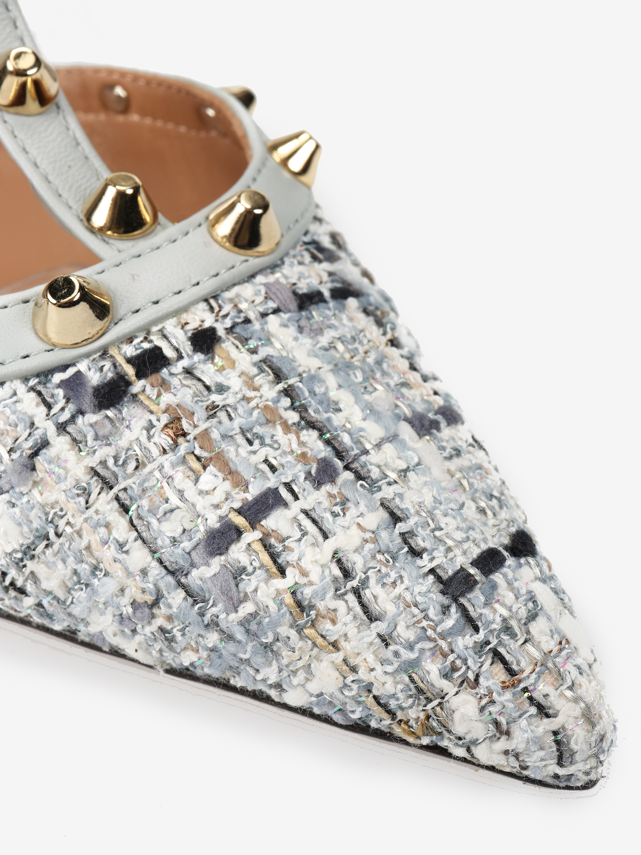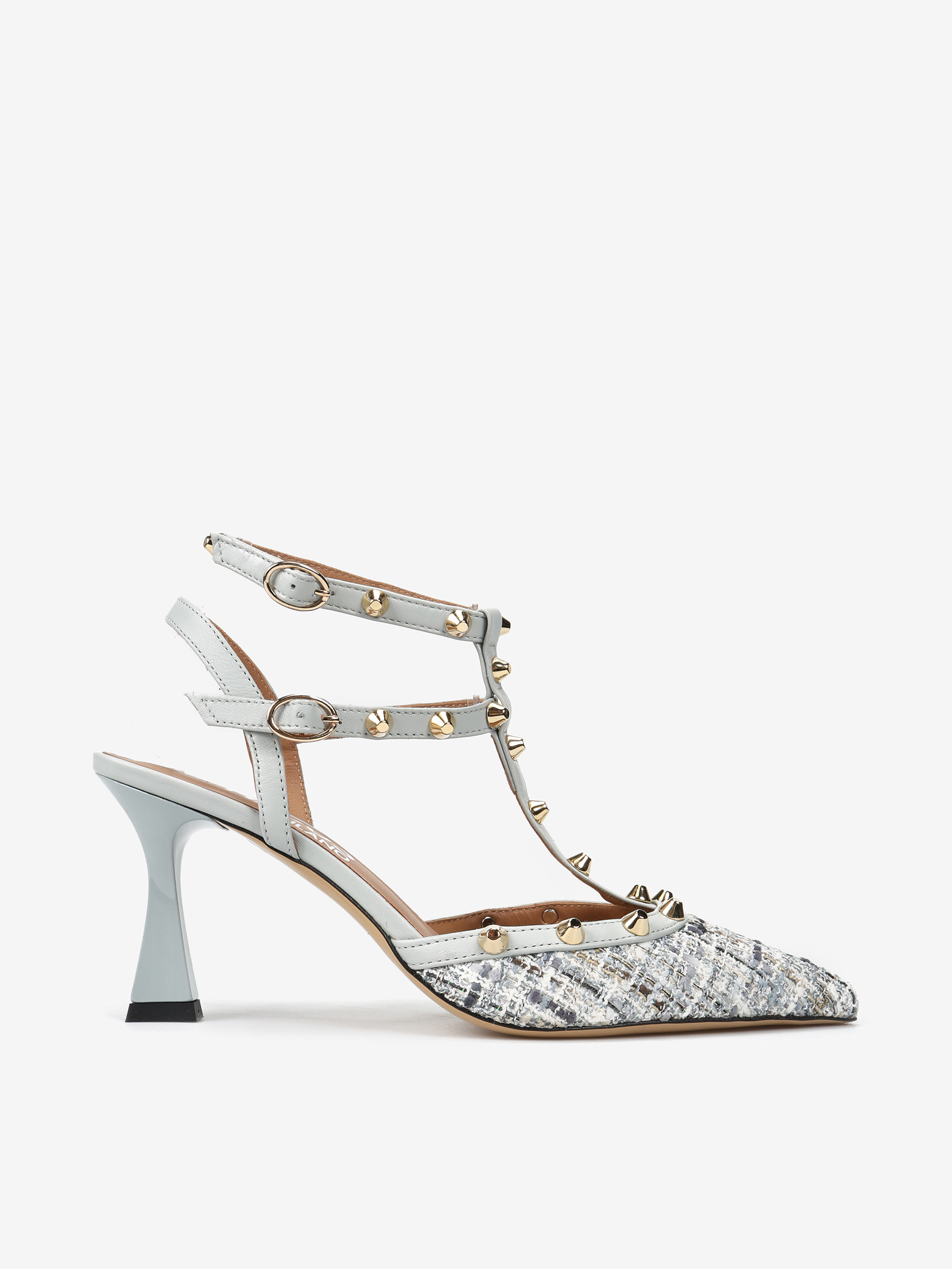 Eleganckie szpilki z błękitnej skóry z ozdobnymi paseczkami i ćwiekami. Nosek w szpic z plecionego materiału.