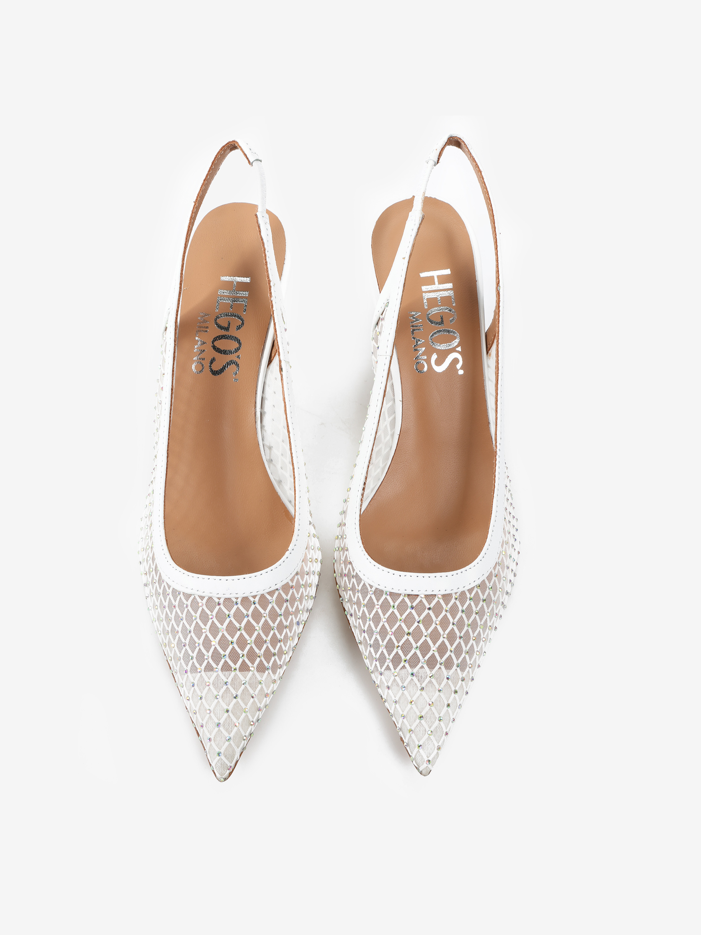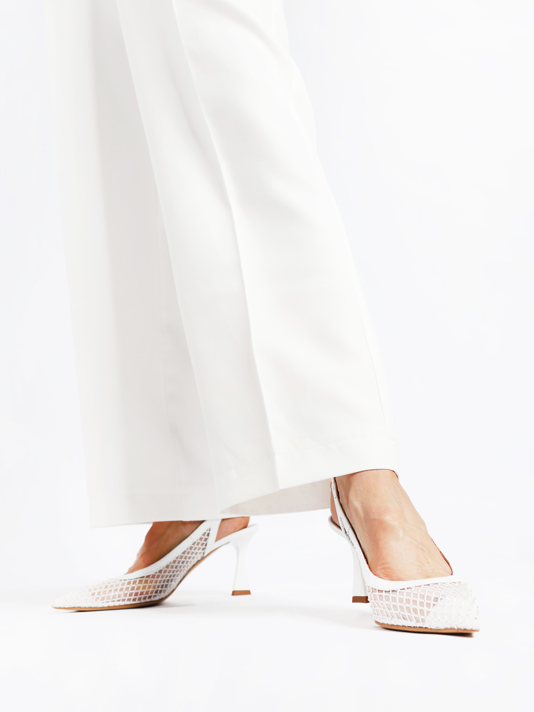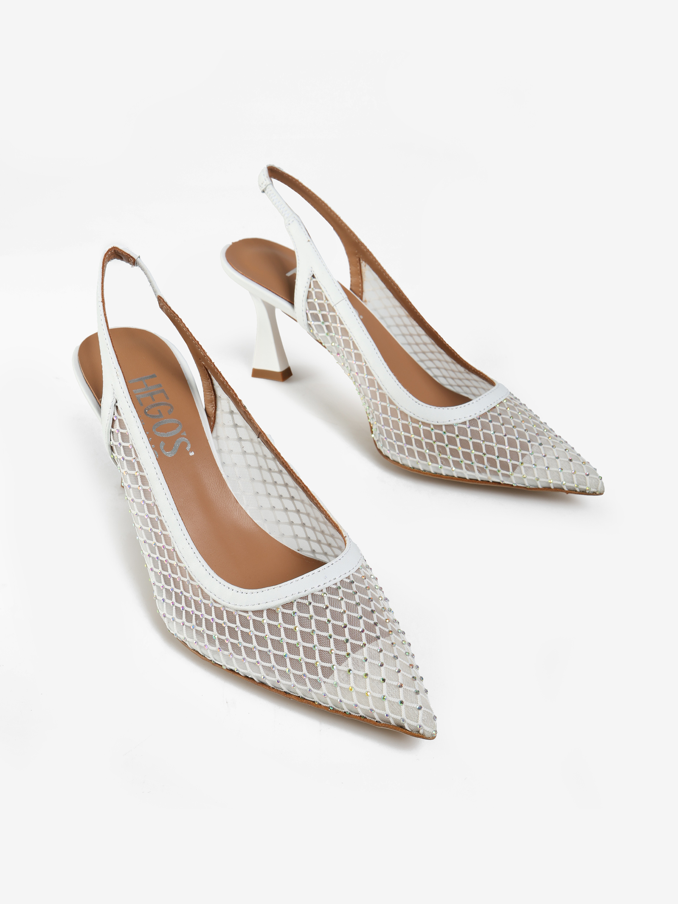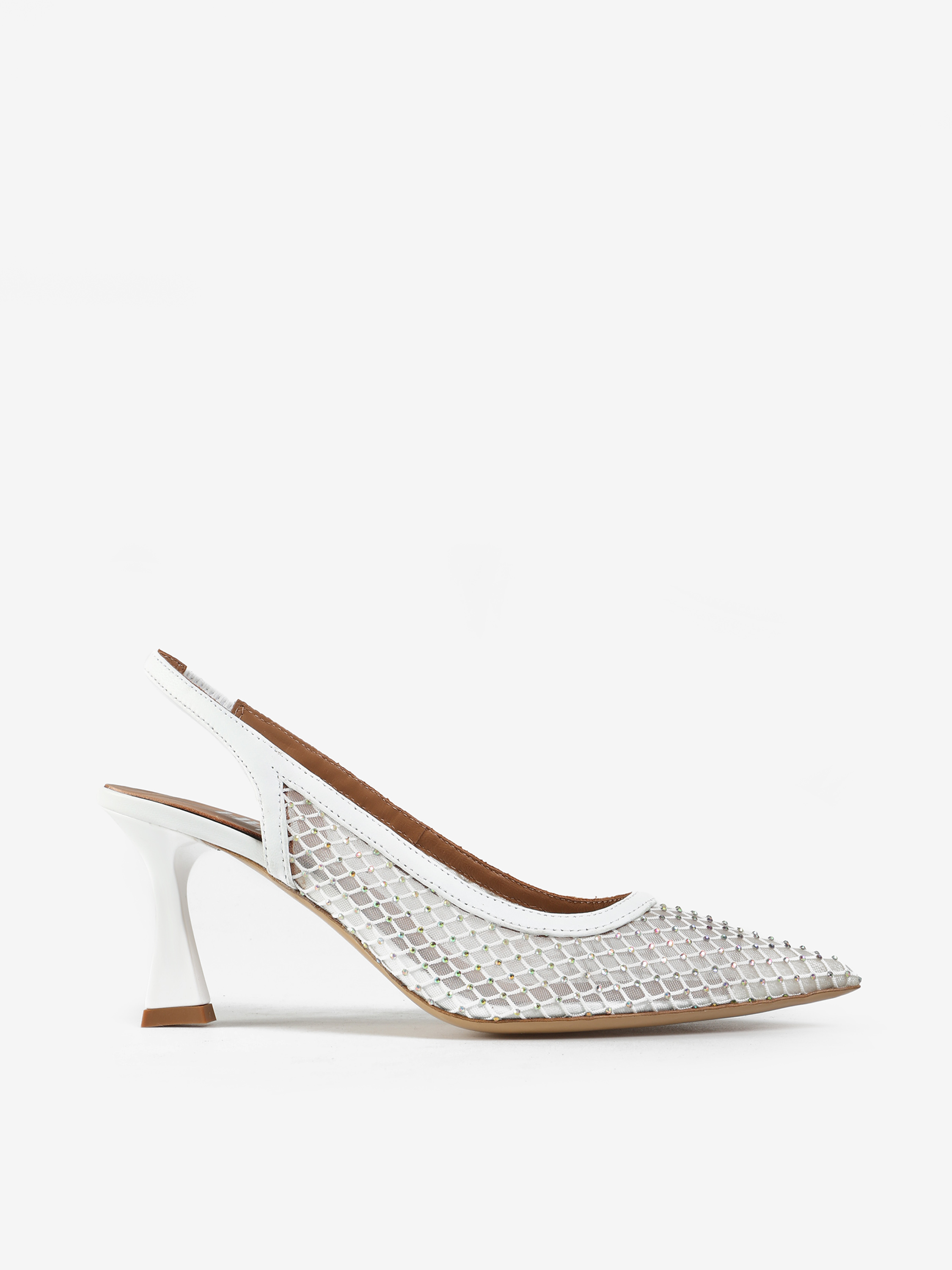 Eleganckie szpilki z noskiem w szpic, wykonane ze skóry i przewiewnej siateczki z drobnymi kamyczkami. Odkryta pięta z paskiem dopasowującym się do stopy.