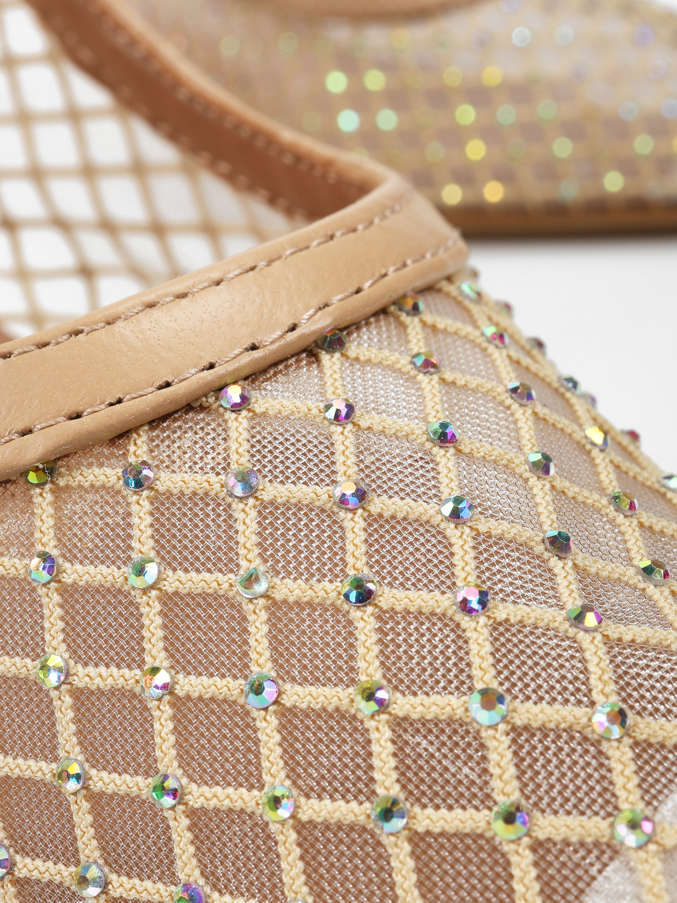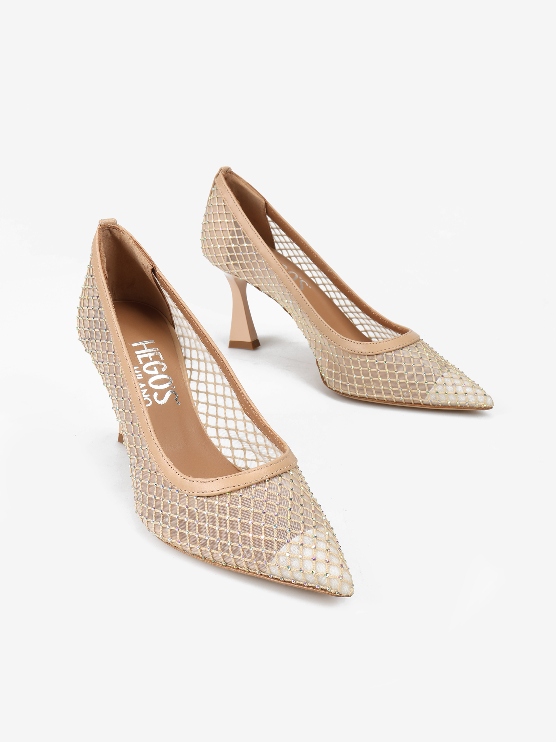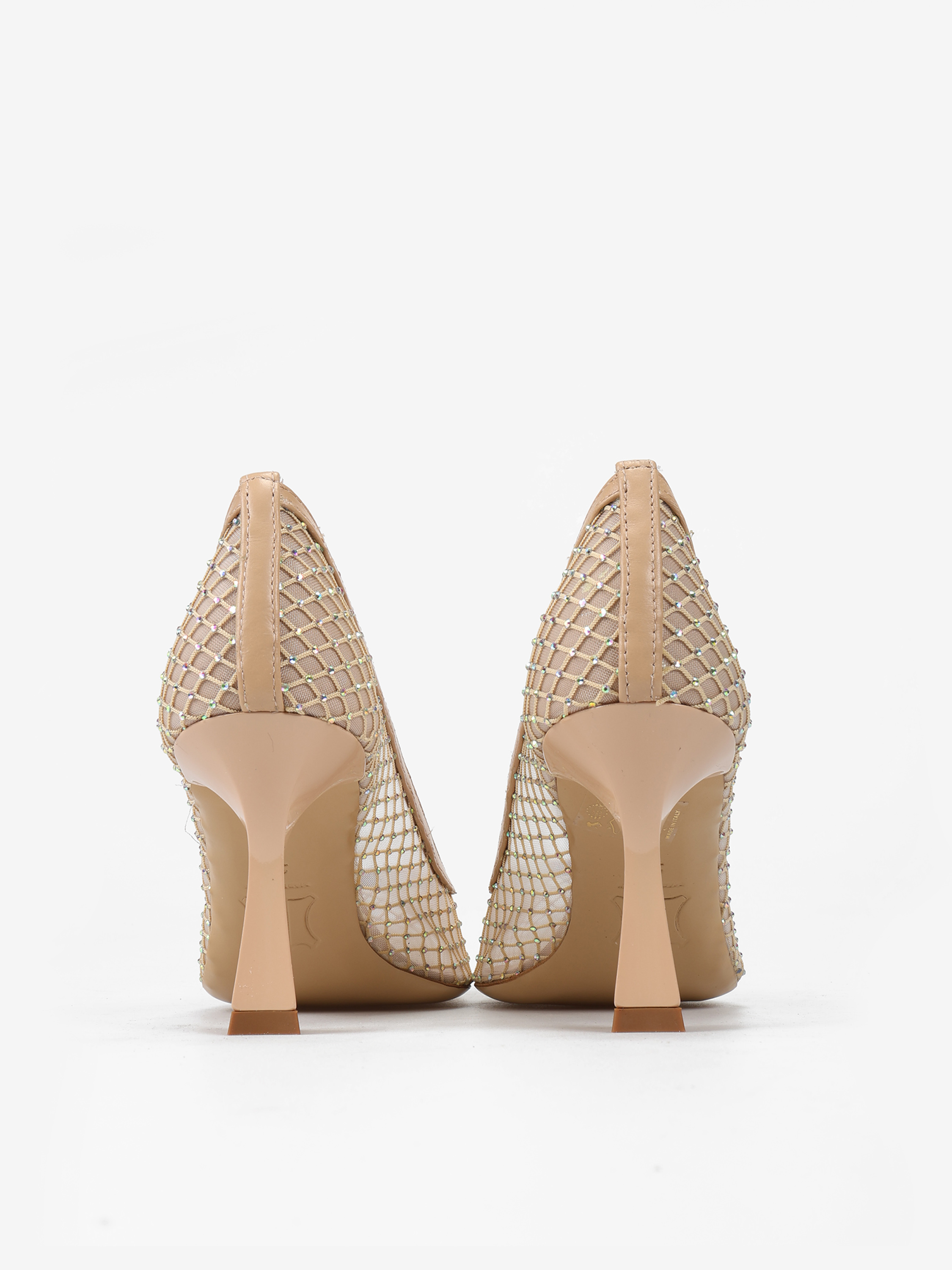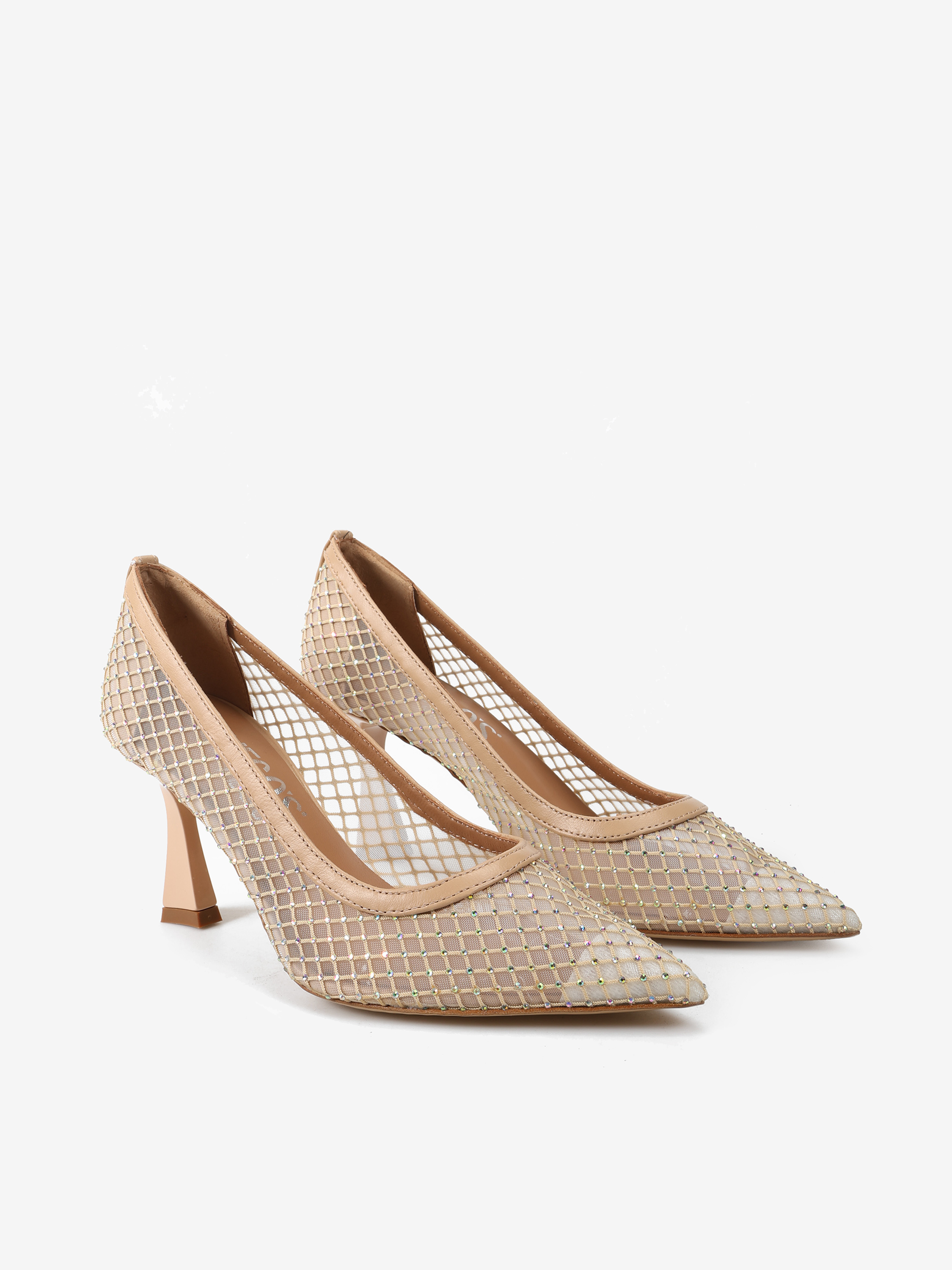 Eleganckie szpilki z noskiem w szpic, wykonane ze skóry i przewiewnej siateczki z połyskujacymi kamyczkami.