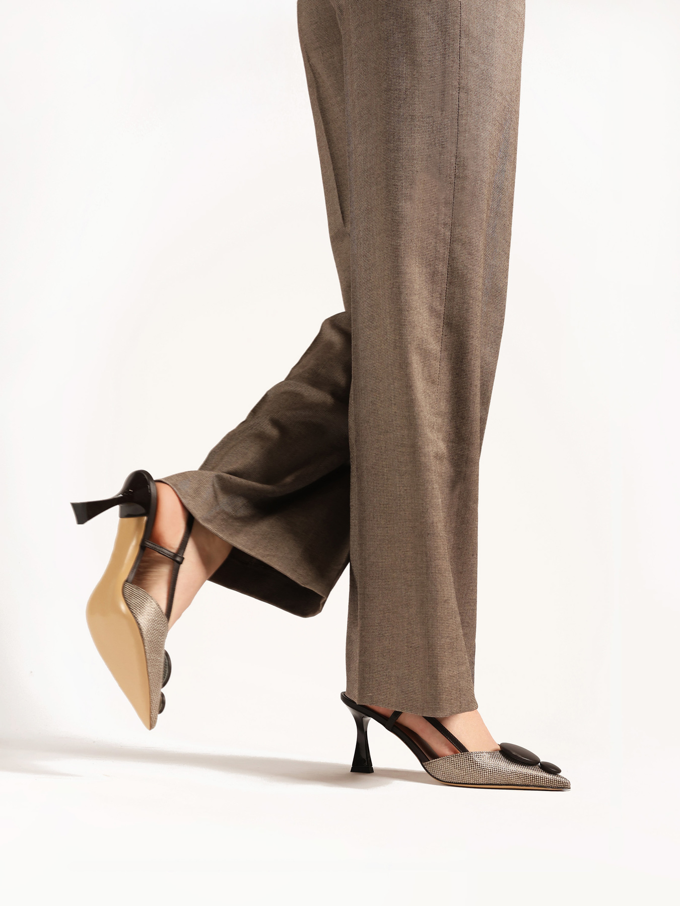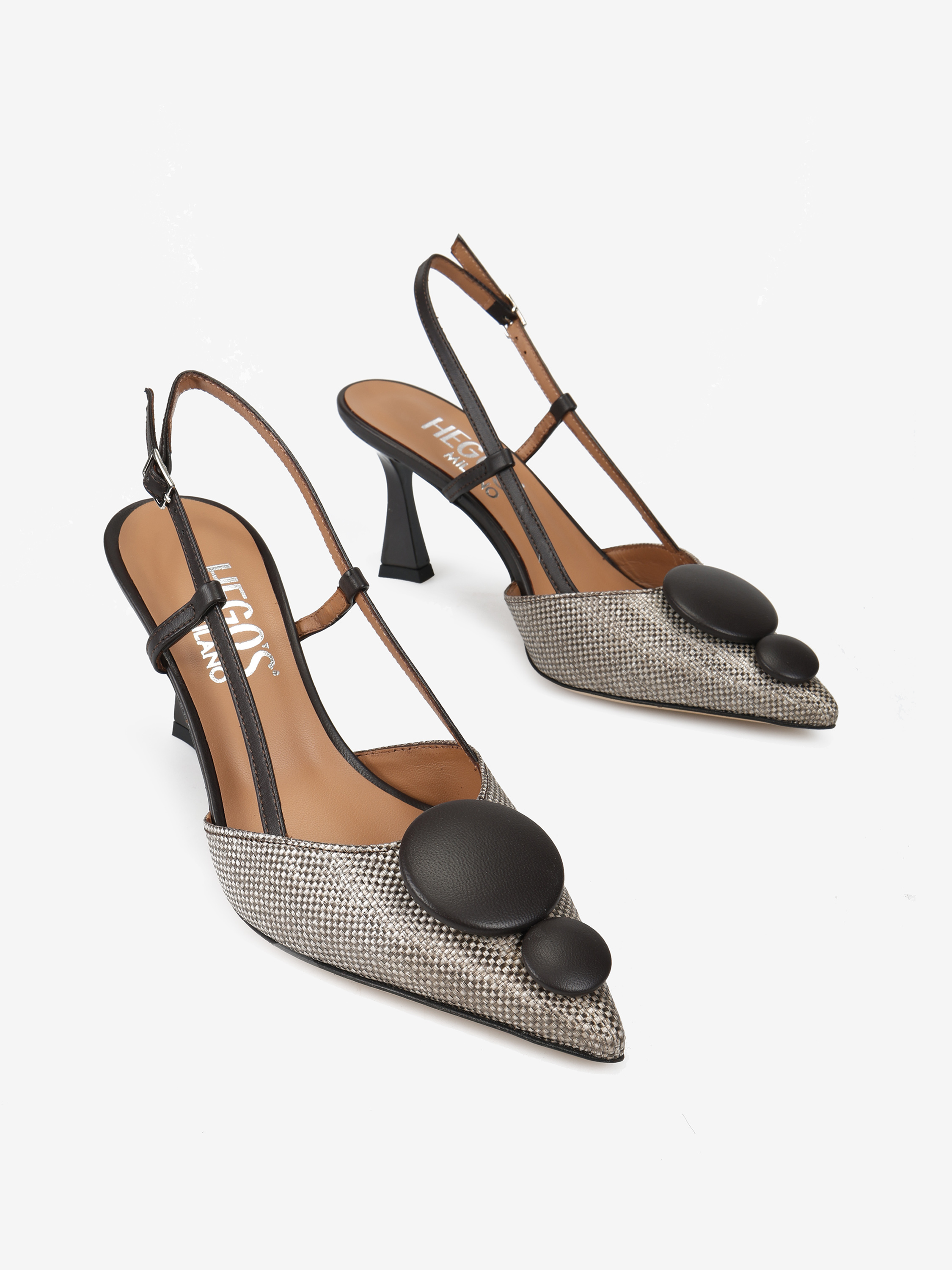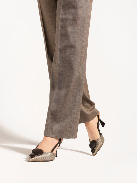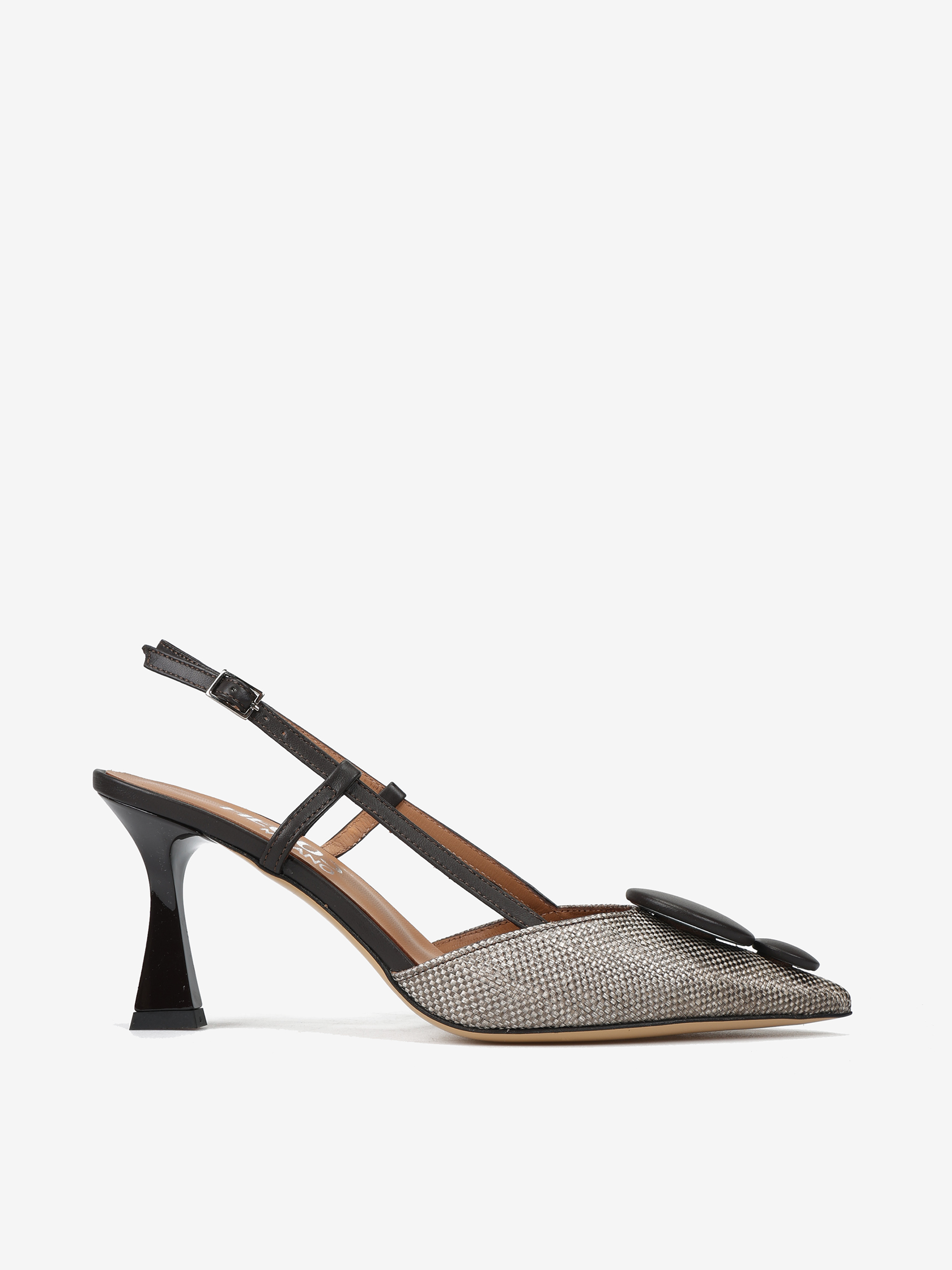 Eleganckie szpilki z tweedowym noskiem w szpic i ozdobną aplikacją. Odkryta pięta z regulowanym paskiem.