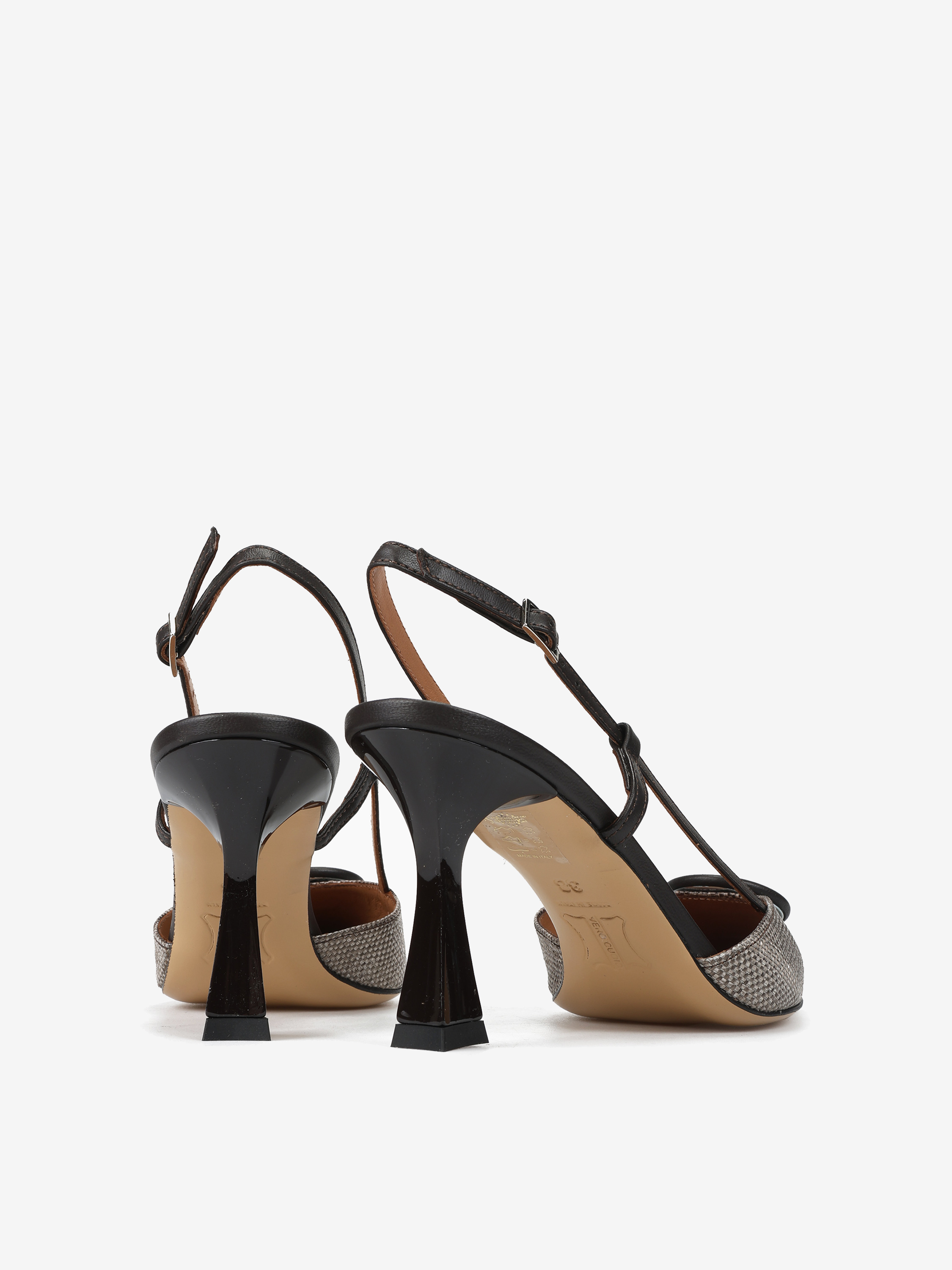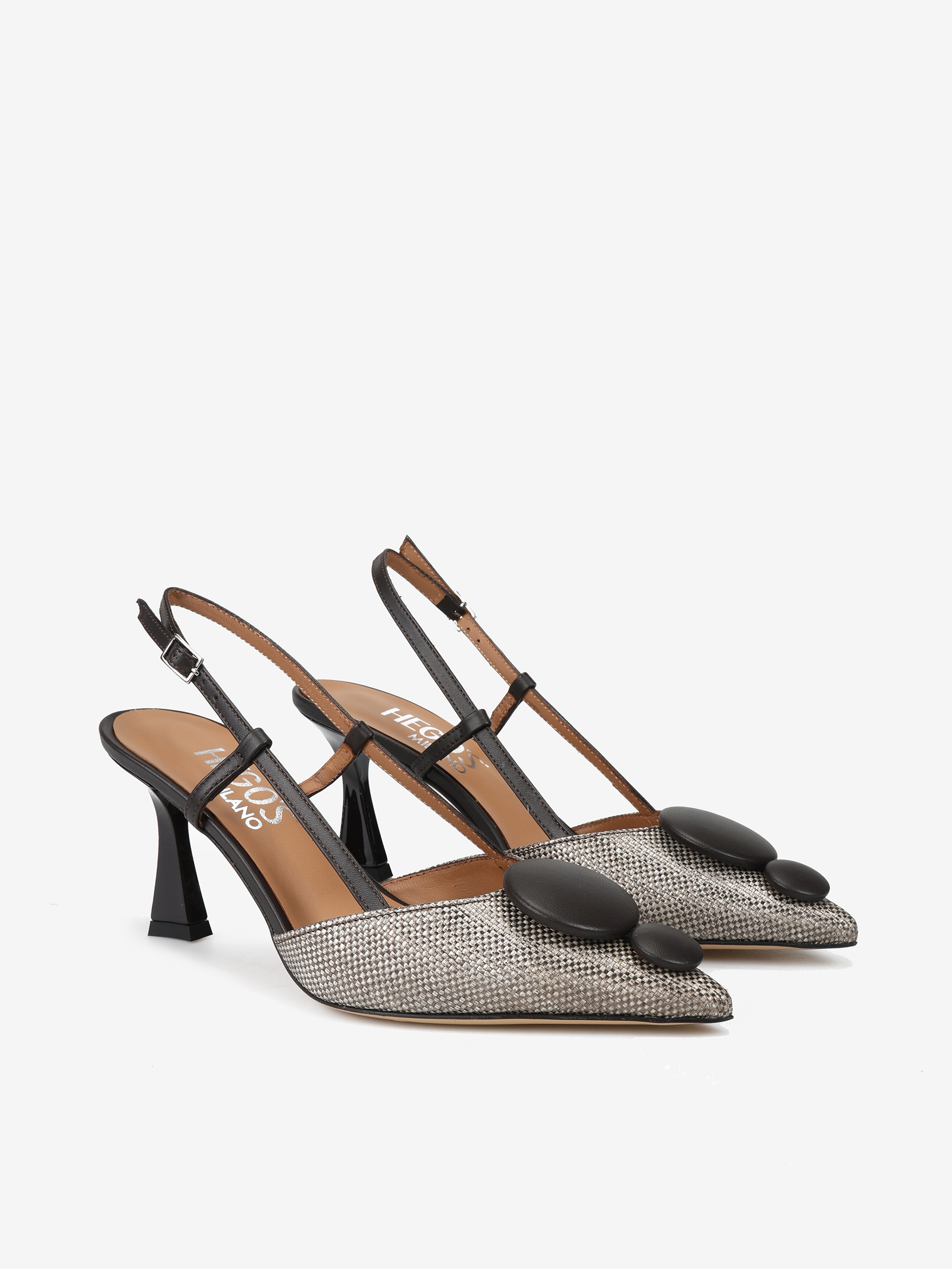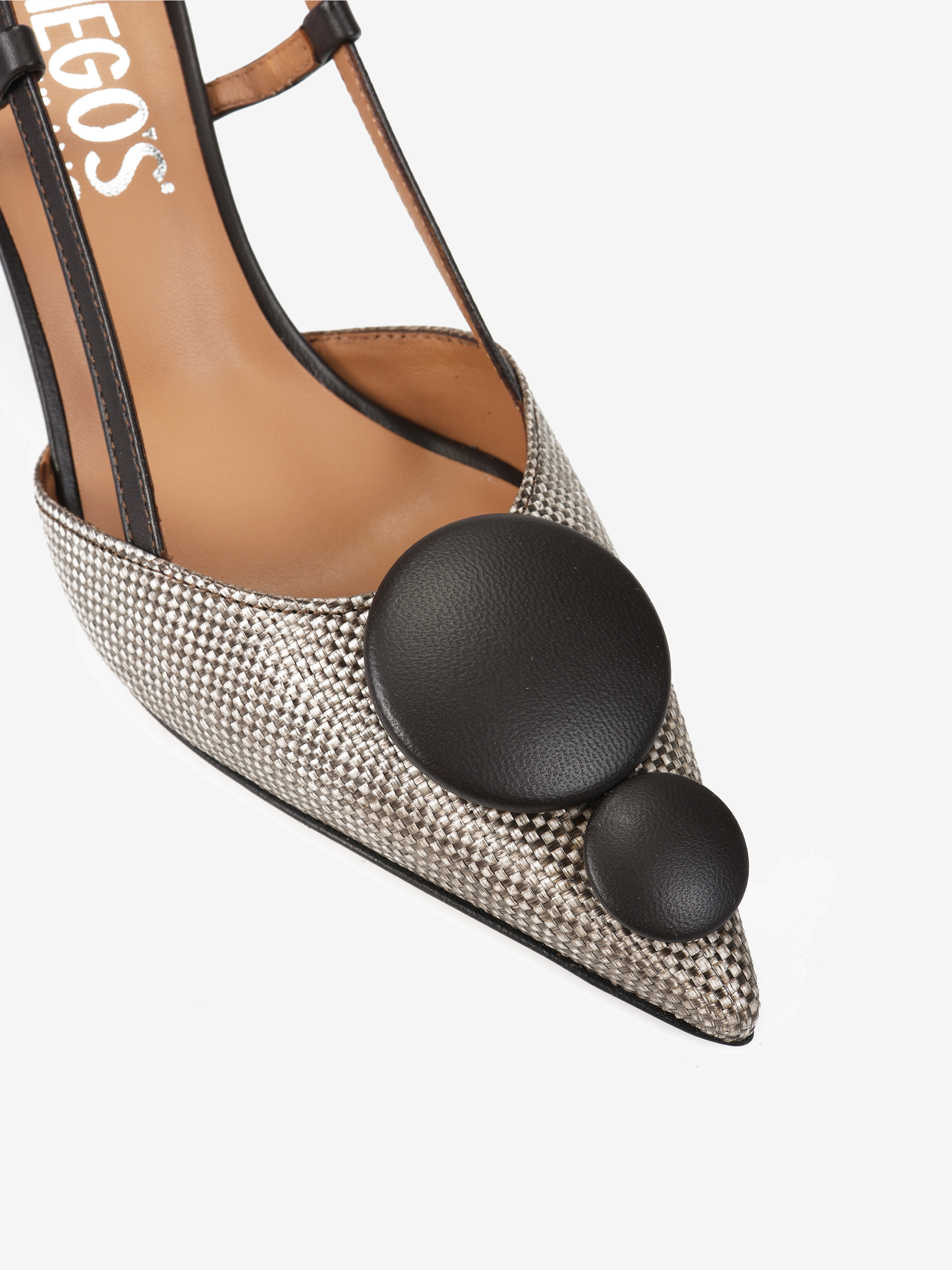 Eleganckie szpilki z tweedowym noskiem w szpic i ozdobną aplikacją. Odkryta pięta z regulowanym paskiem.
