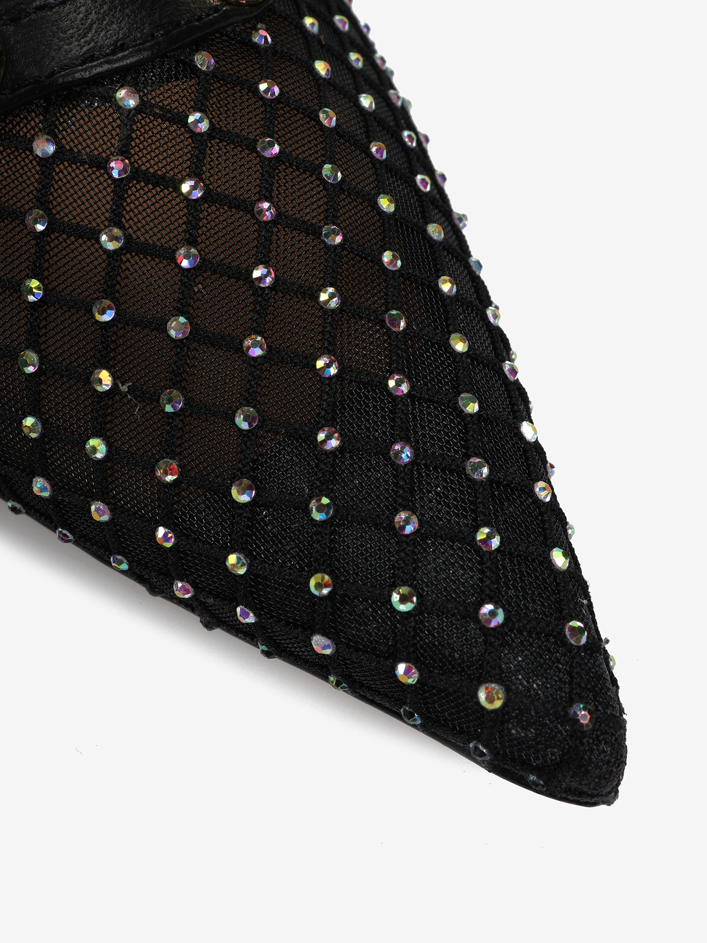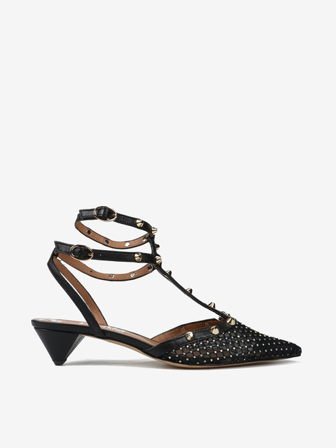 Szpilki z czarnej skóry z ozdobnymi paseczkami i ćwiekami. Nosek w szpic z  przewiewnej siateczki i połyskujących kamyczków.