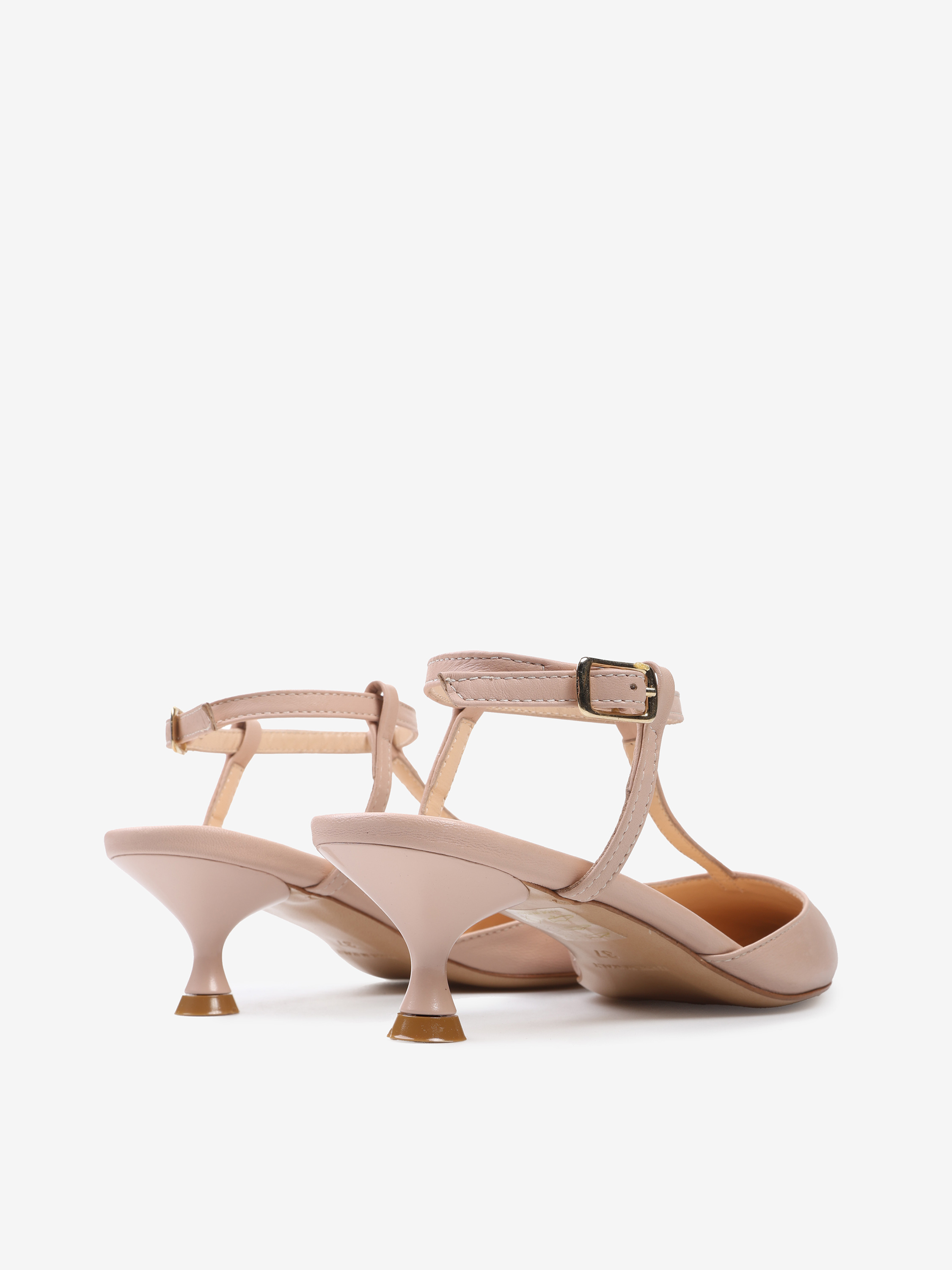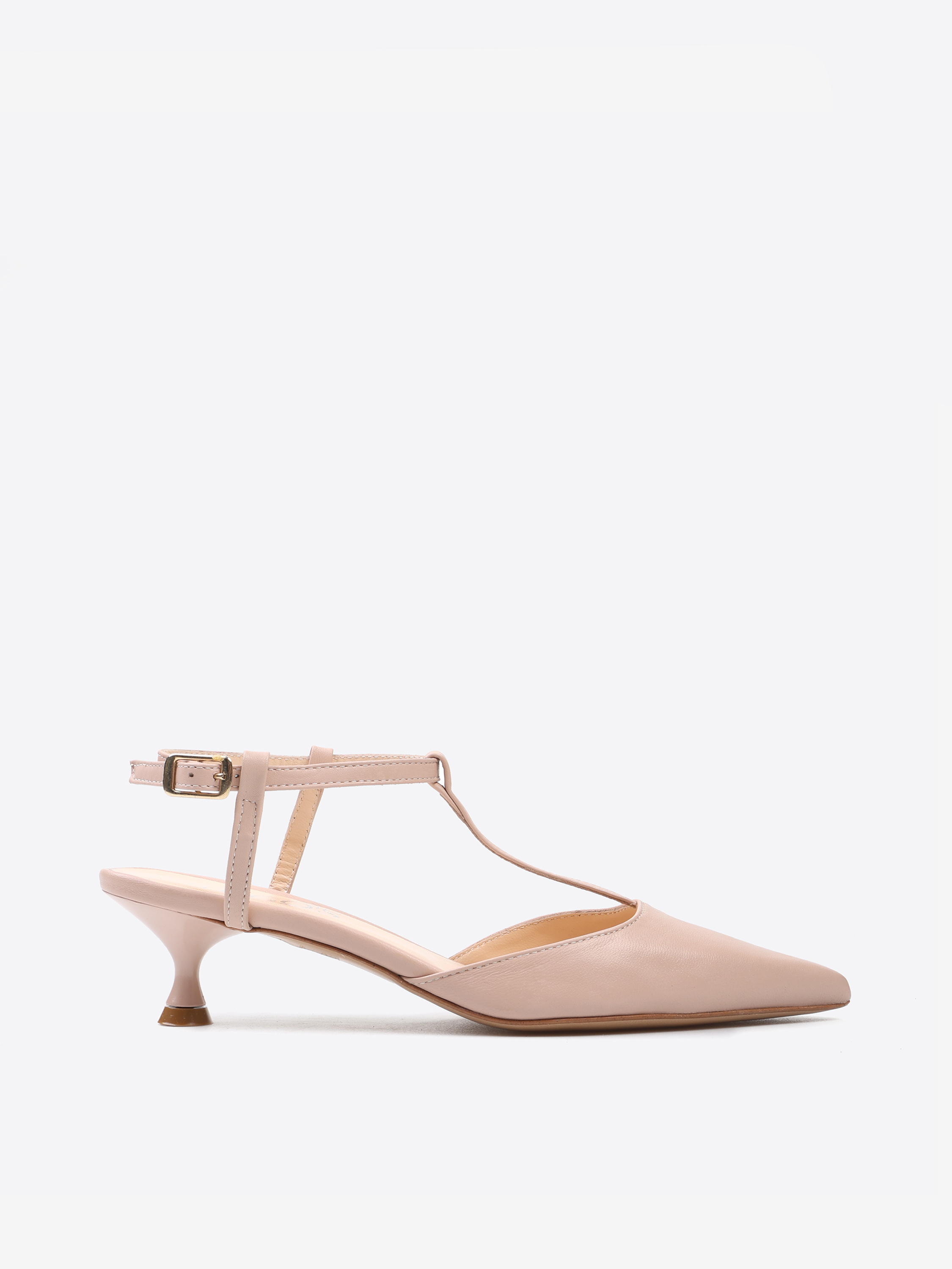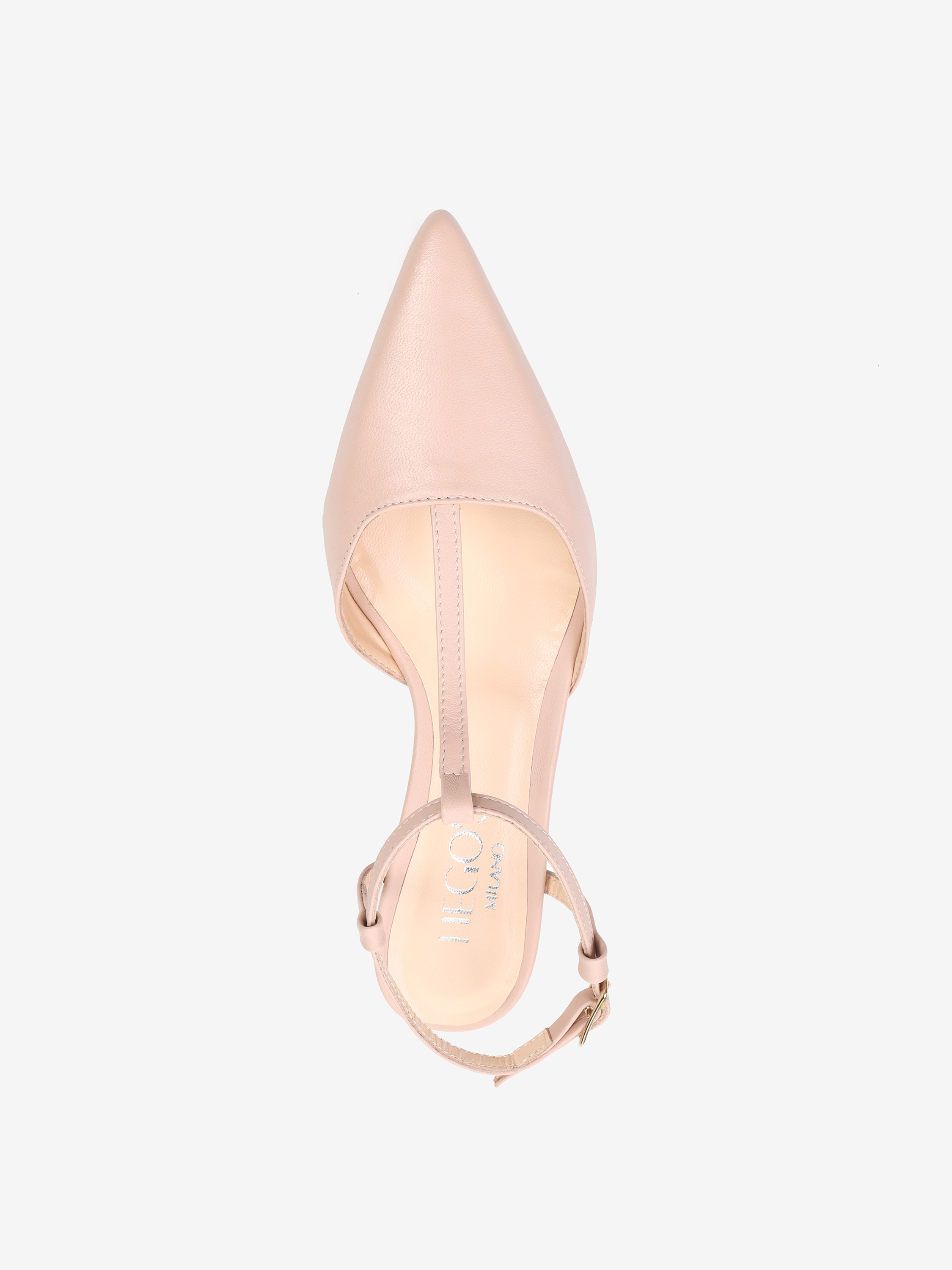 Szpilki z paskiem na podbiciu i noskiem w szpic, wykonane z miękkiej i delikatnej skóry. Odkryta pięta i regulowany pasek na kostce.