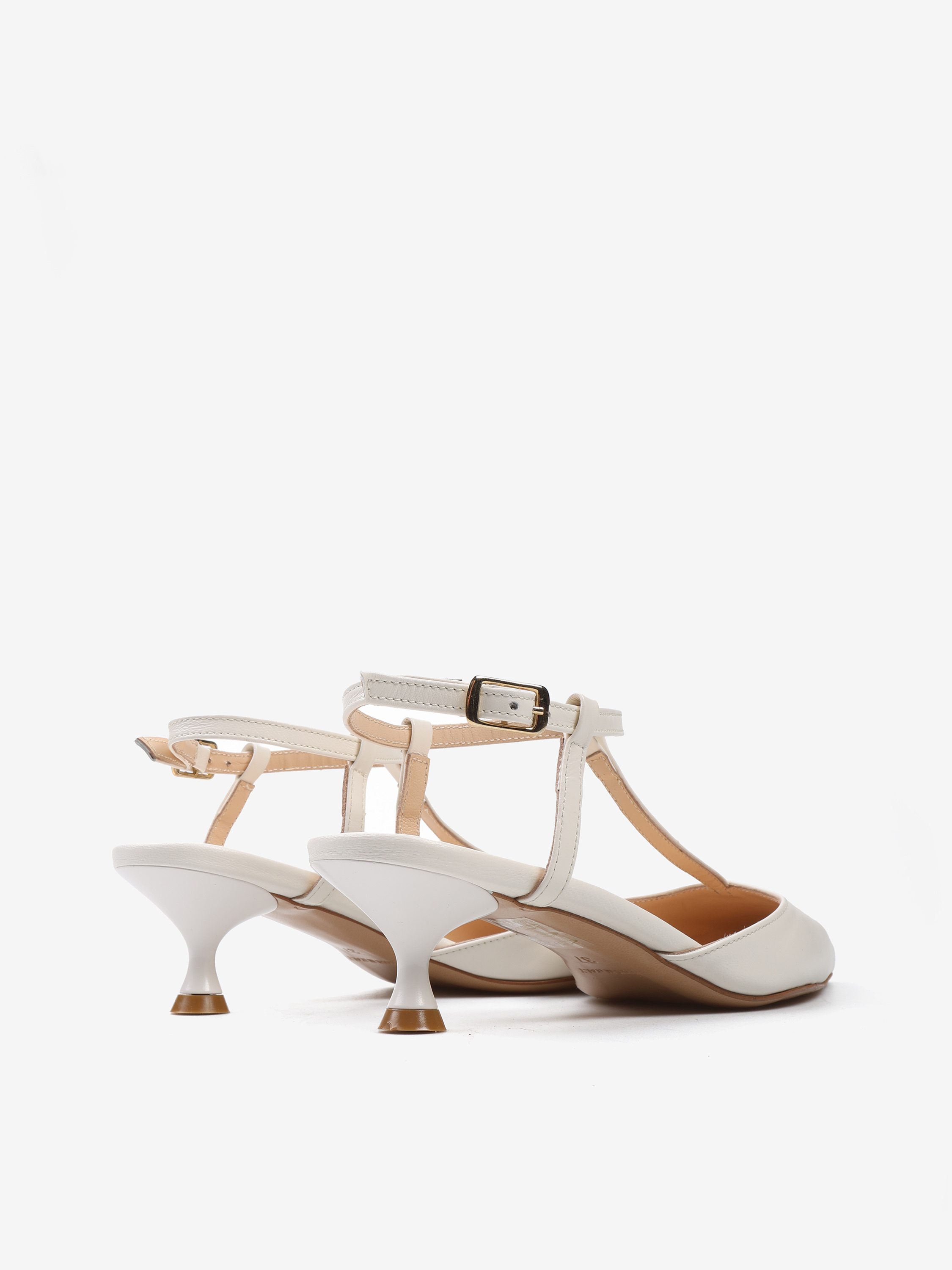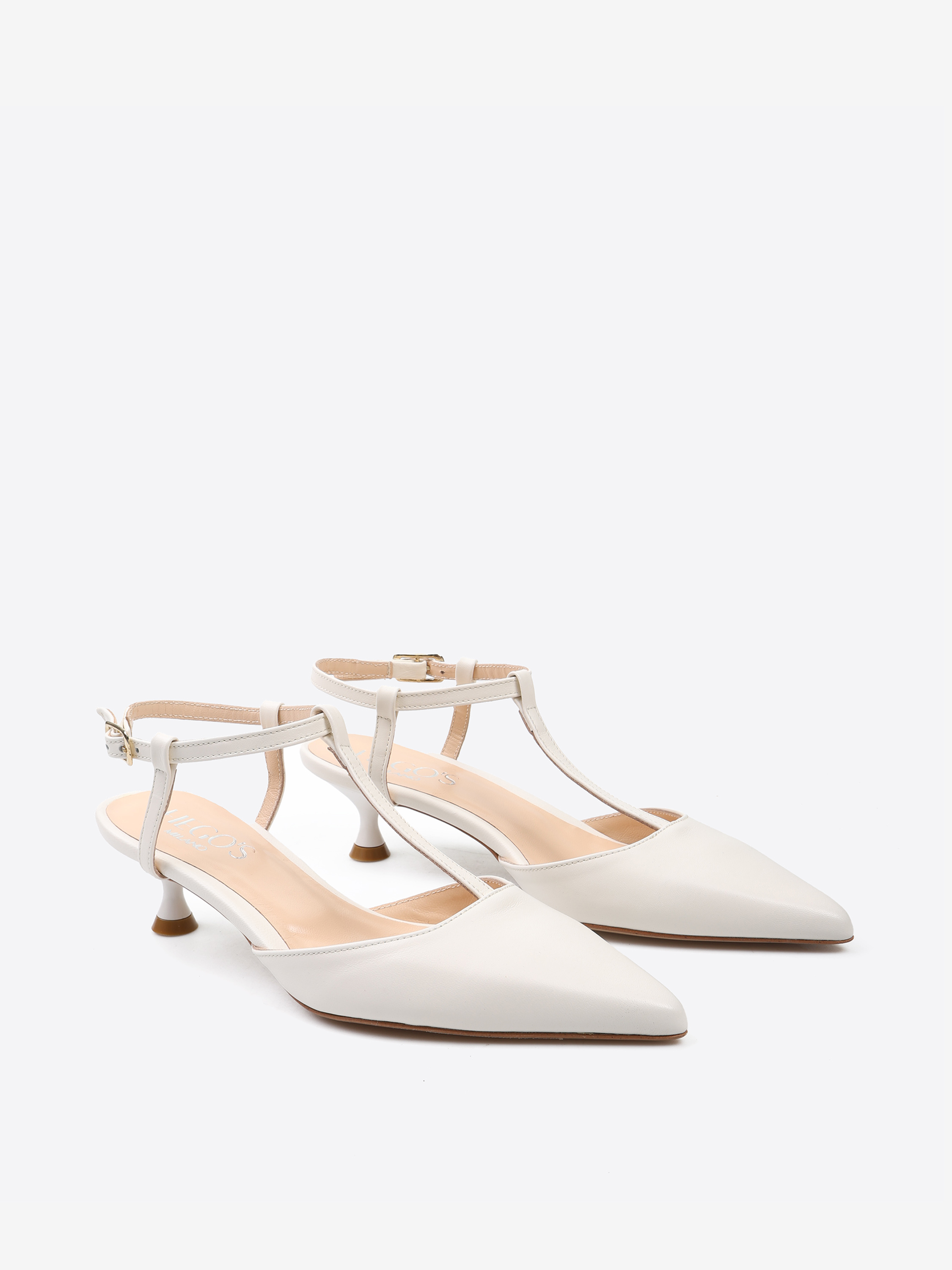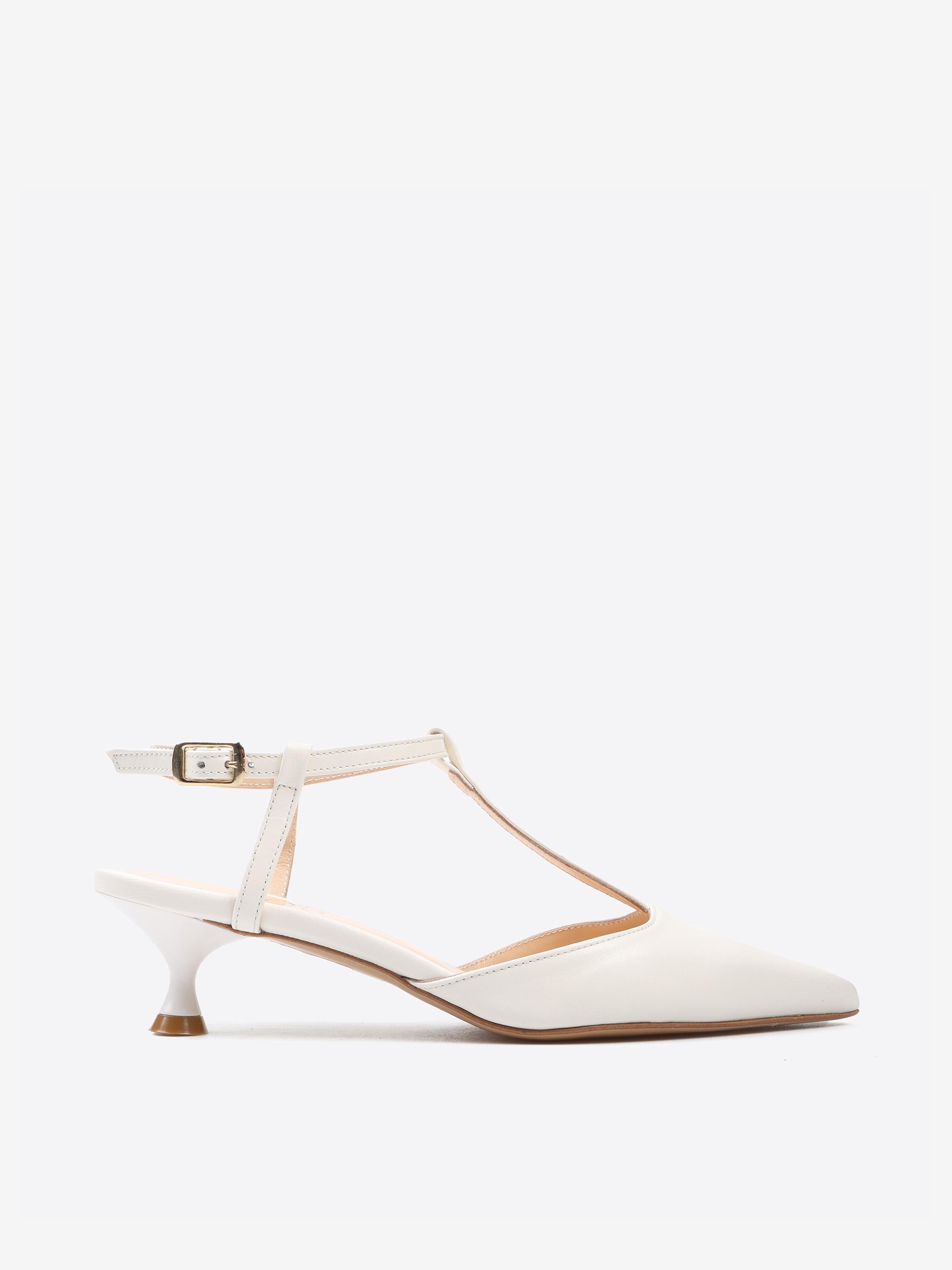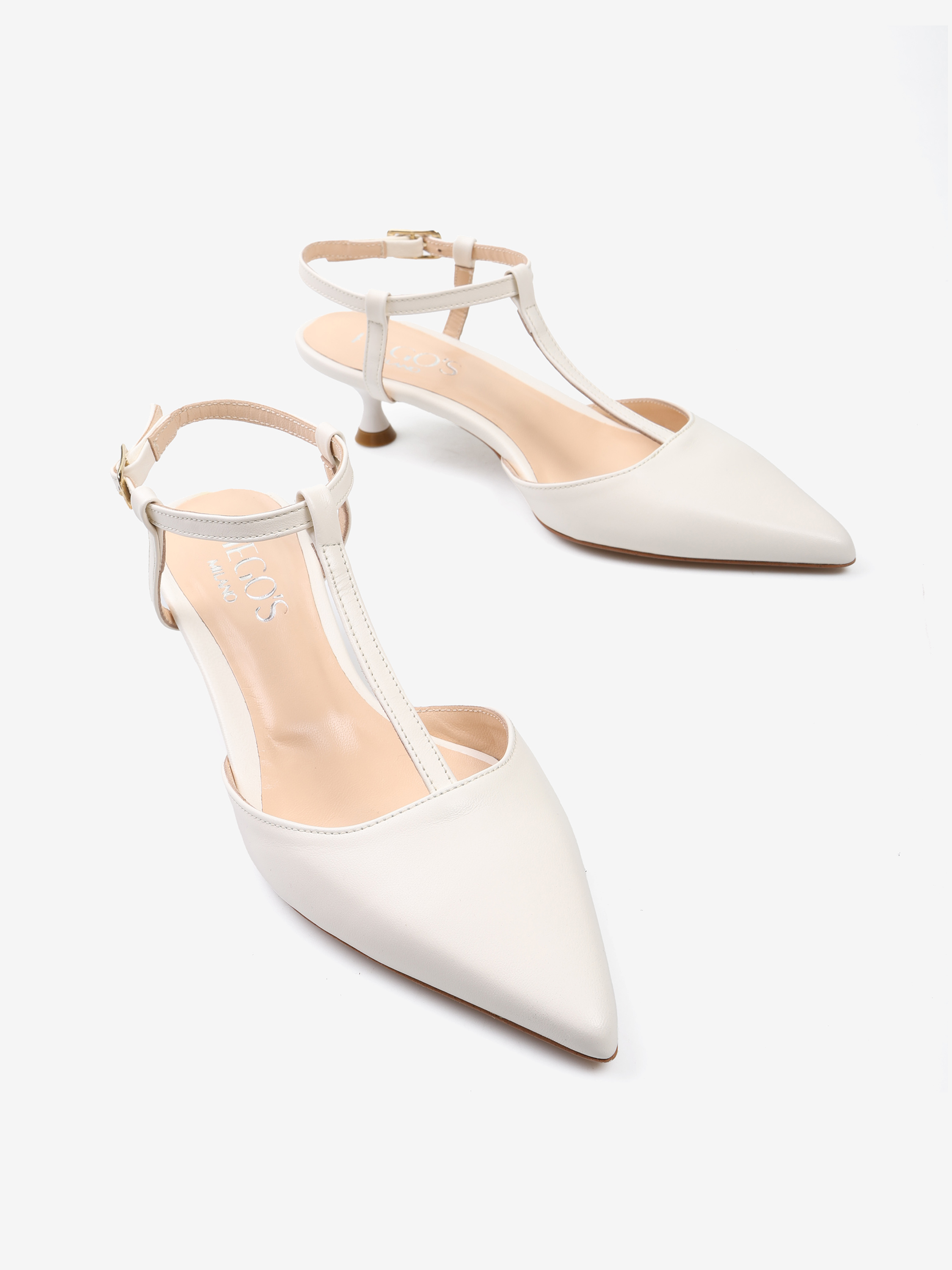 Szpilki z paskiem na podbiciu i noskiem w szpic, wykonane z miękkiej i delikatnej skóry. Odkryta pięta i regulowany pasek na kostce.