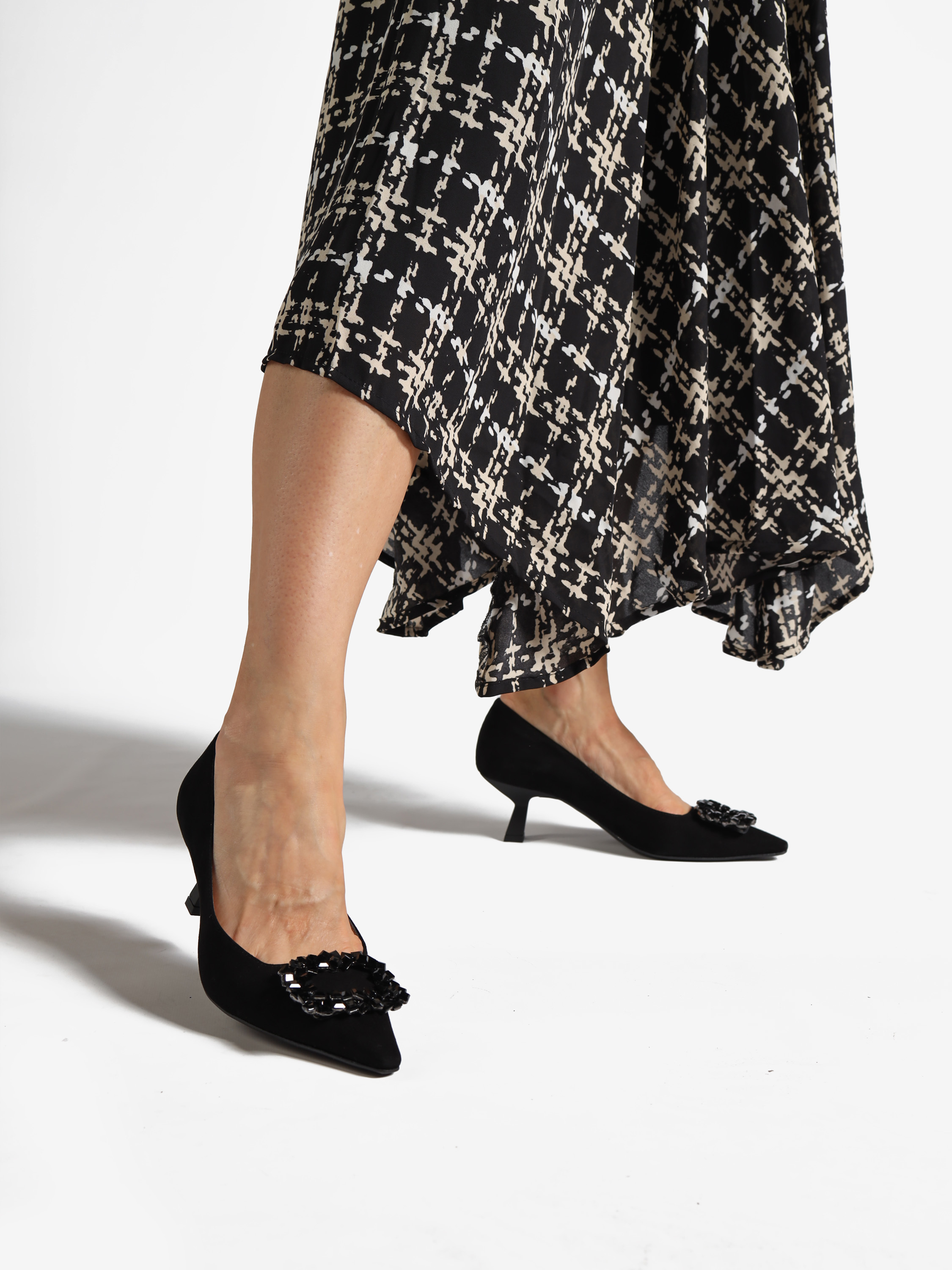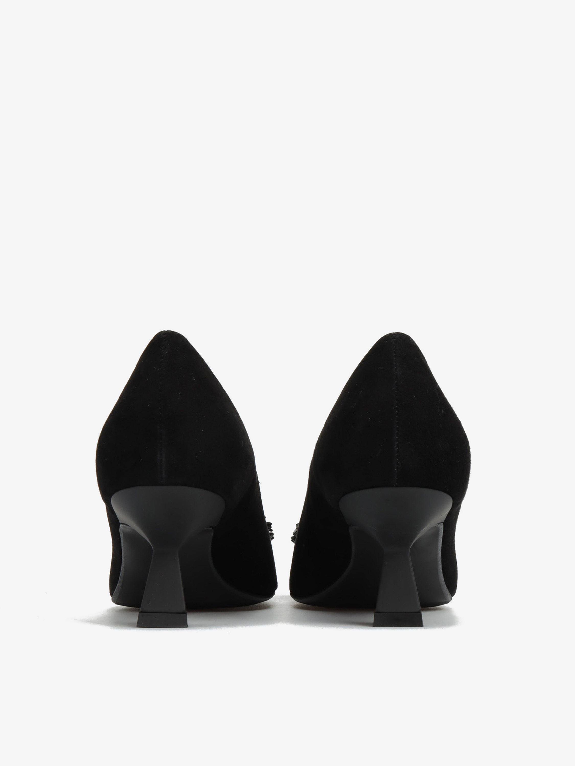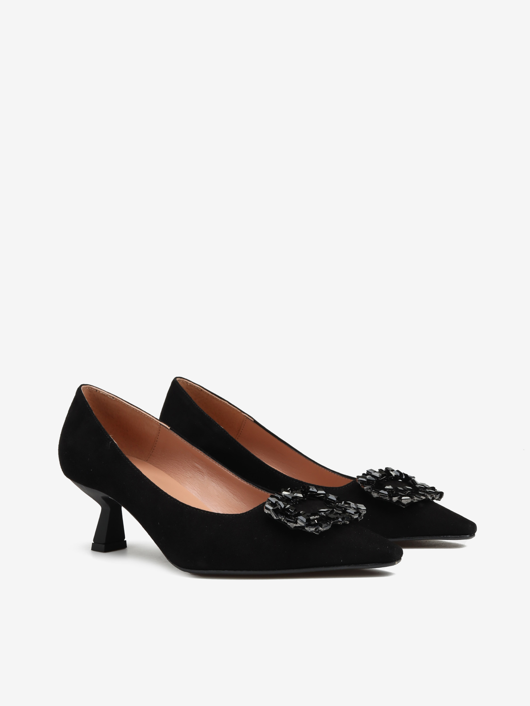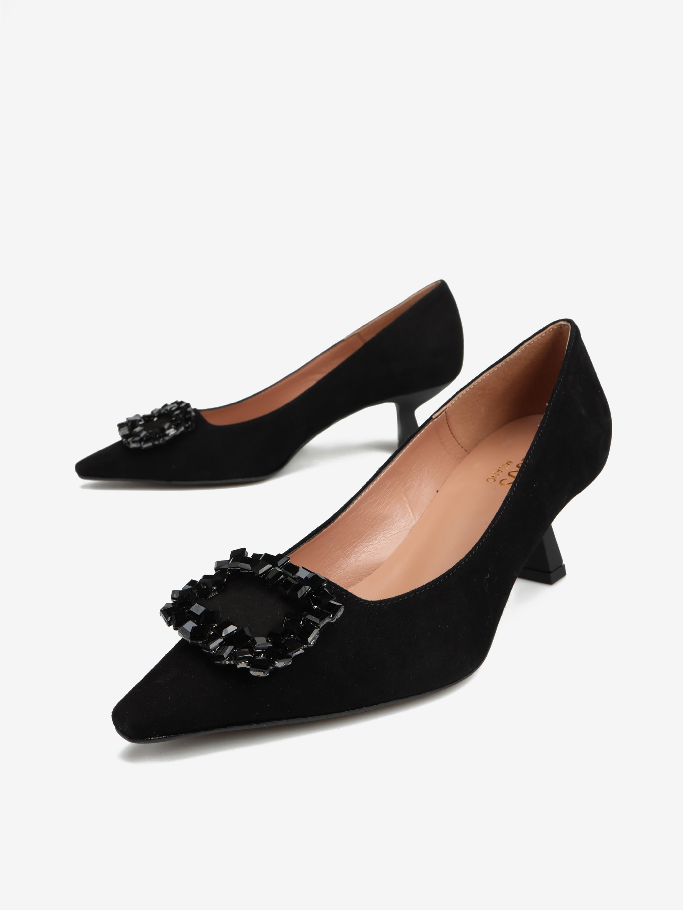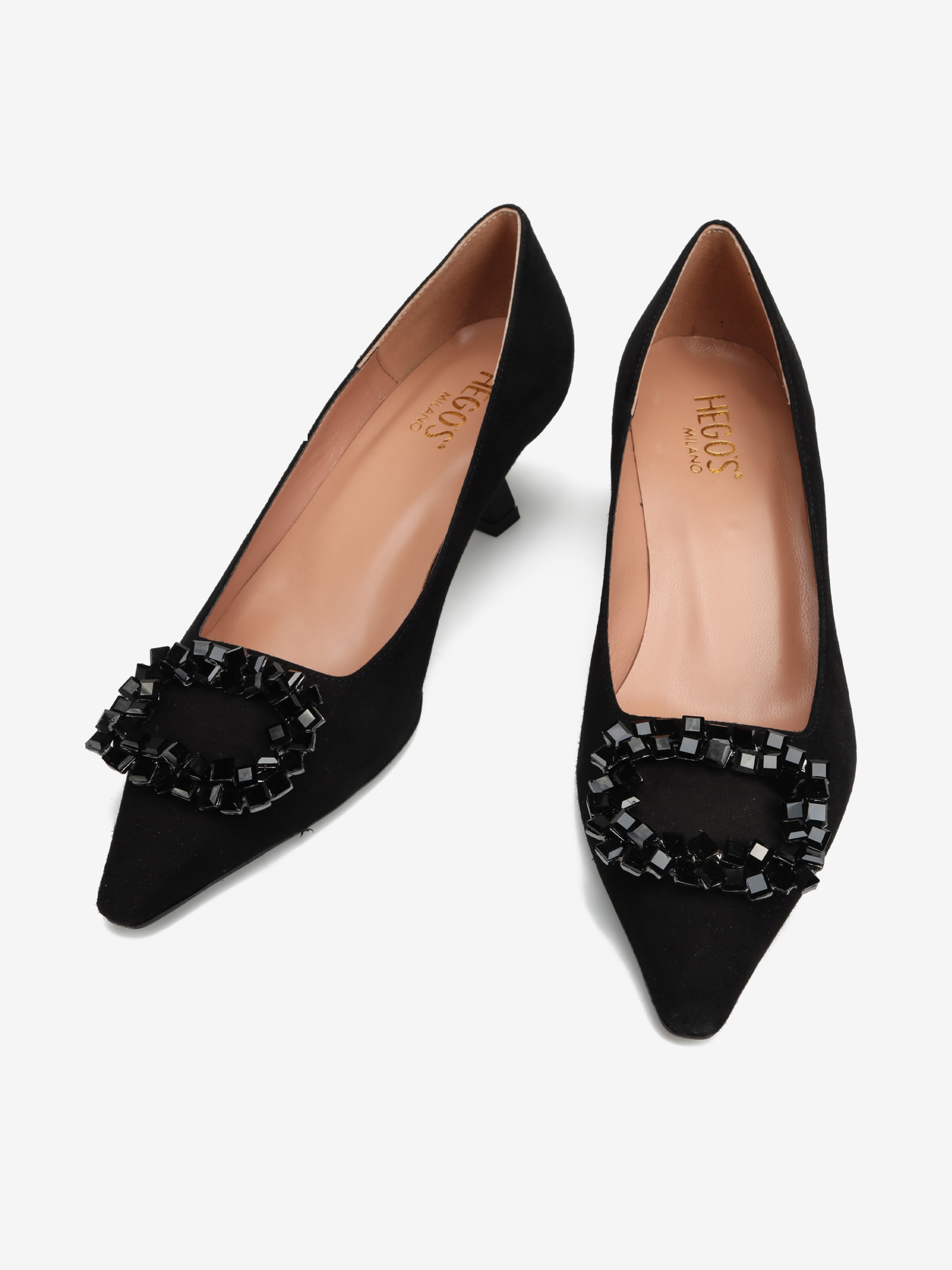 Szpilki w szpic HEGO'S Milano wykonane są z włoskiej, zamszowej skóry. Cholewka w kolorze czarnym wykończona biżuteryjną klamrą. Wygodny obcas na szpilce w połączeniu ze skórzaną wkładką zapewnią komfort podczas użytkowania obuwia.