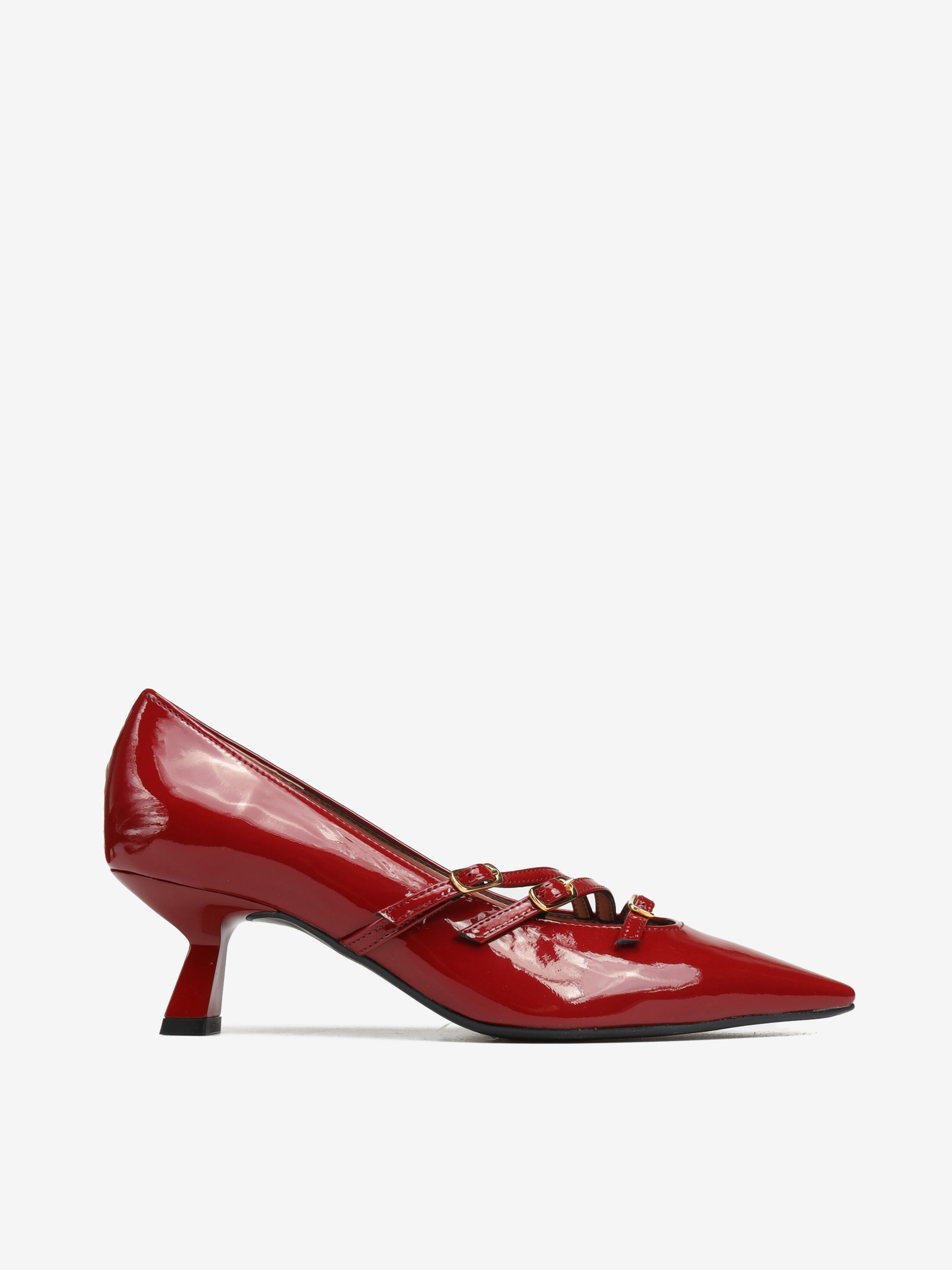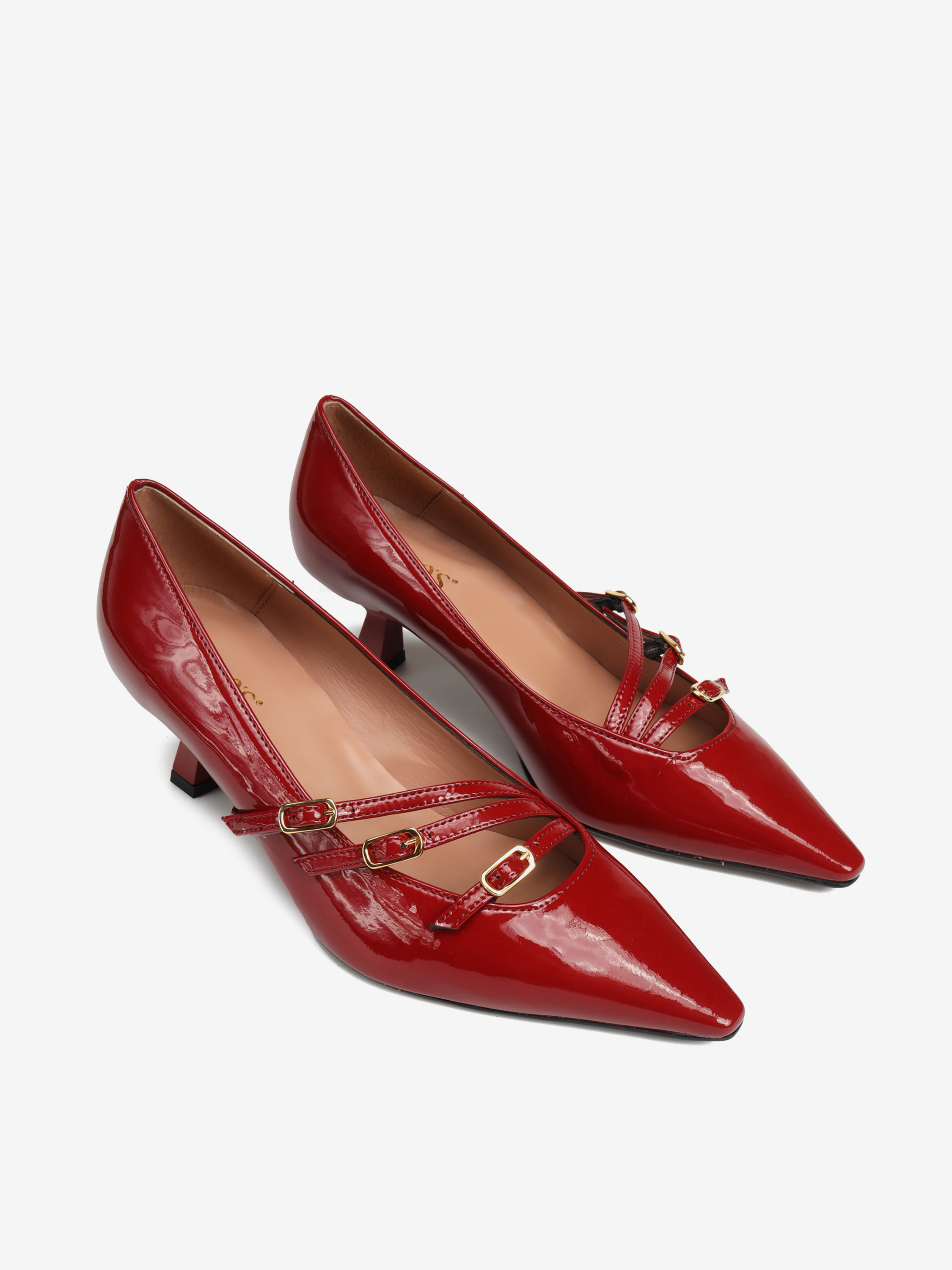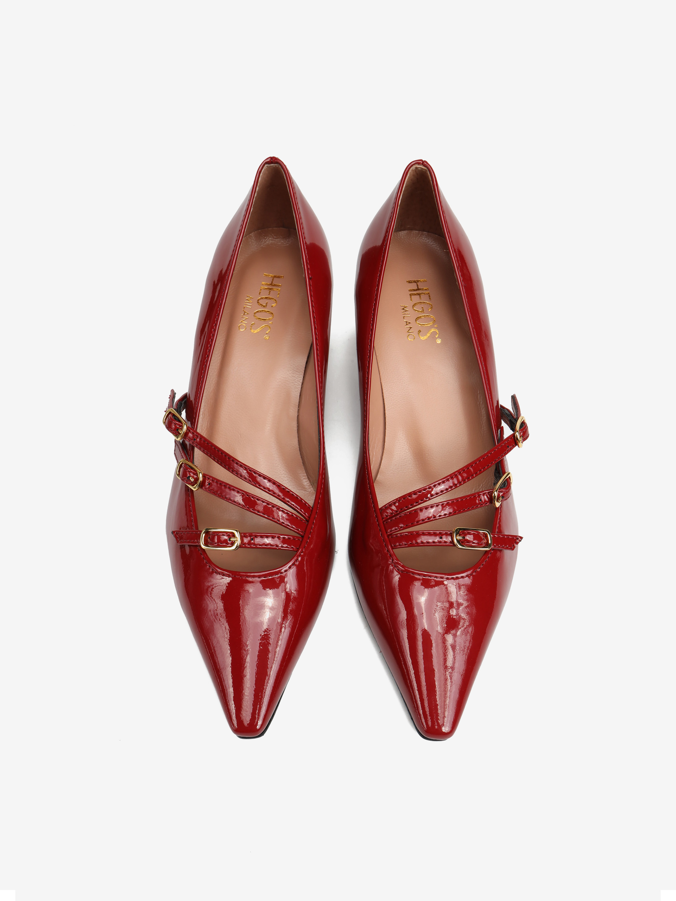Czółenka z lakierowanej skóry niskim obcasie. Nosek w szpic i ozdobne paseczki.