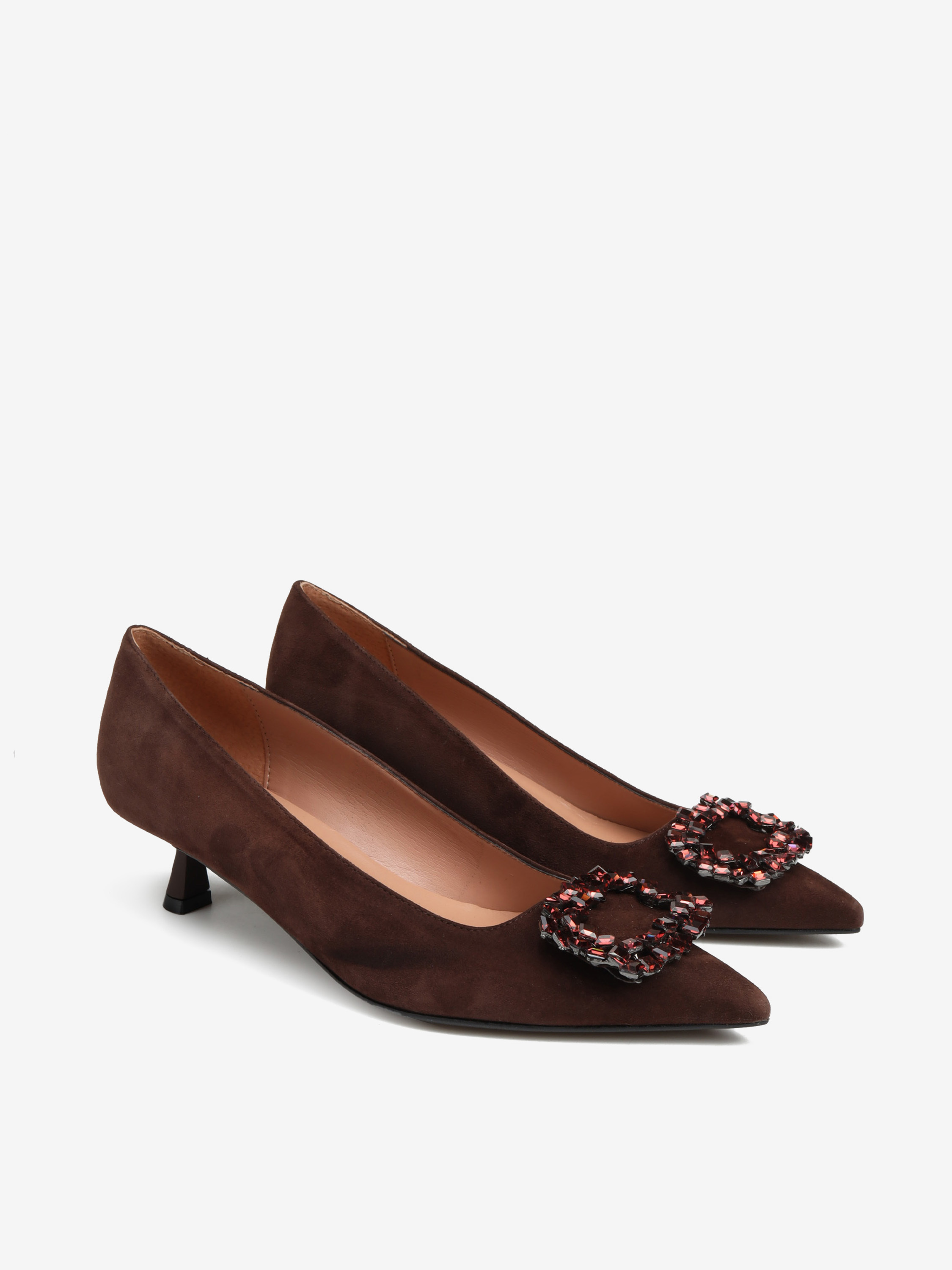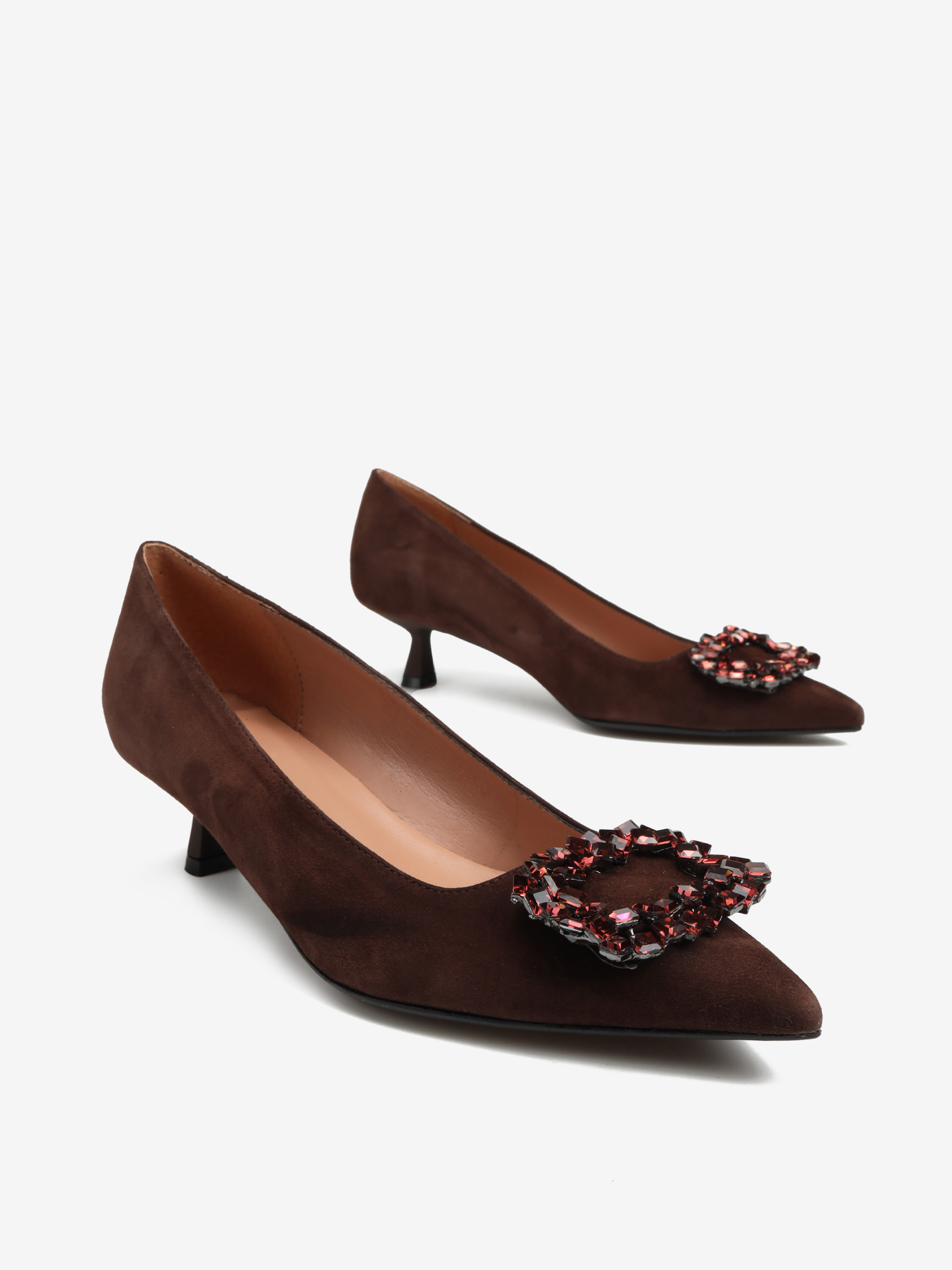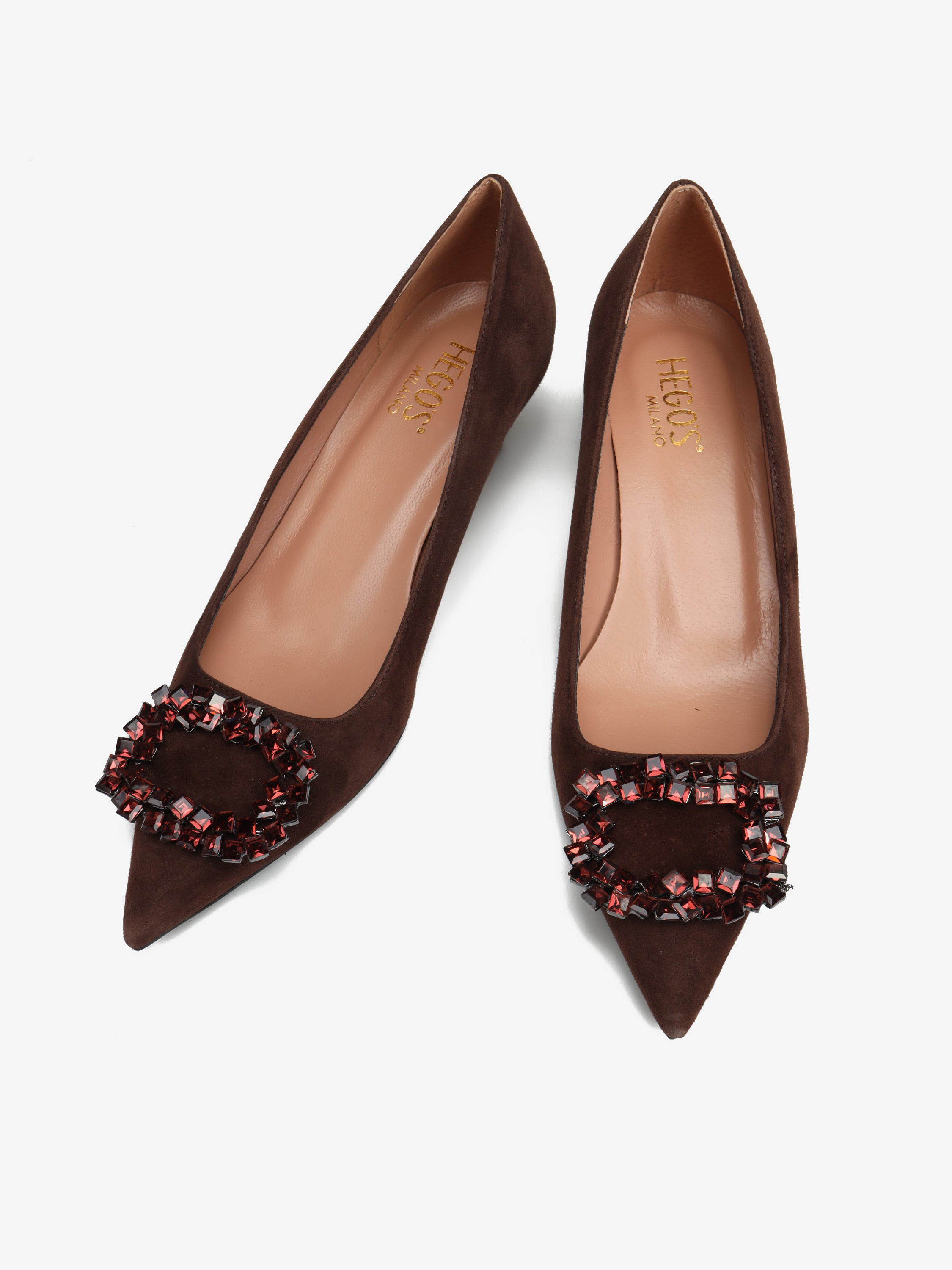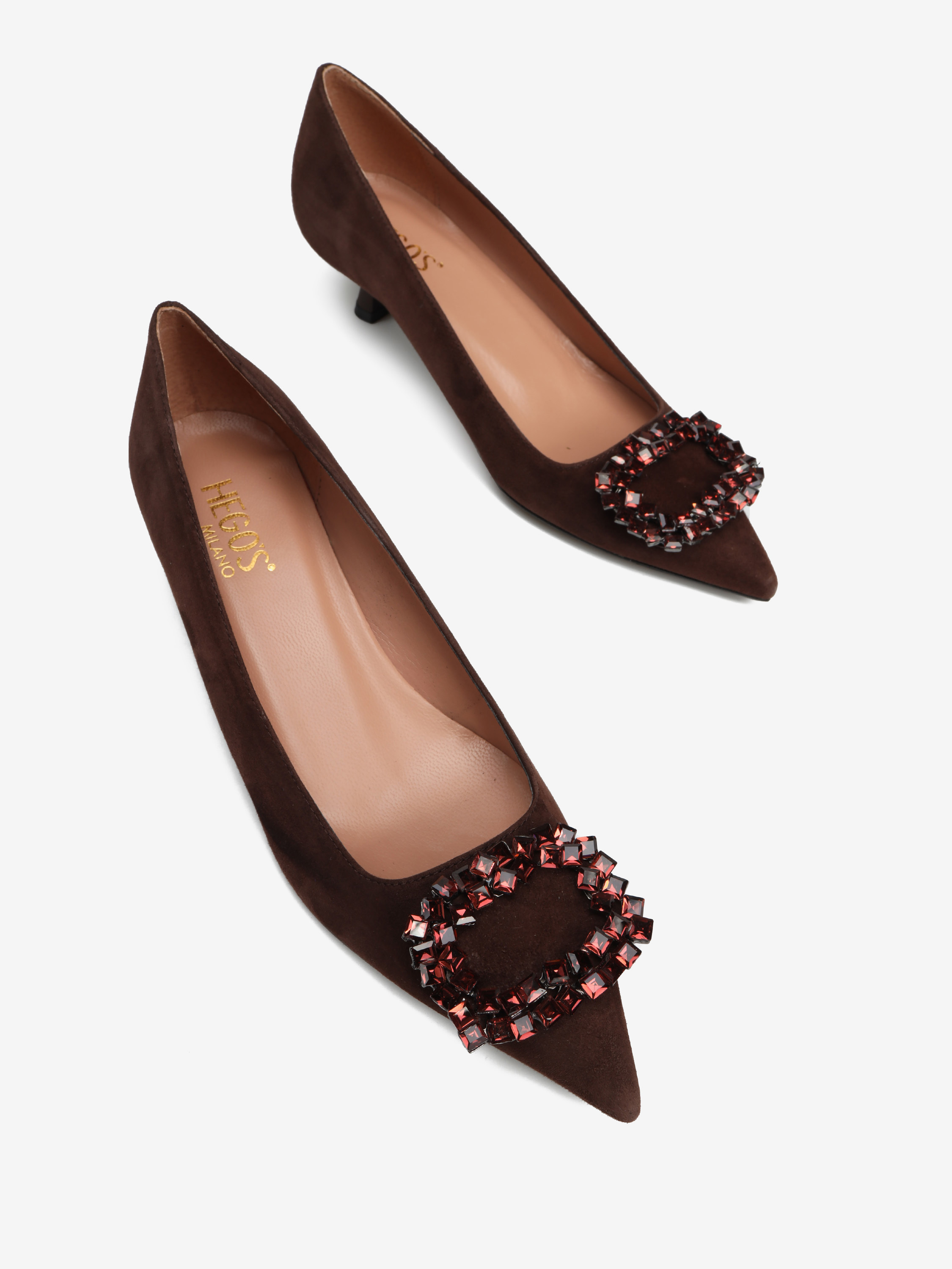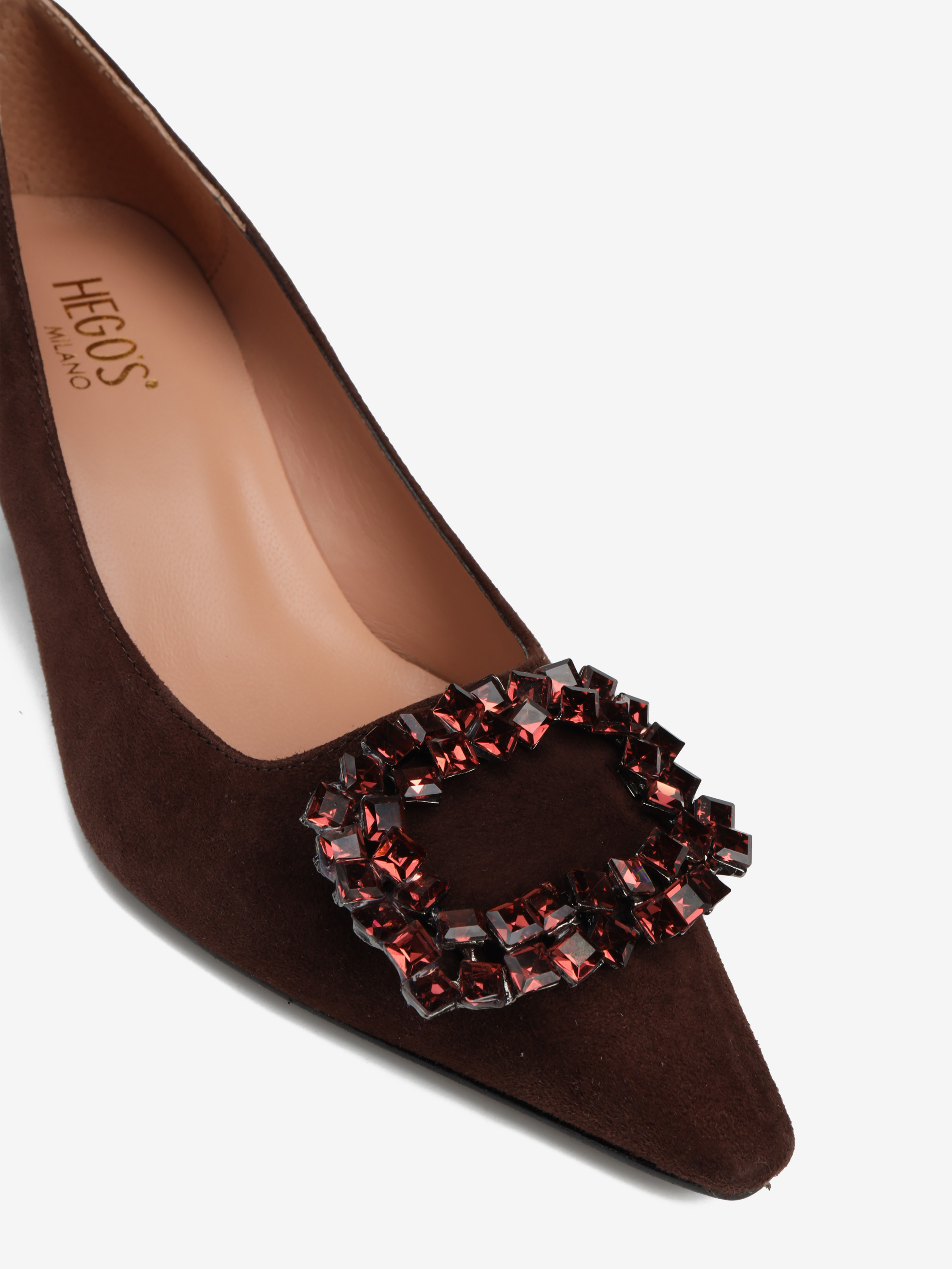 Szpilki w szpic HEGO'S Milano wykonane są z włoskiej, zamszowej skóry. Cholewka w kolorze czekoladowym wykończona biżuteryjną klamrą. Wygodny obcas na szpilce w połączeniu ze skórzaną wkładką zapewnią komfort podczas użytkowania obuwia.