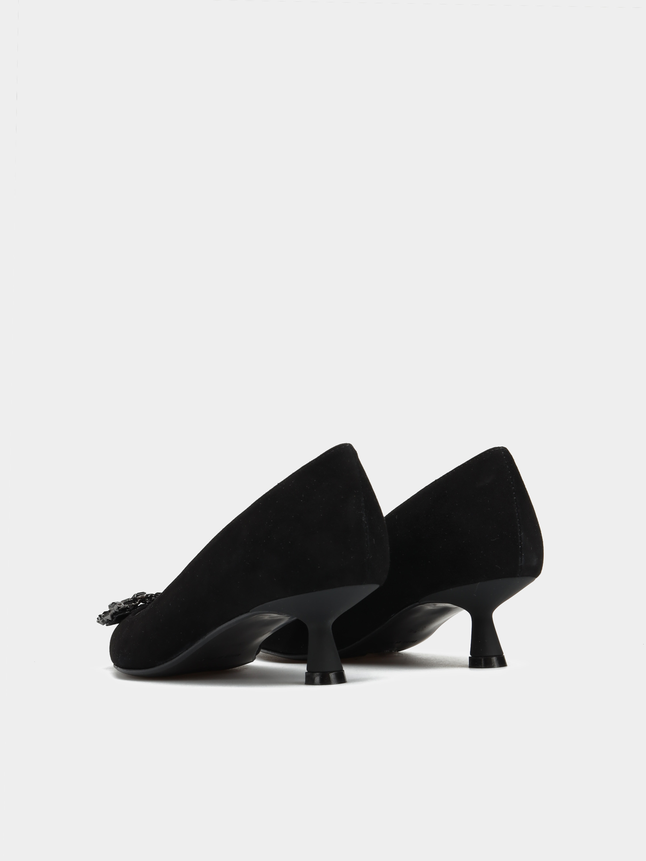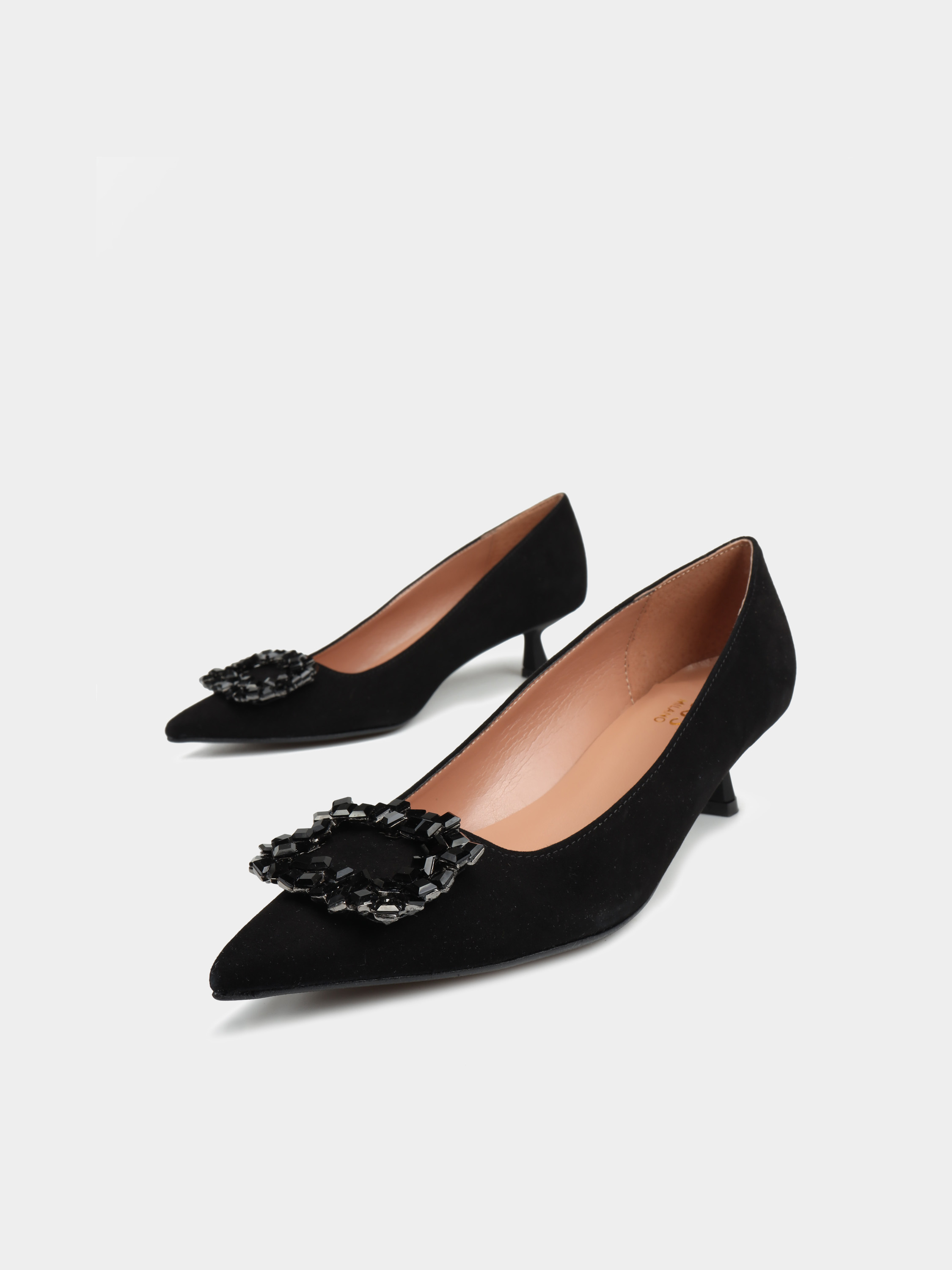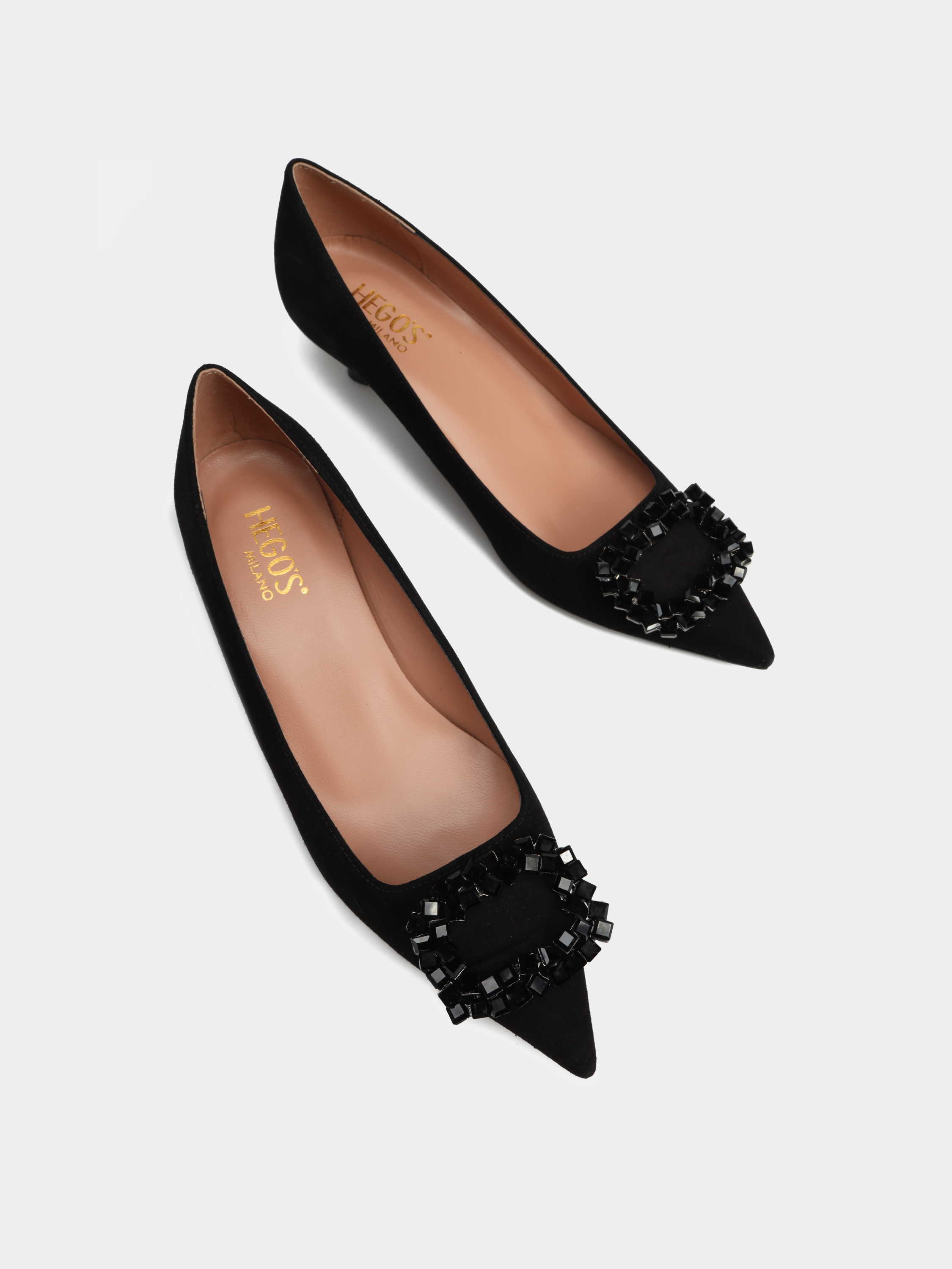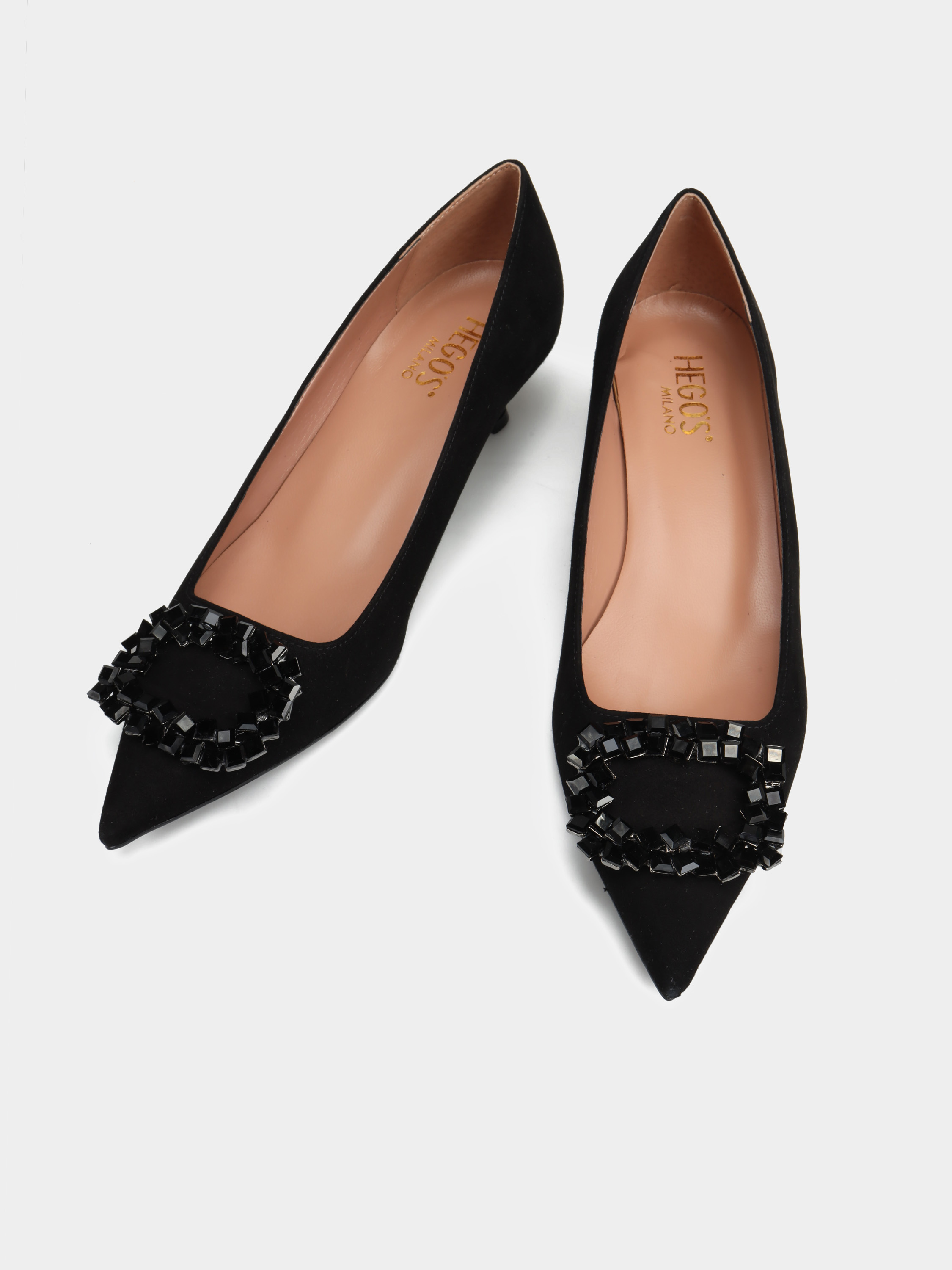 Szpilki w szpic HEGO'S Milano wykonane są z włoskiej, zamszowej skóry. Cholewka w czarnym kolorze wykończona biżuteryjną klamrą. Wygodny obcas na szpilce w połączeniu ze skórzaną wkładką zapewnią komfort podczas użytkowania obuwia.