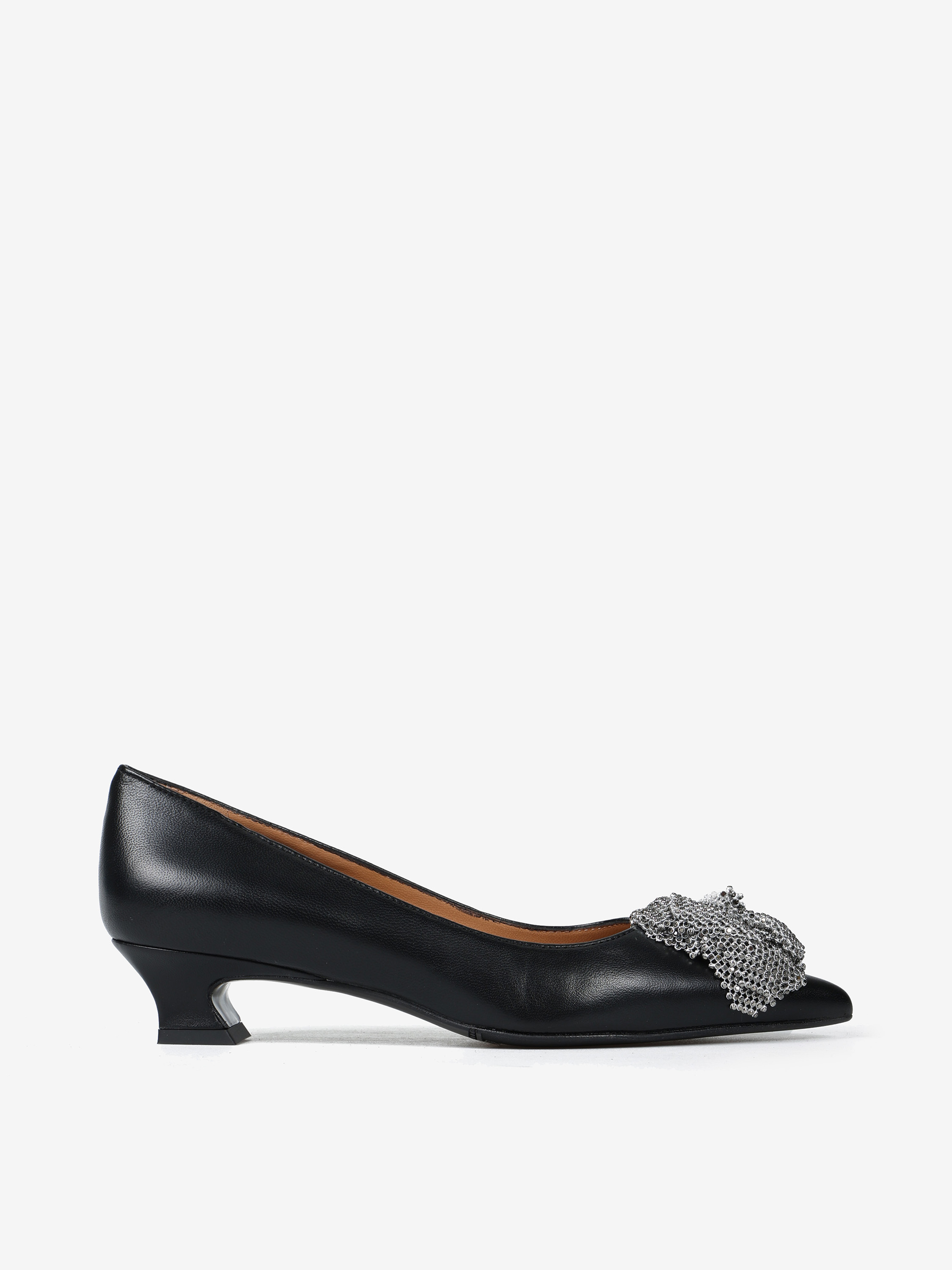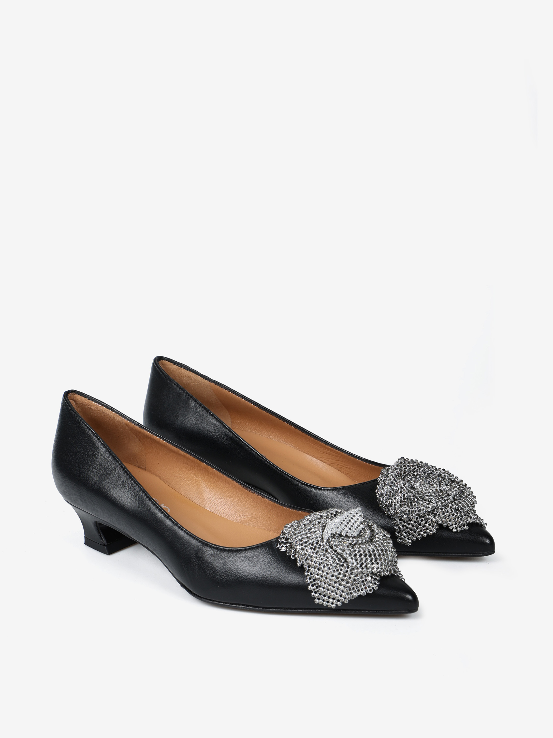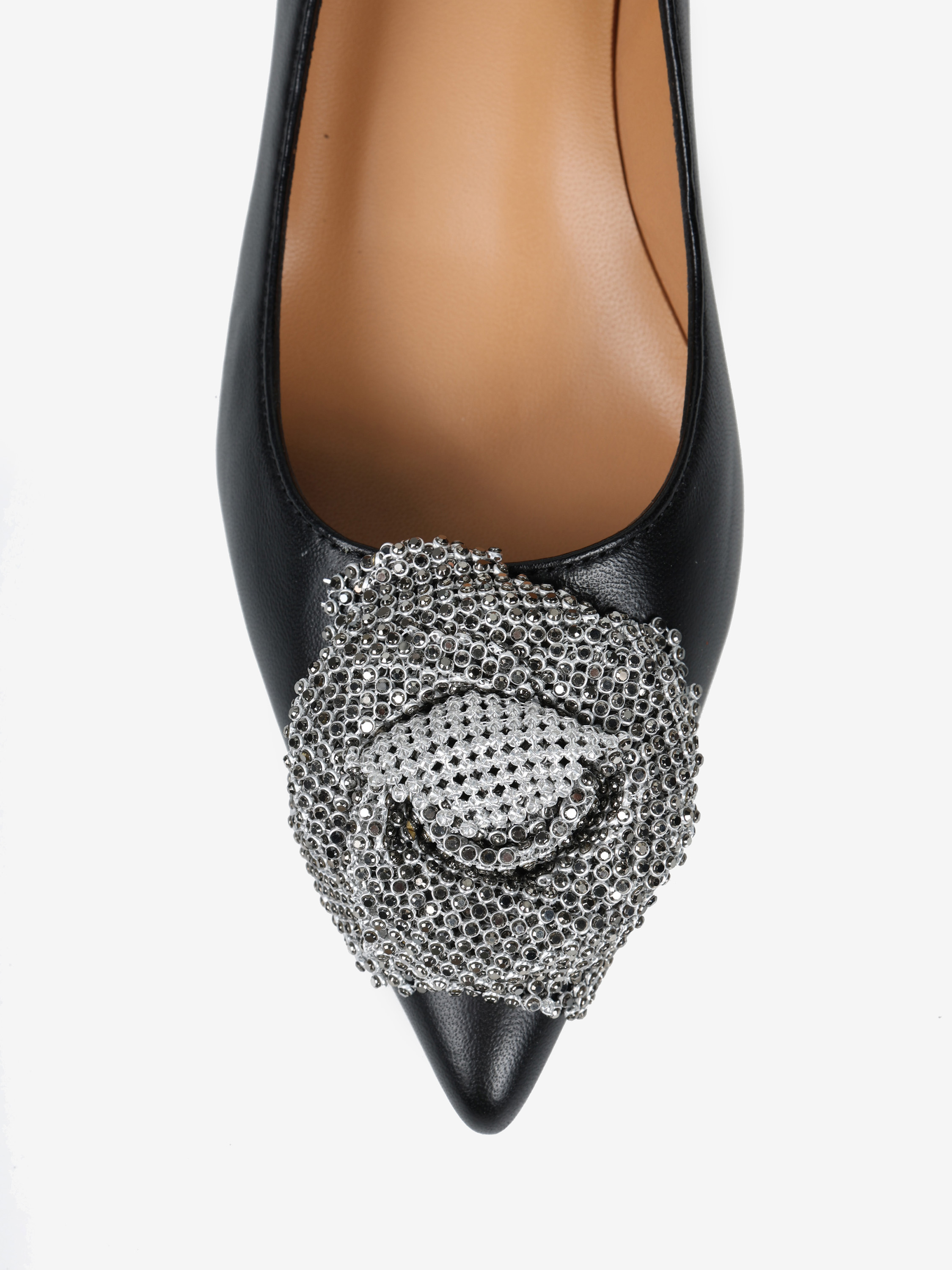 Szpilki z noskiem w szpic i ozdobnym kwiatem z połyskującej, biżuteryjnej siateczki. Wykonane z miękkiej i delikatnej skóry.