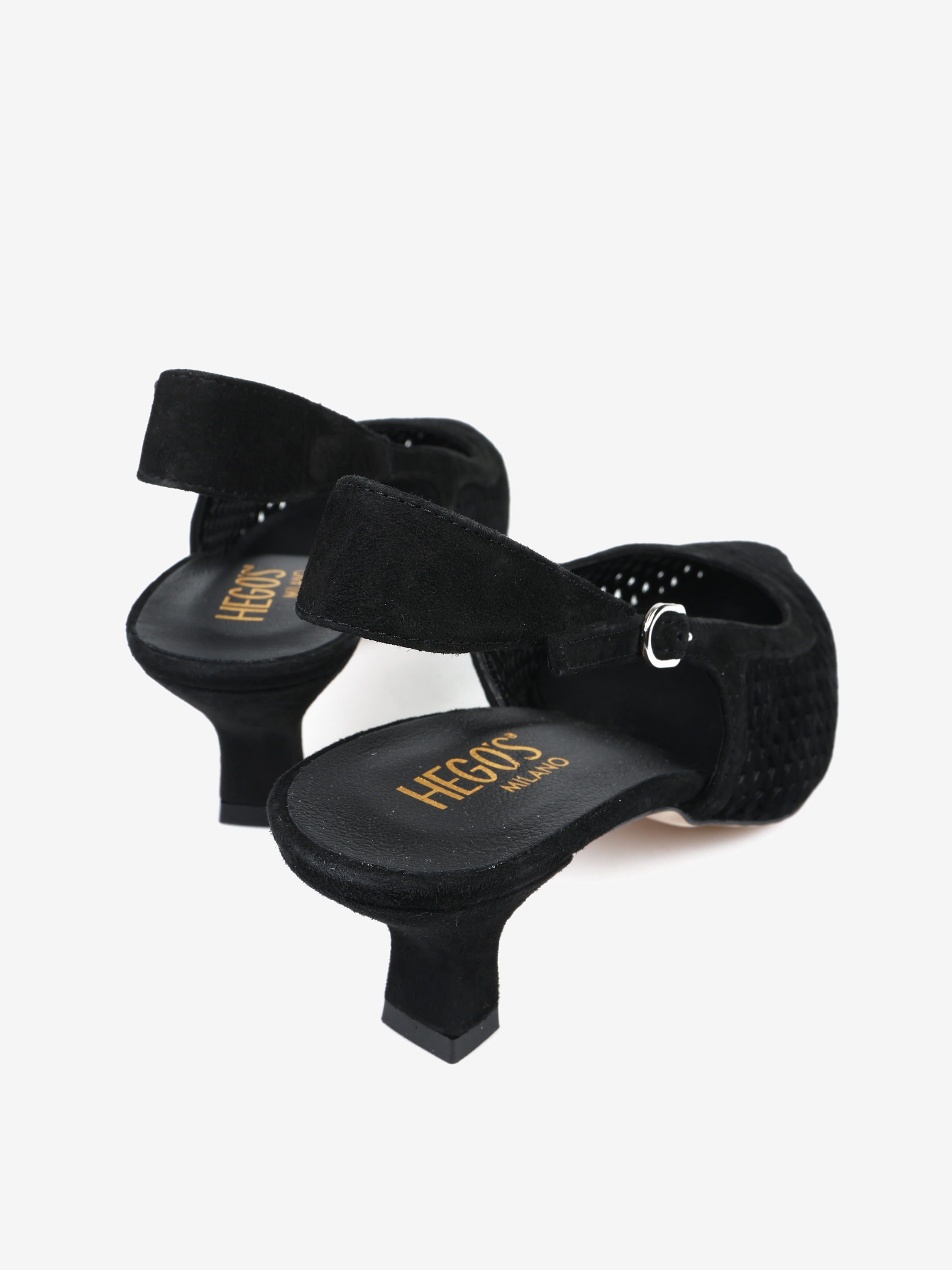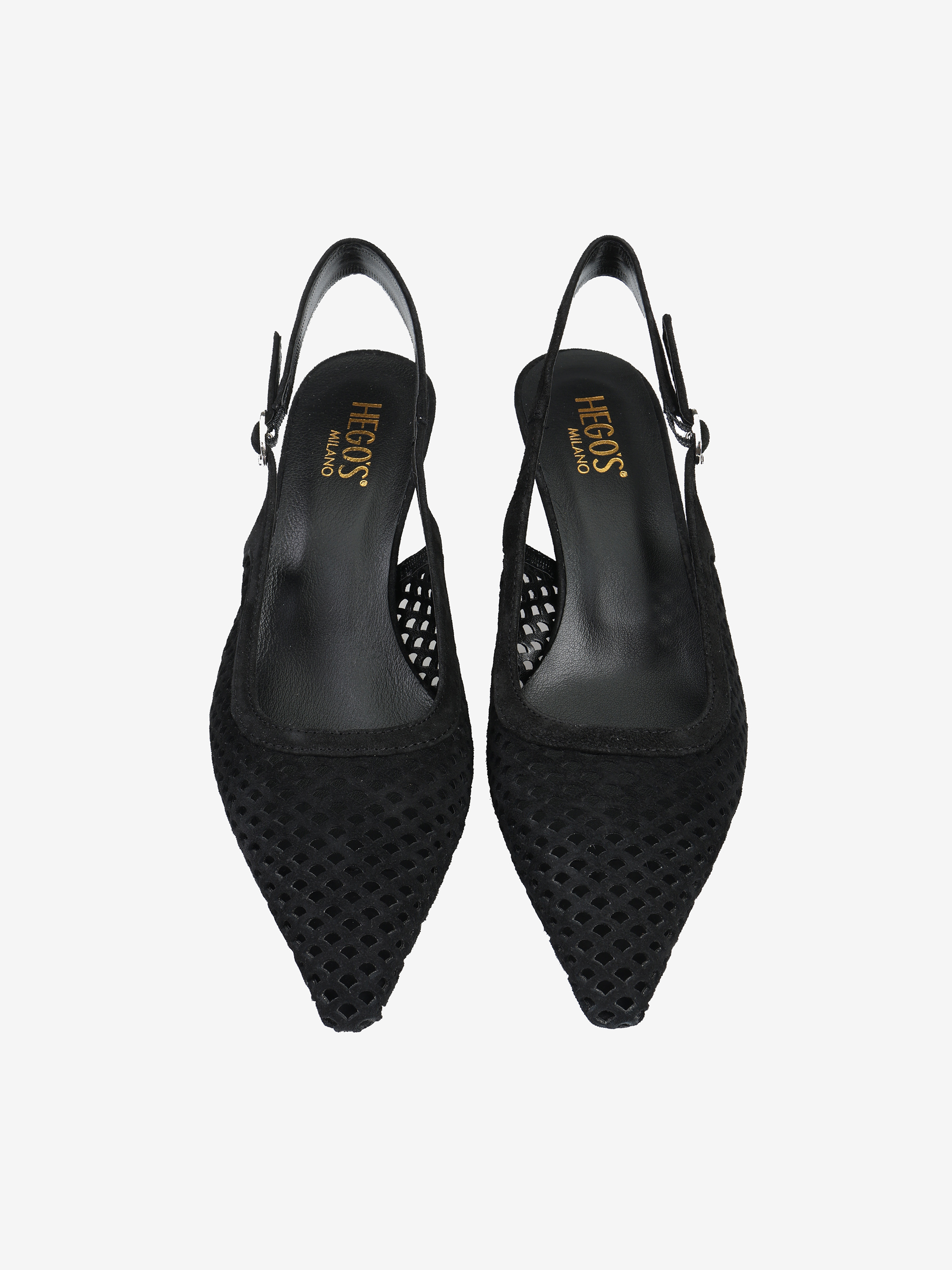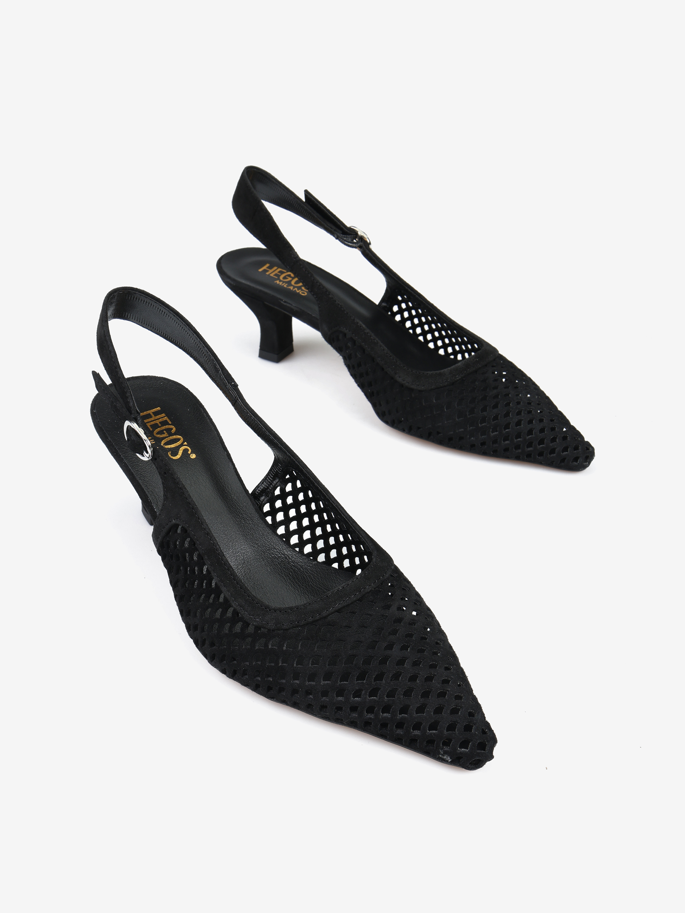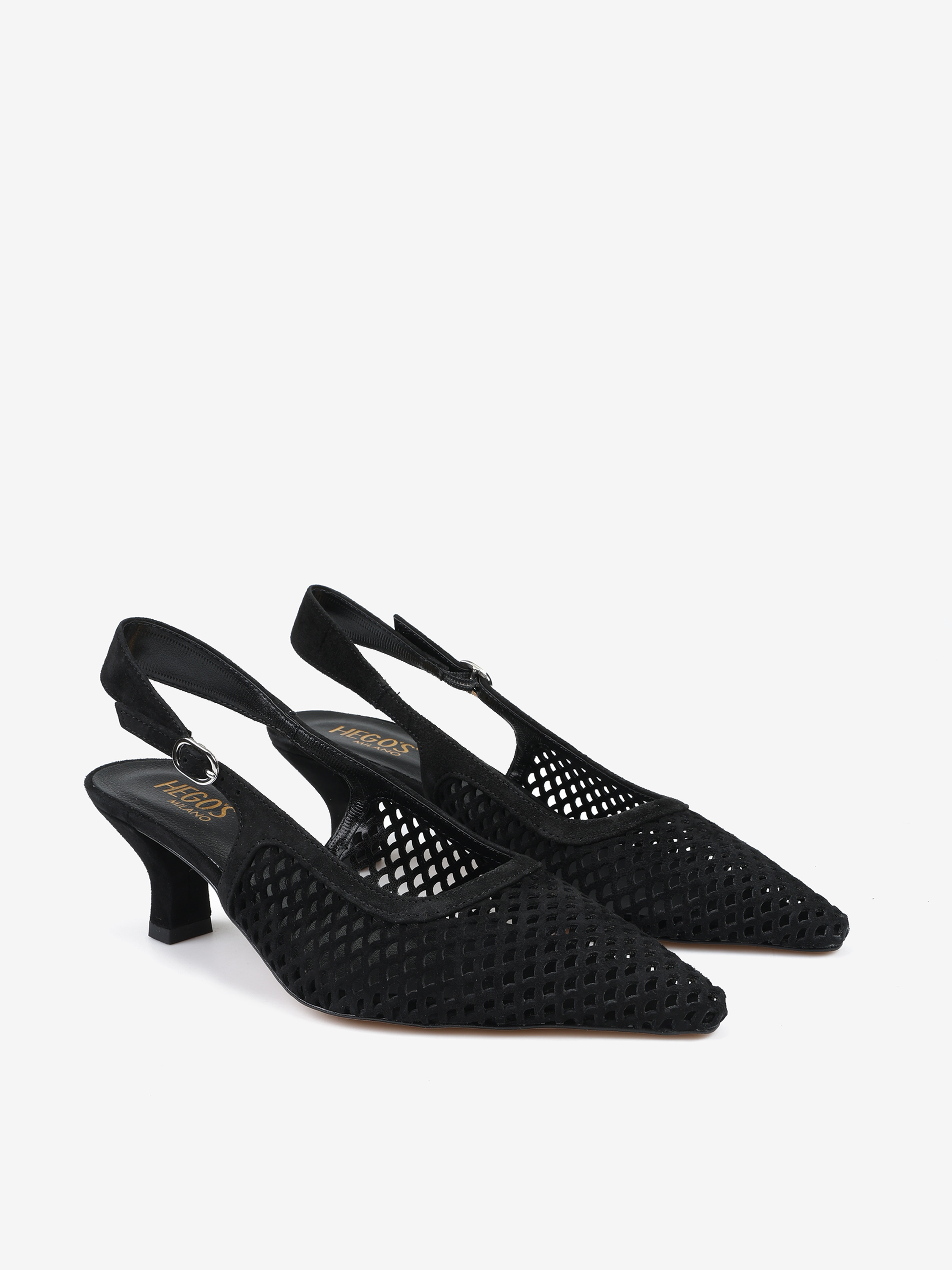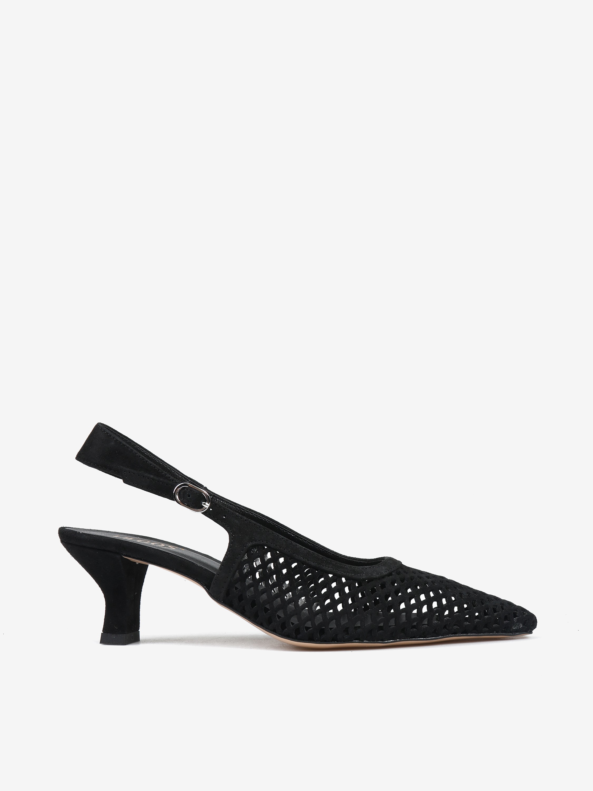 Ażurowe szpilki z noskiem w szpic, wykonane z zamszu. Odkryta pięta z regulowanym paskiem.