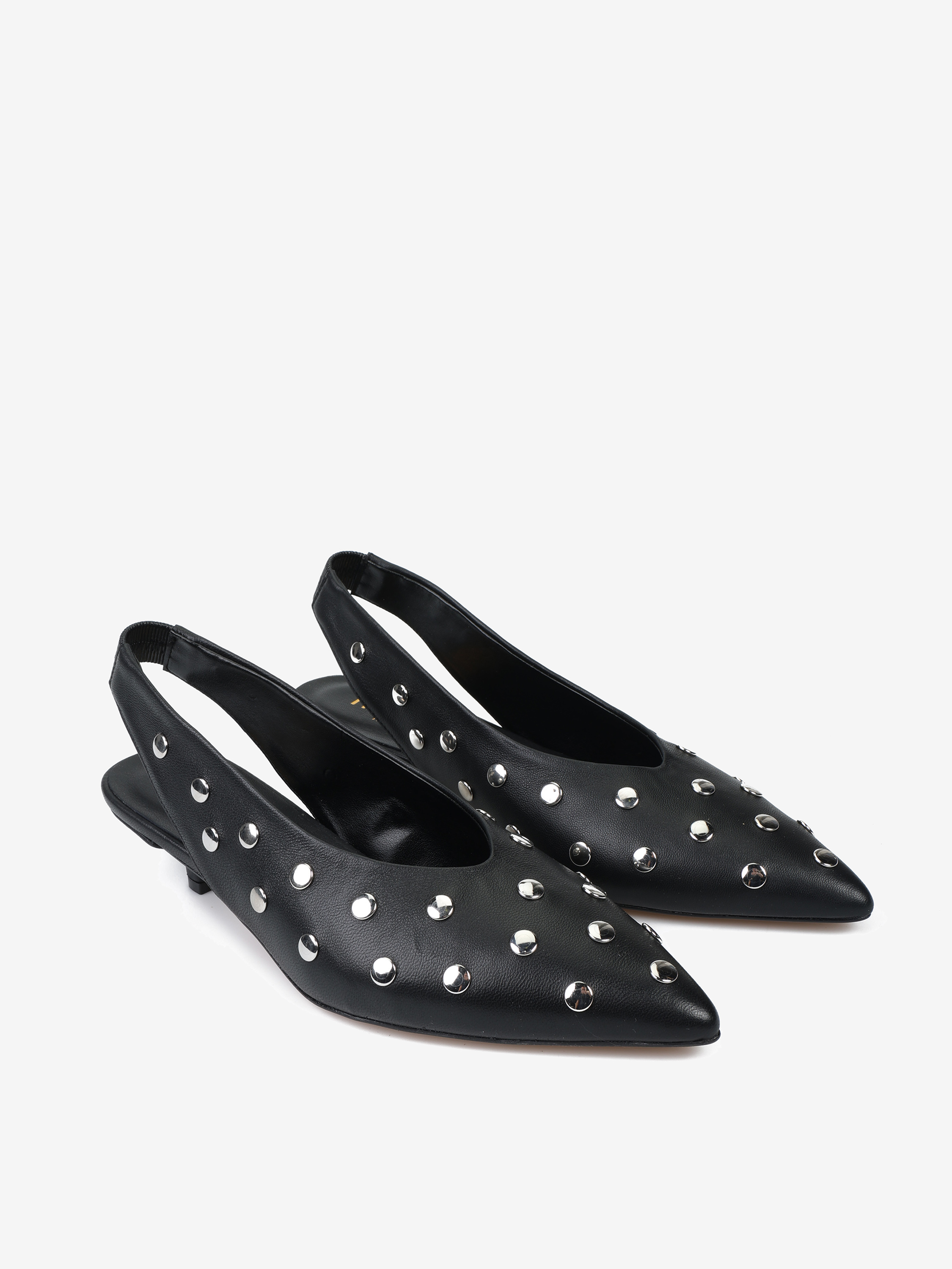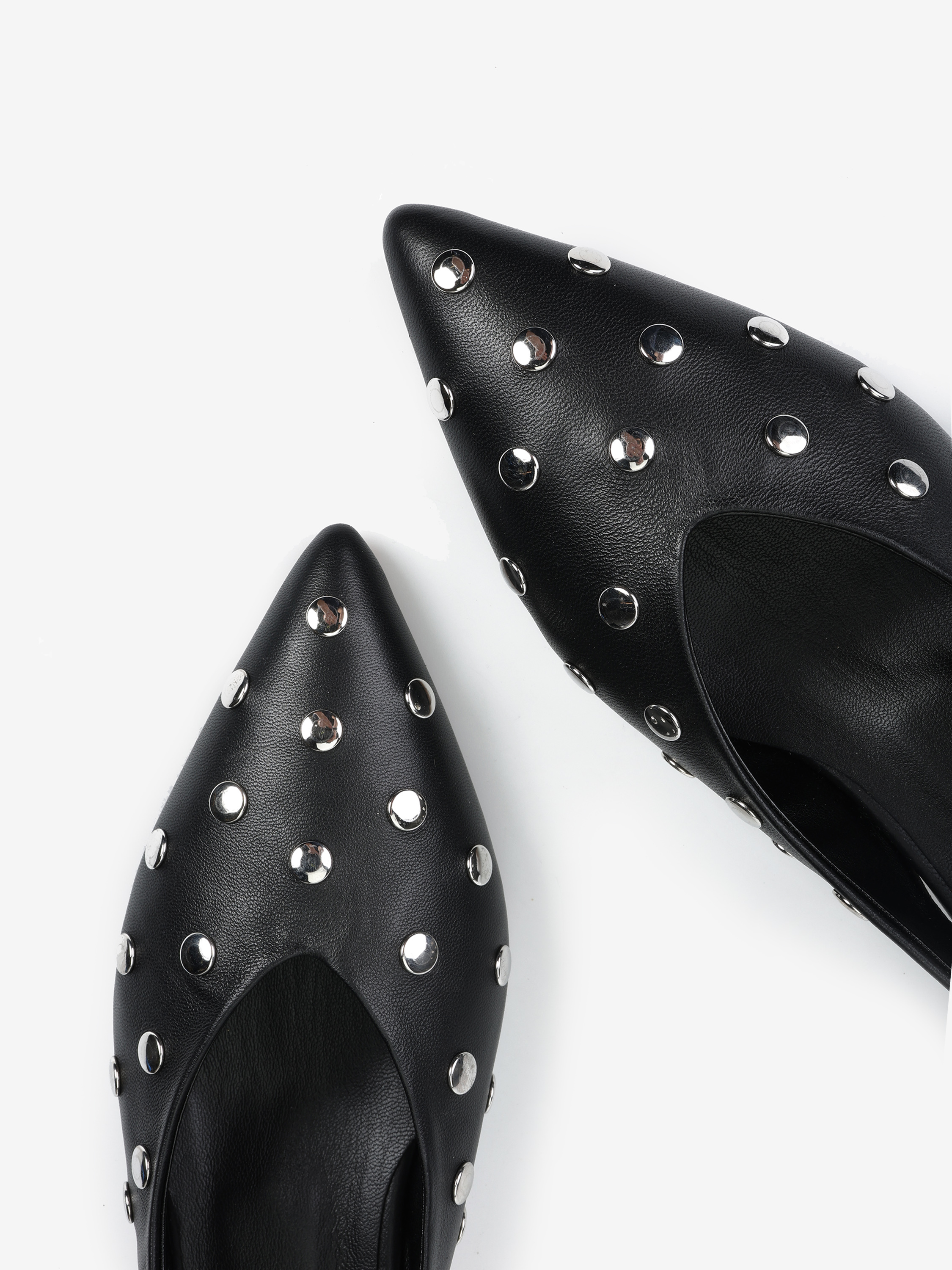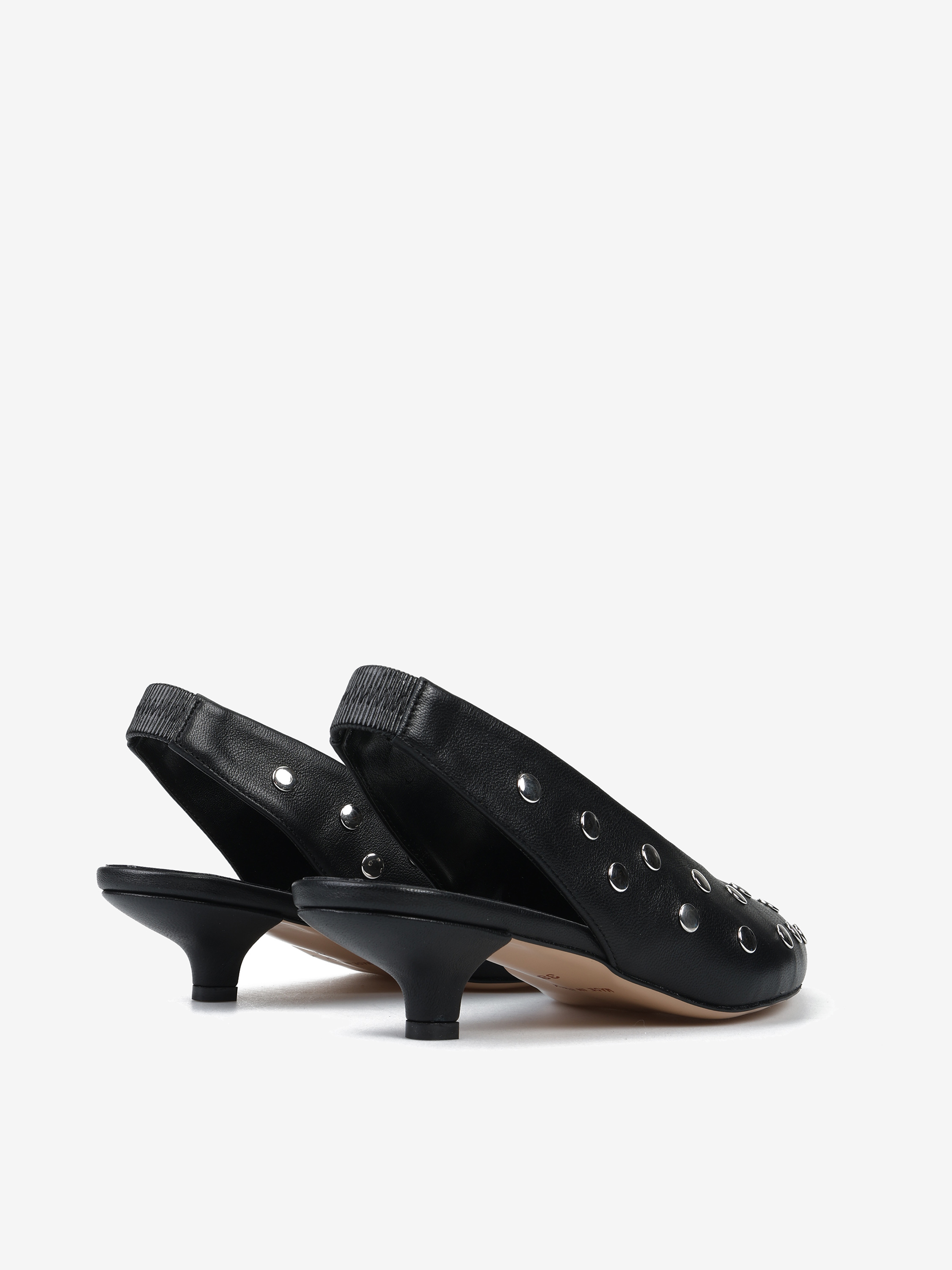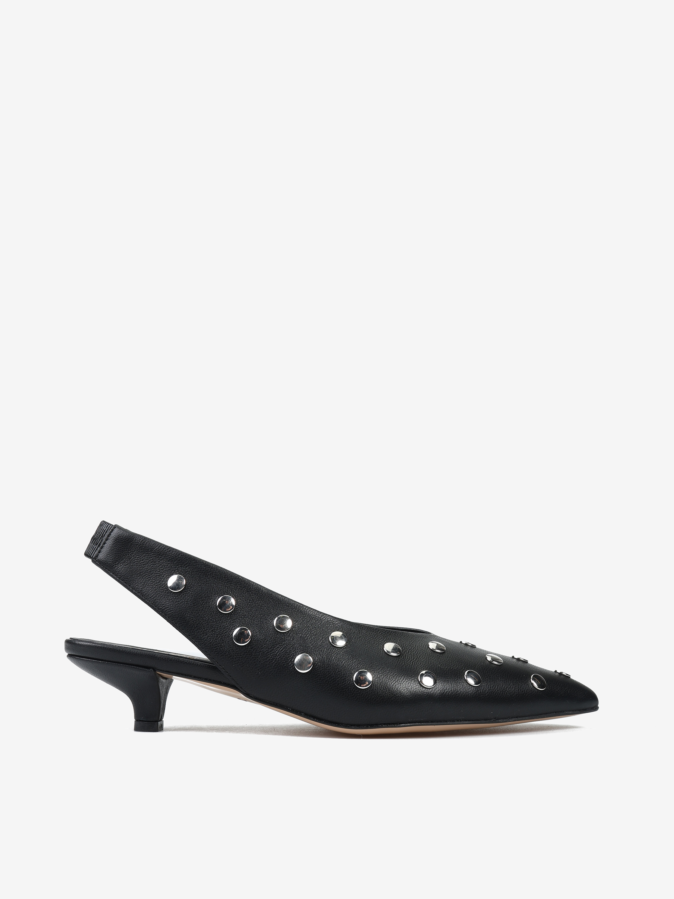 Szpilki z noskiem w szpic ze srebrnymi ćwiekami. Odkryta pięta z paskiem dopasowującym się do stopy.