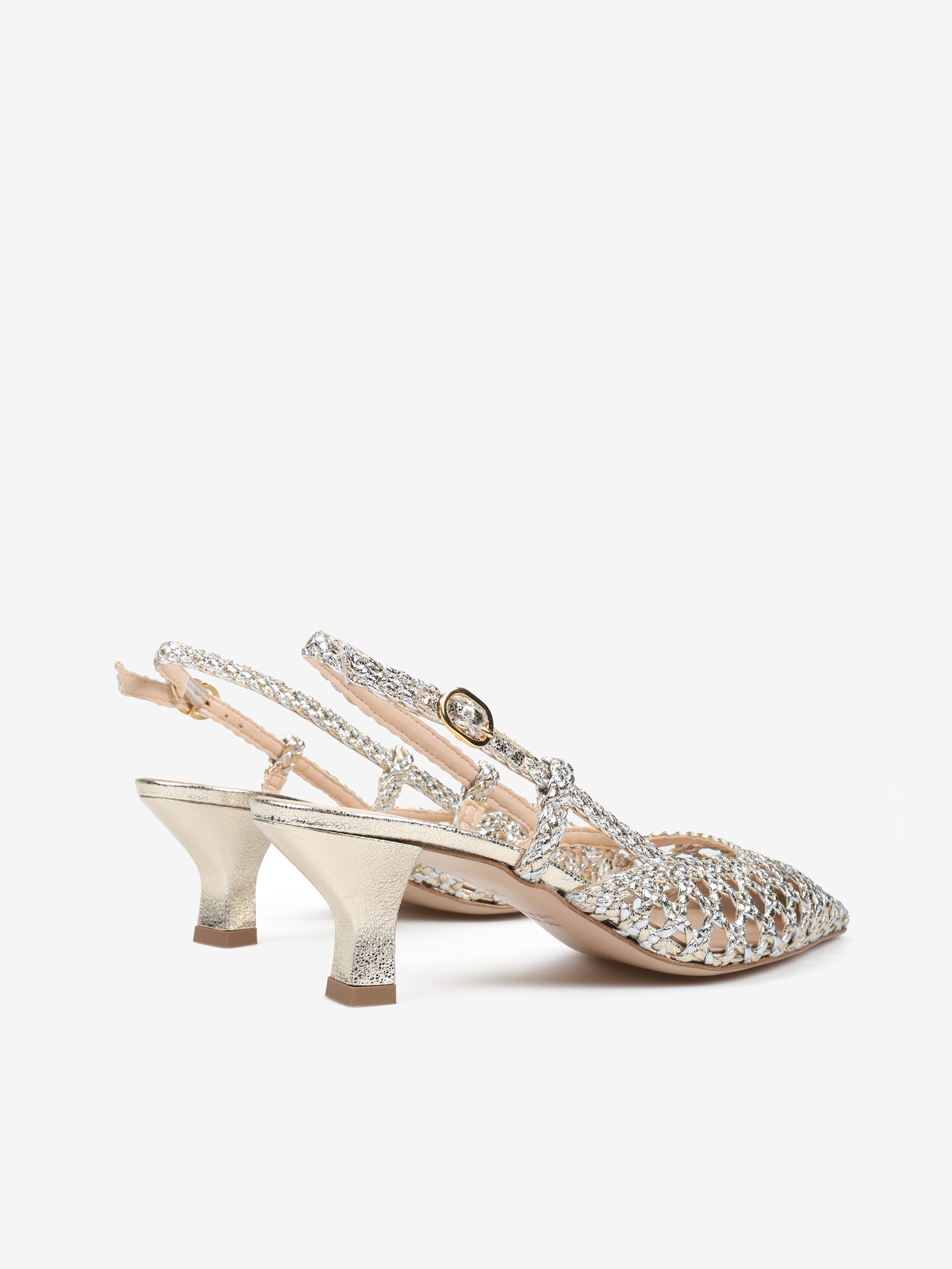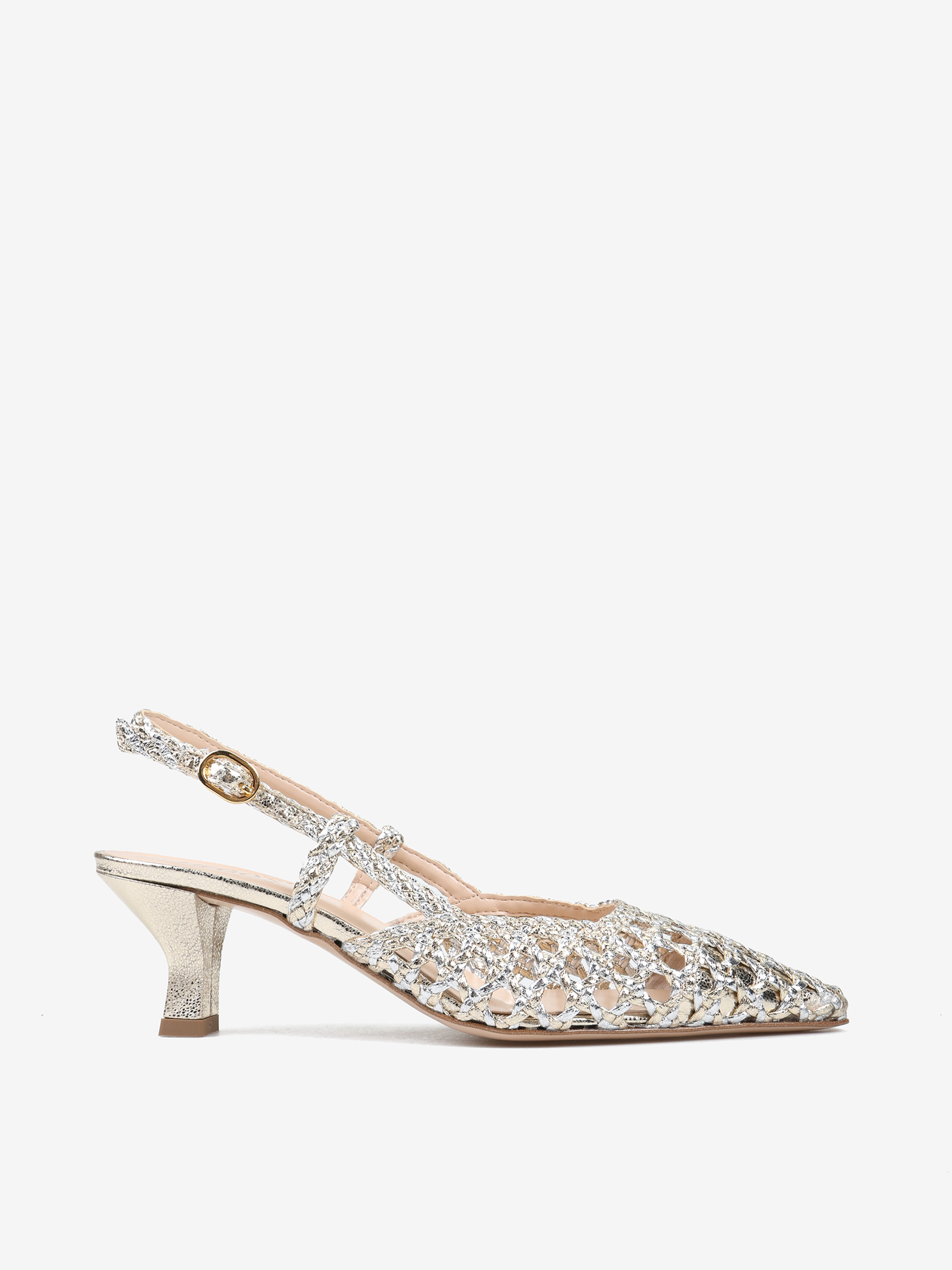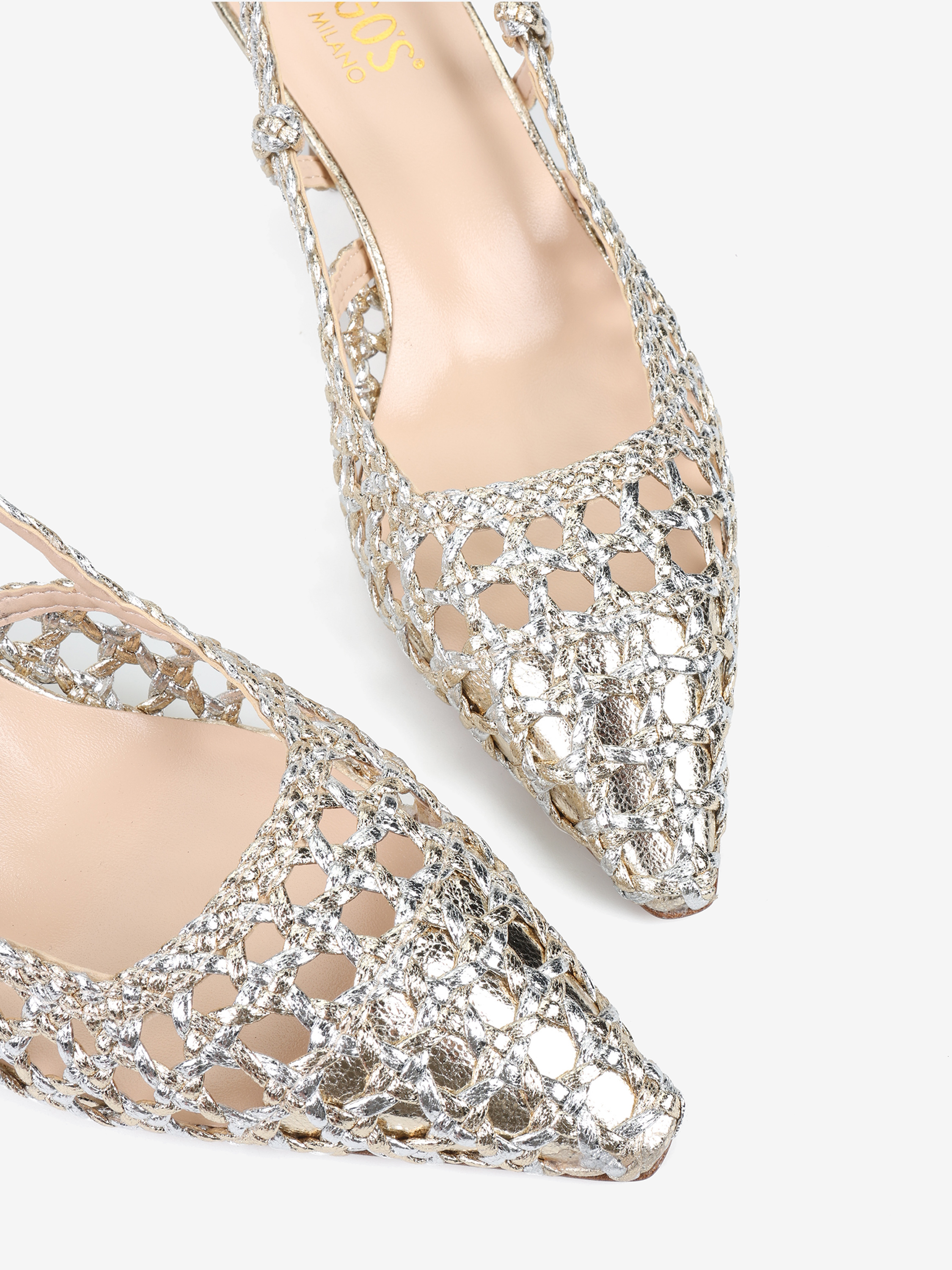 Szpilki z noskiem w szpic wykonane ze skórzanej, srebrno-złotej plecionki. Odkryta pięta z regulowanym paskiem.