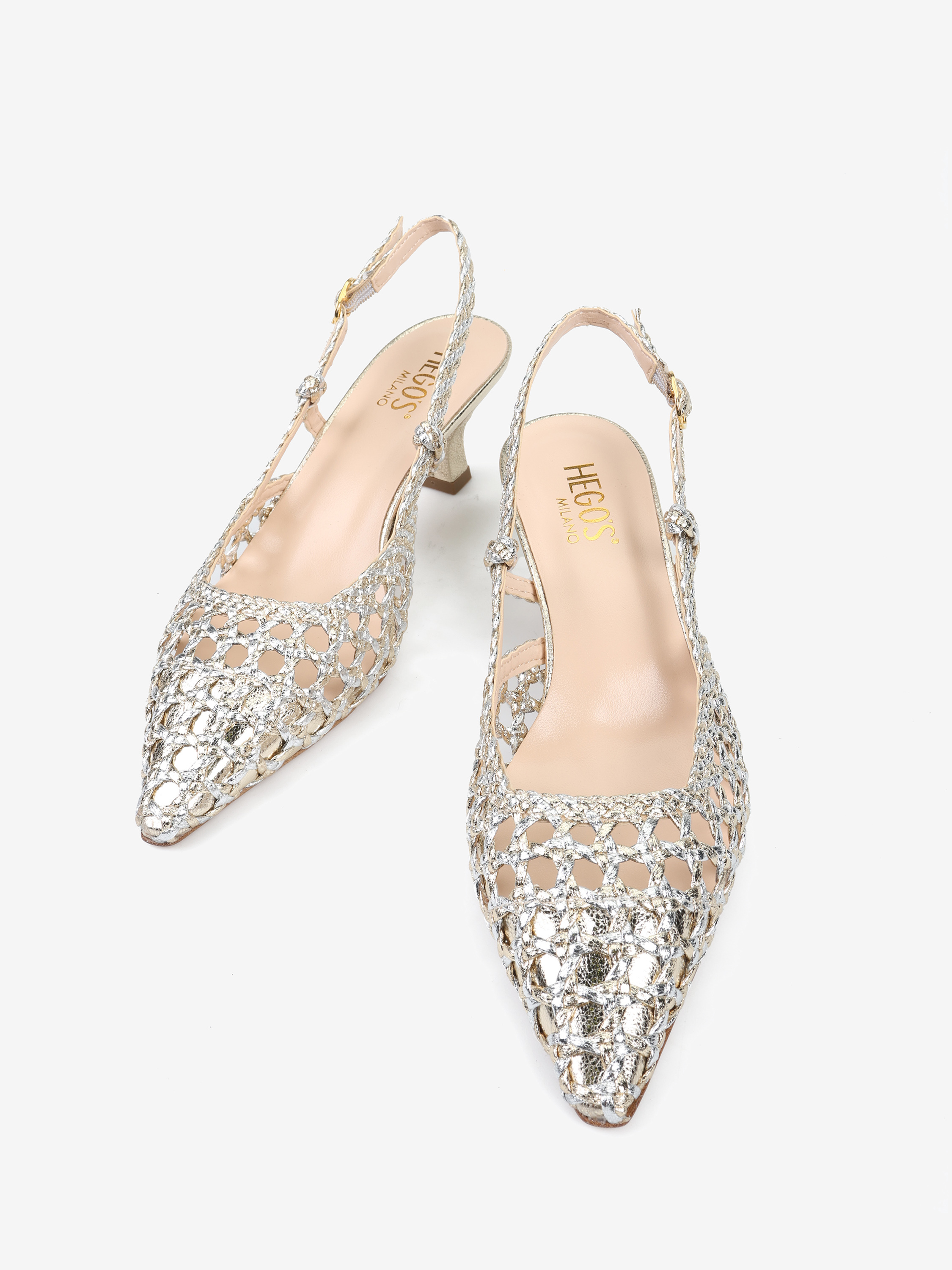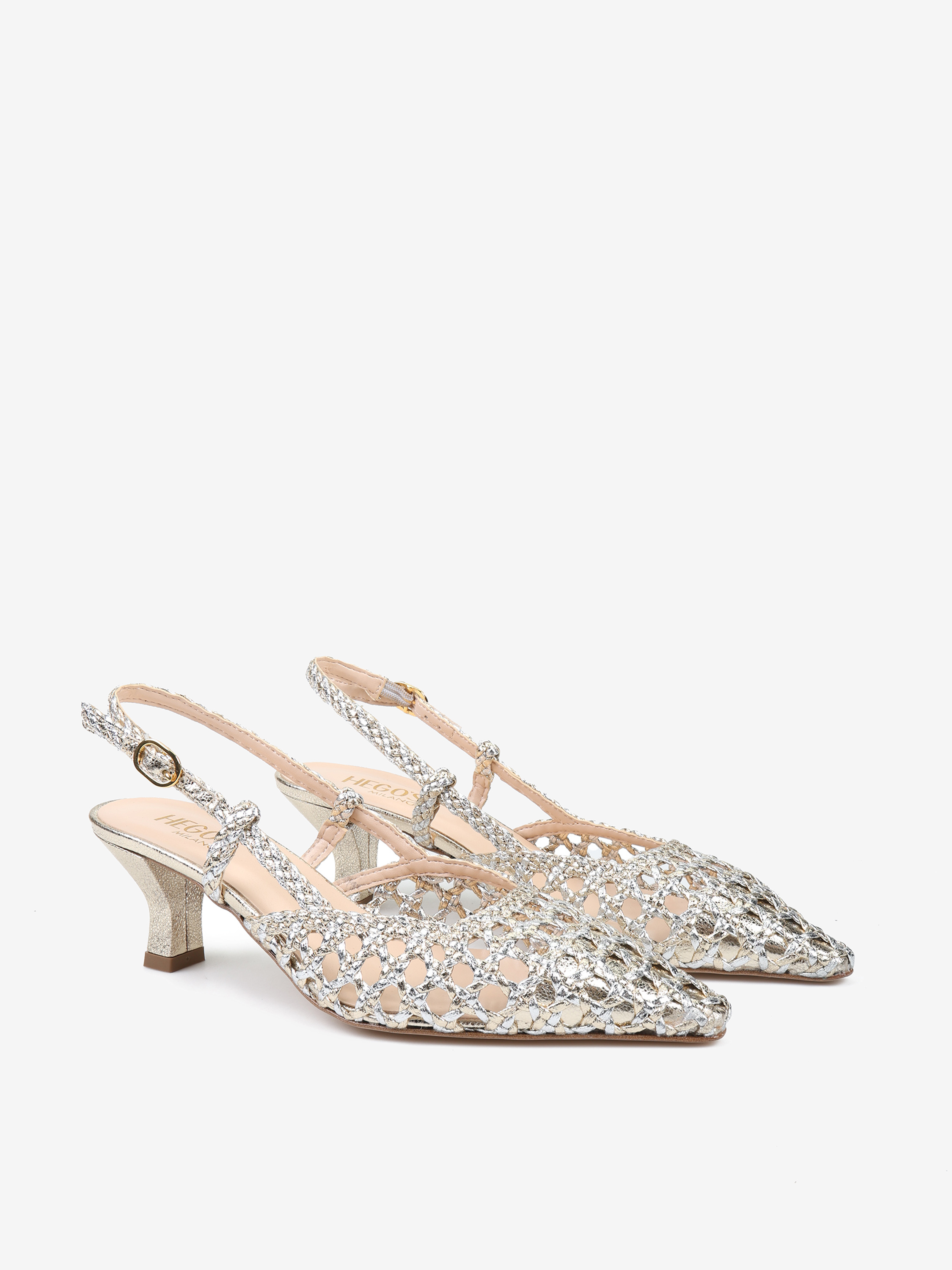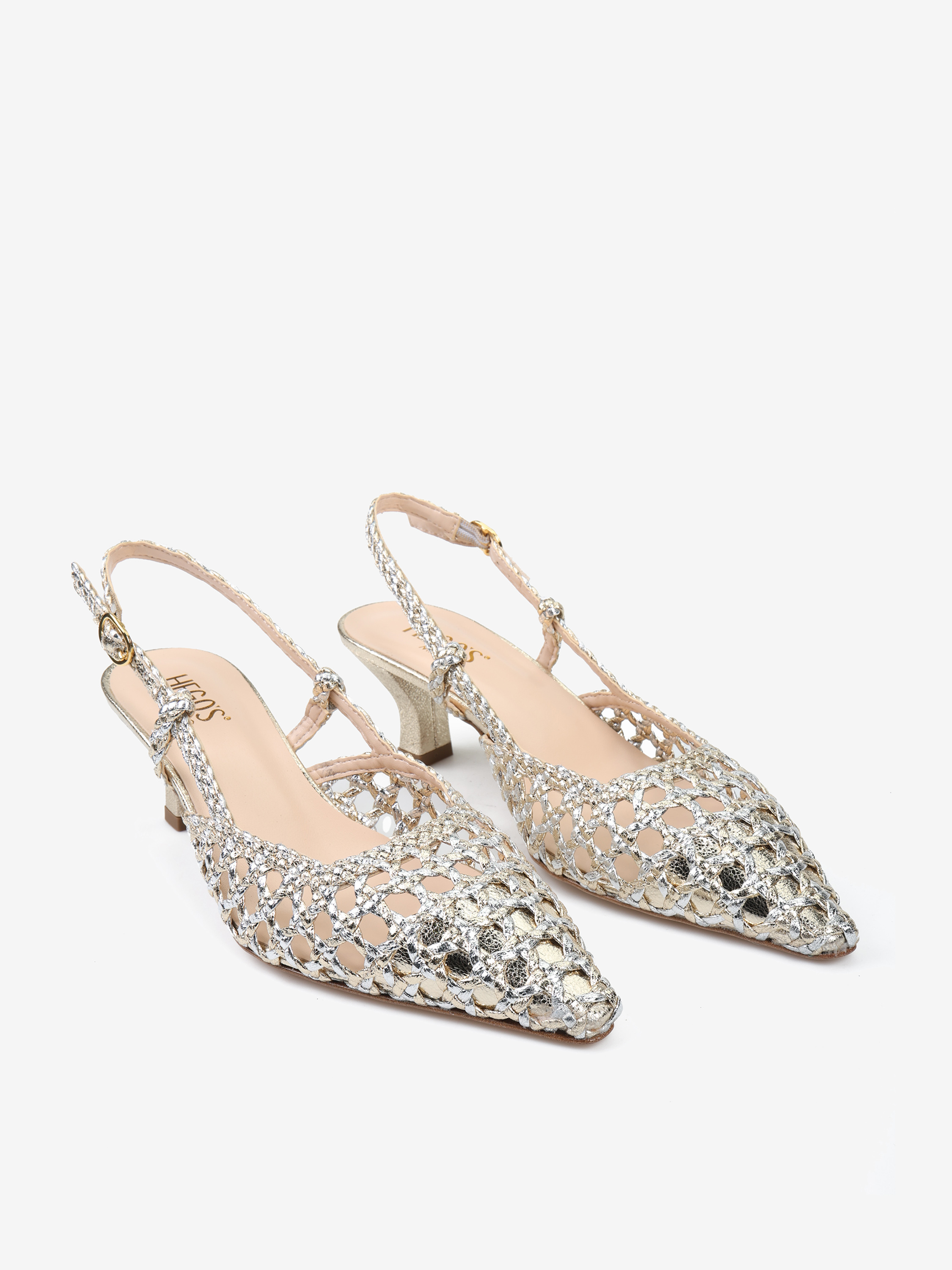 Szpilki z noskiem w szpic wykonane ze skórzanej, srebrno-złotej plecionki. Odkryta pięta z regulowanym paskiem.