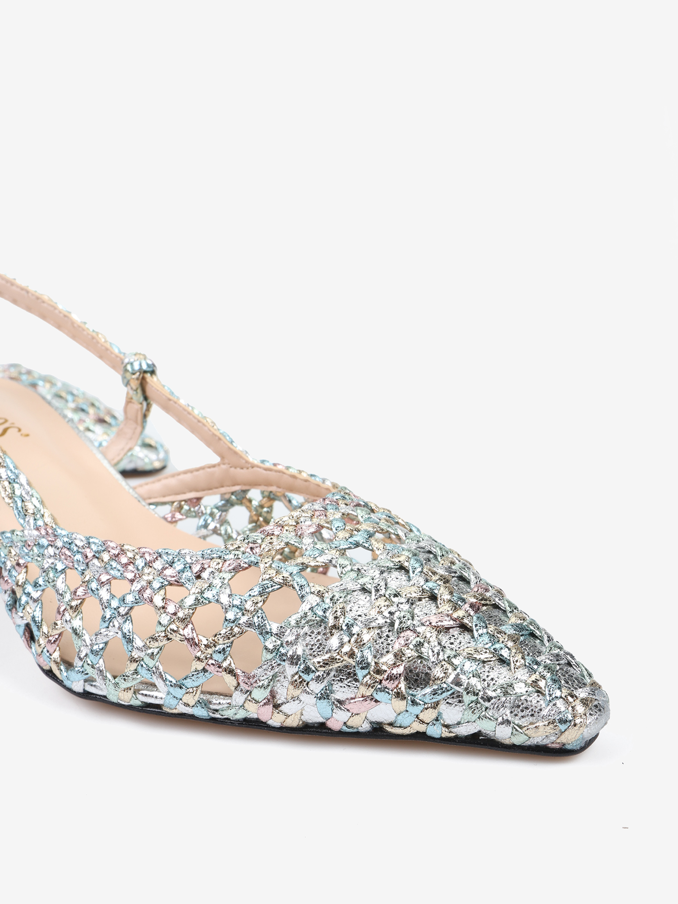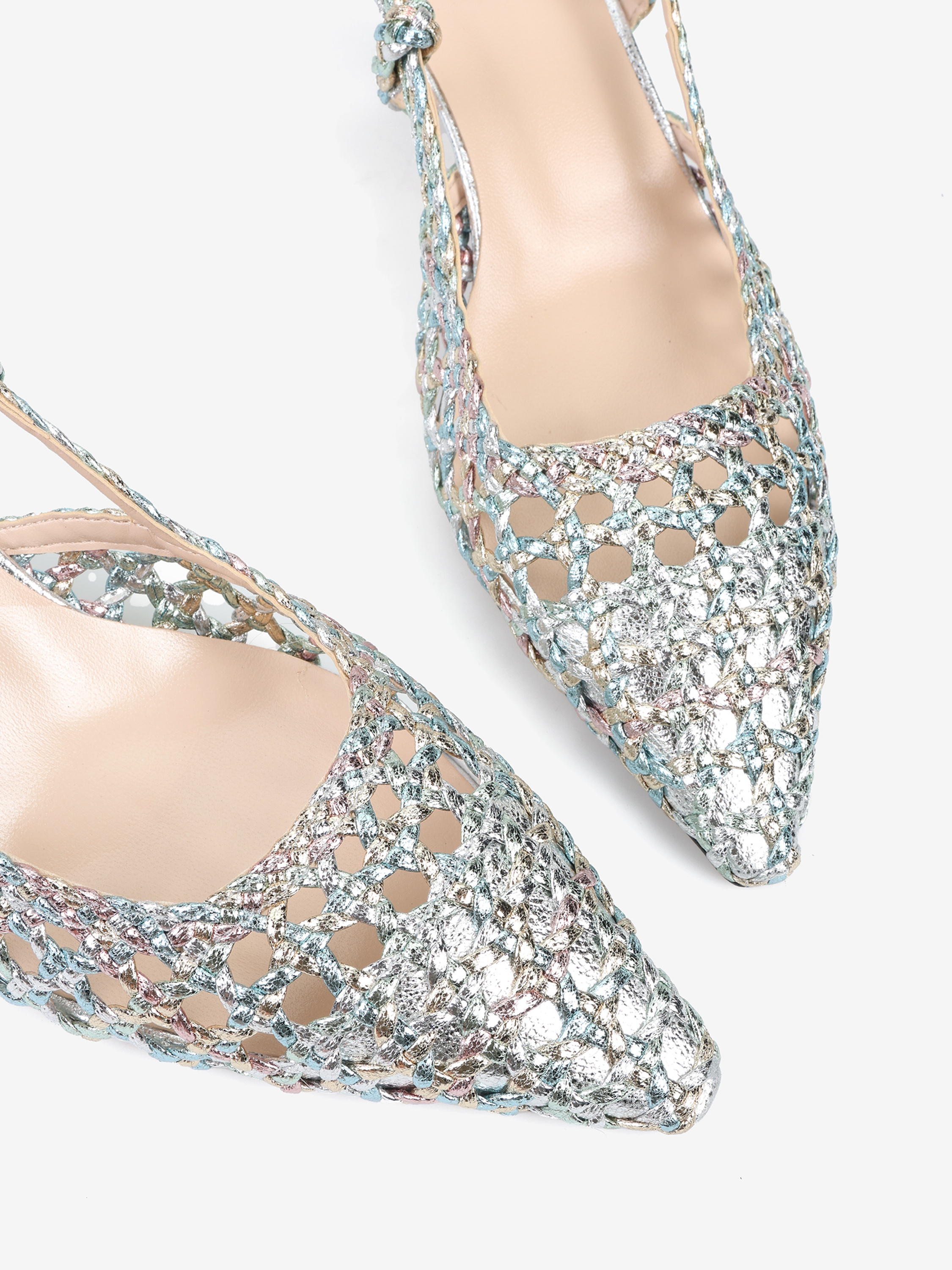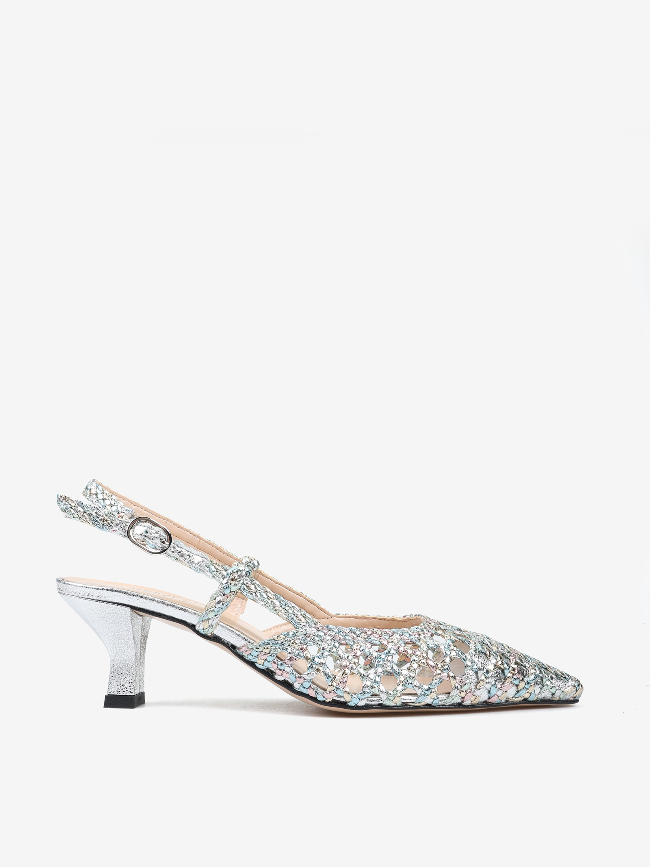 Szpilki z noskiem w szpic wykonane ze skórzanej, metalicznej, wielobarwnej plecionki. Odkryta pięta z regulowanym paskiem.