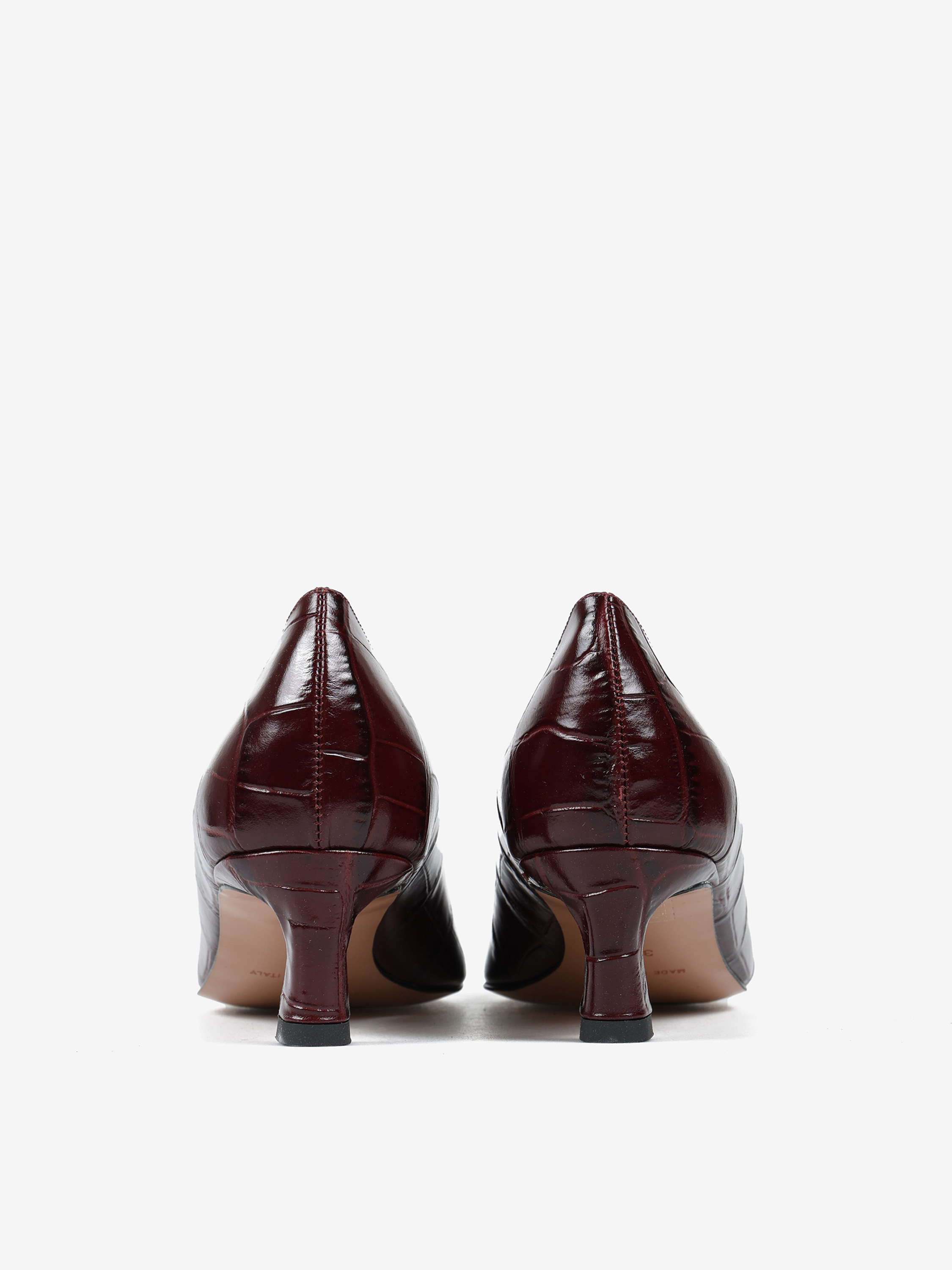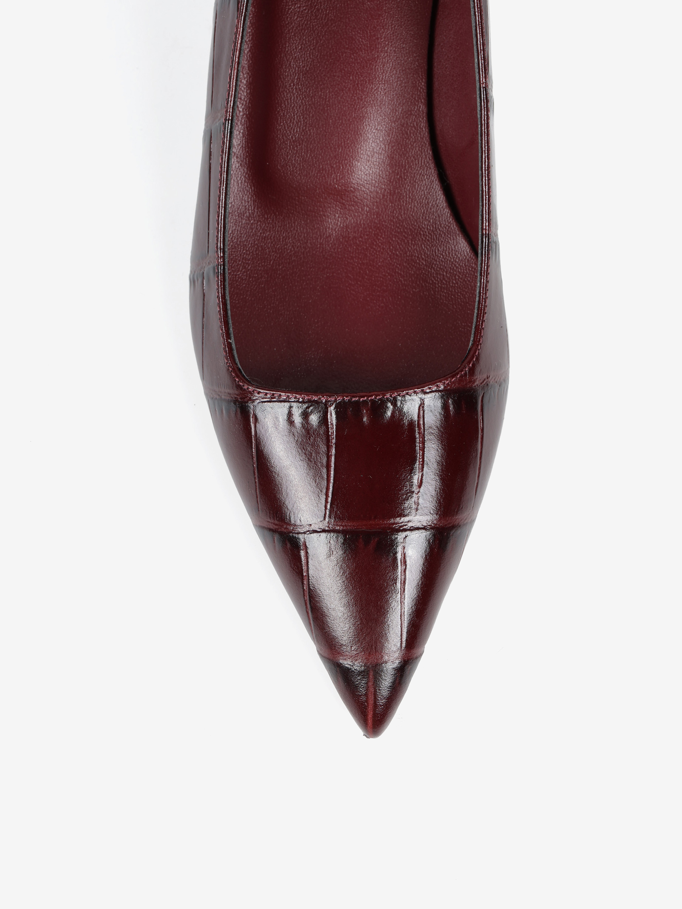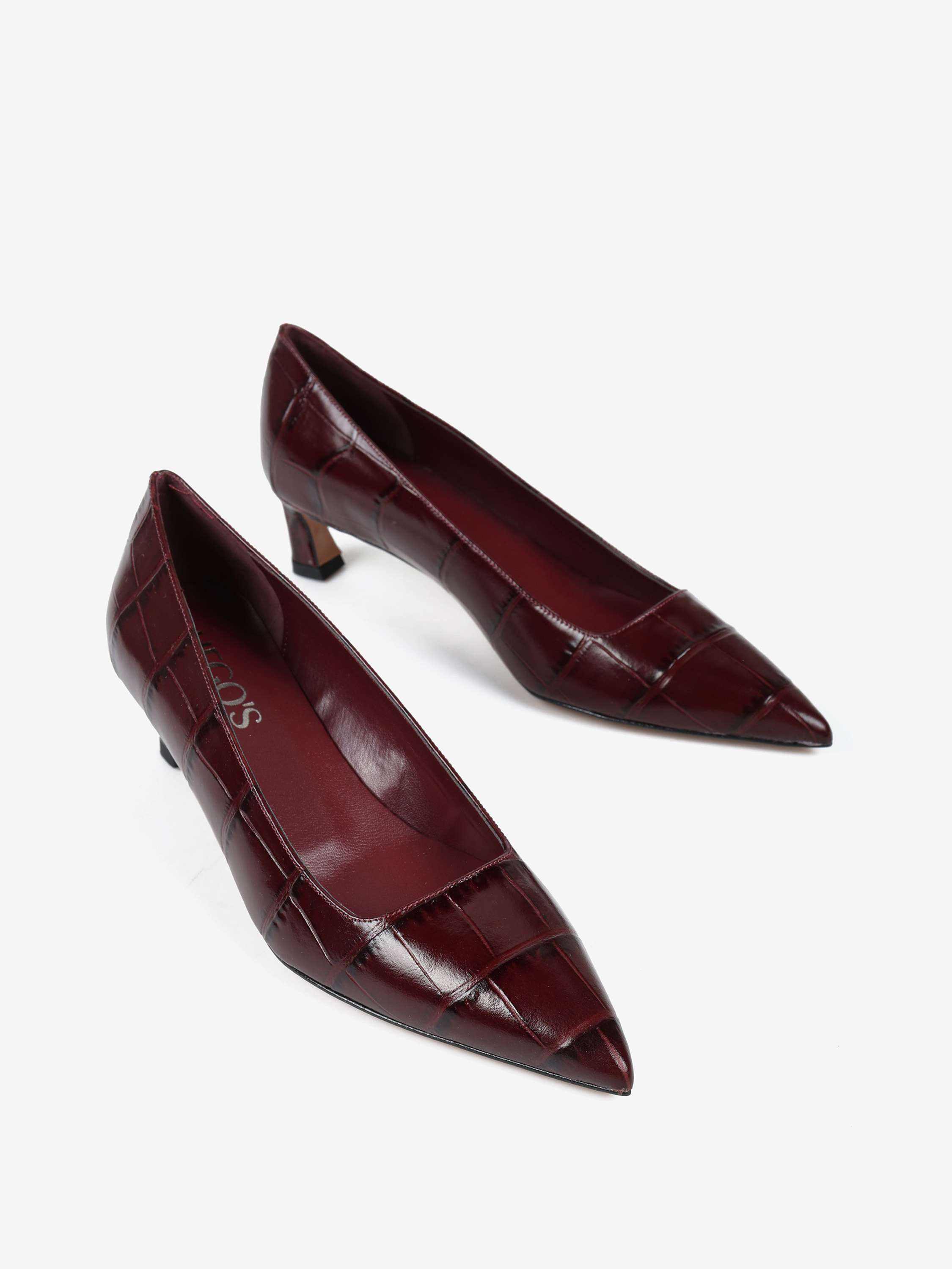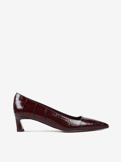 Niskie szpilki wykonane ze skóry w krokodyli wzór. Kwadratowe wycięcie i nosek w szpic.