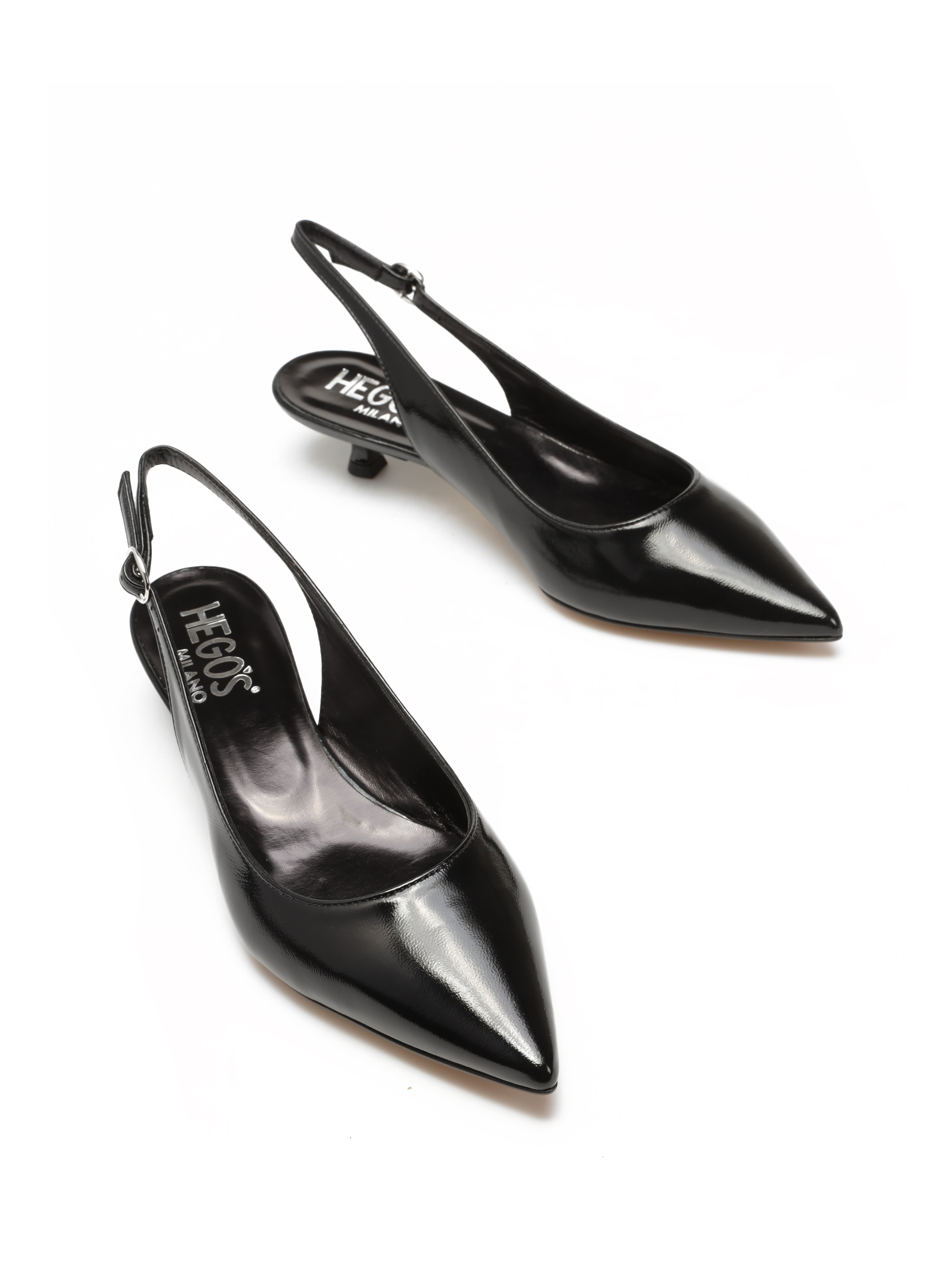 Szpilki z odkrytą piętą wykonane są z lakierowanej skóry. Model w szpic w czarnym kolorze. Zapinane przy kostce regulowanym paskiem na sprzączkę. Posiadają niski, wygodny obcas na szpilce.
