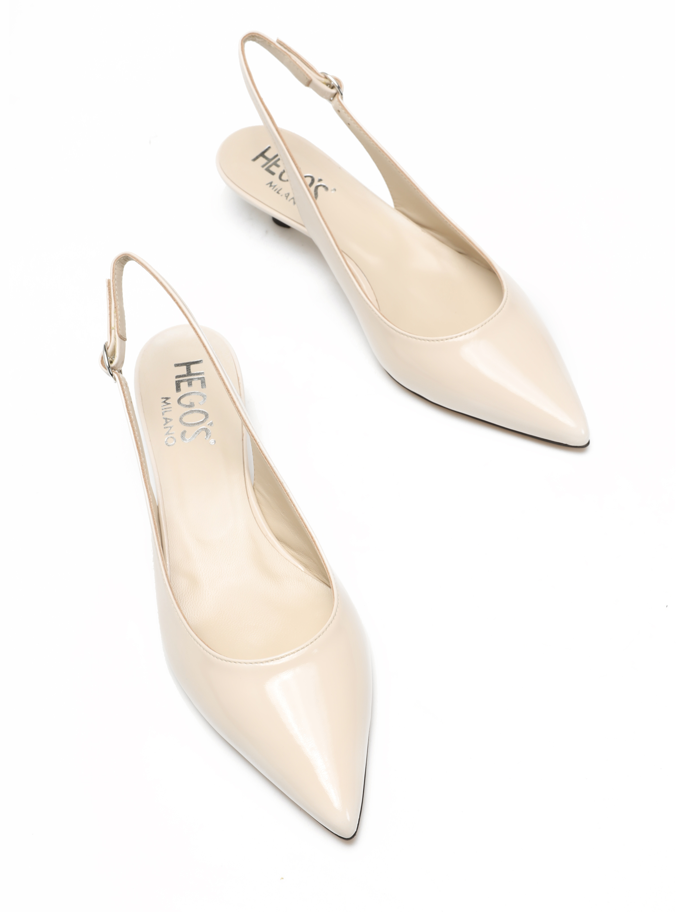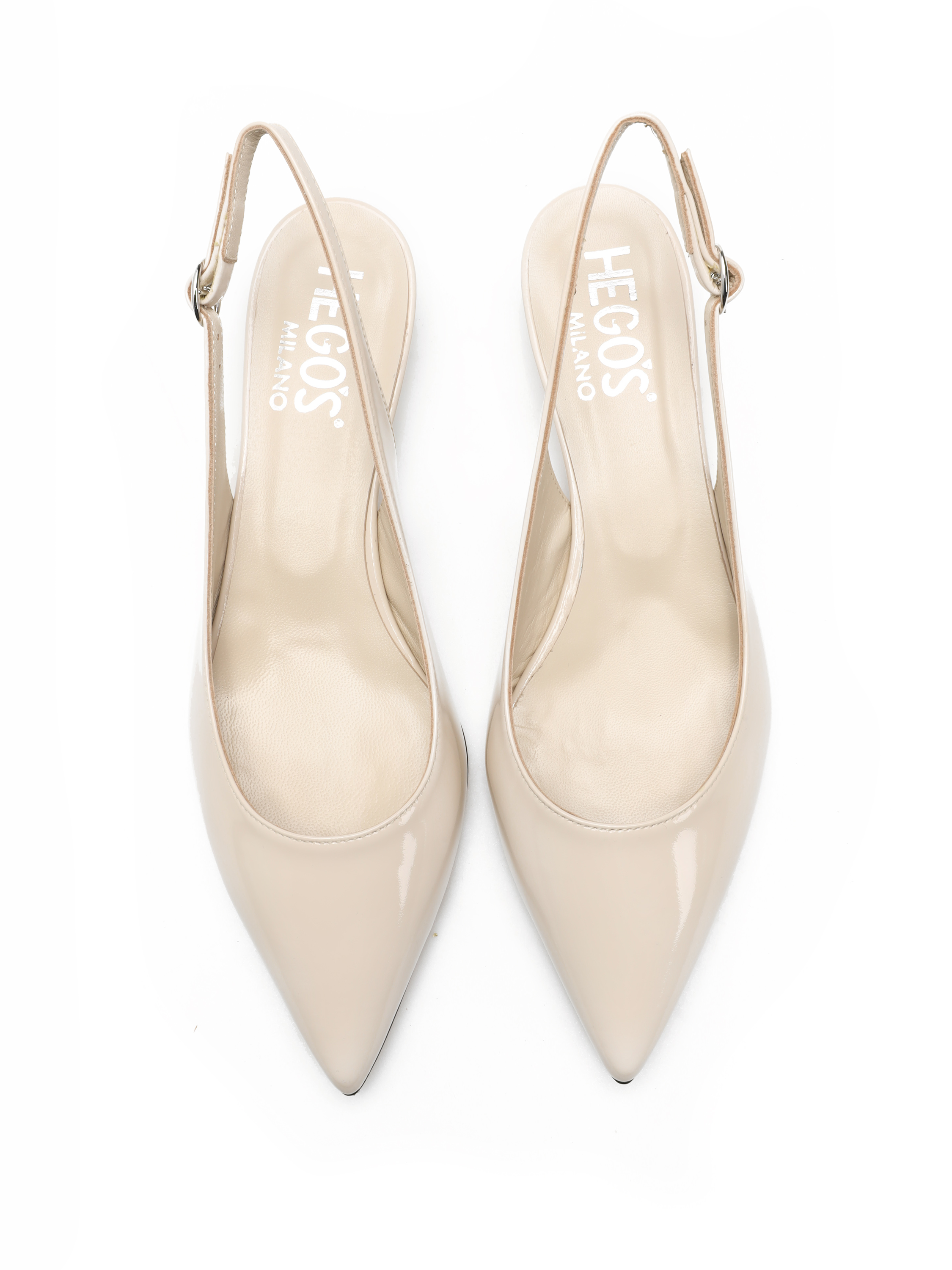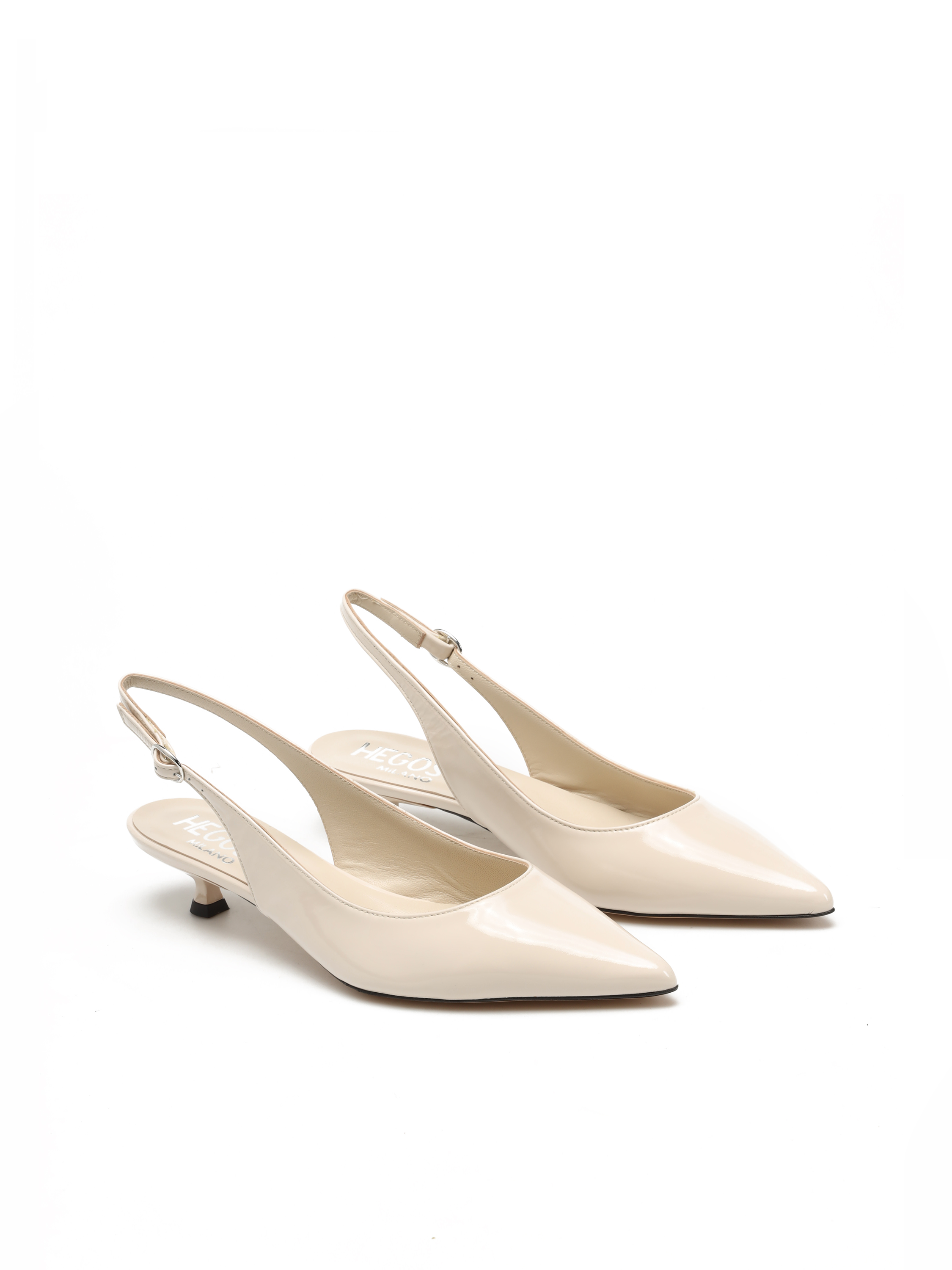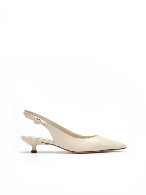 Szpilki z odkrytą piętą wykonane są z lakierowanej skóry. Model w szpic w kremowym kolorze. Zapinane przy kostce regulowanym paskiem na sprzączkę. Posiadają niski, wygodny obcas na szpilce.