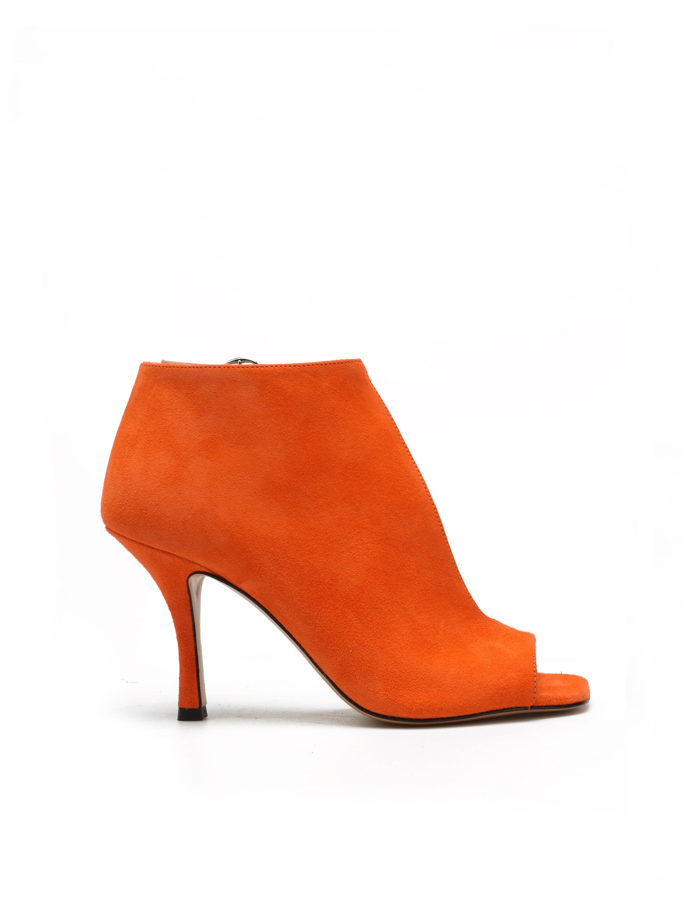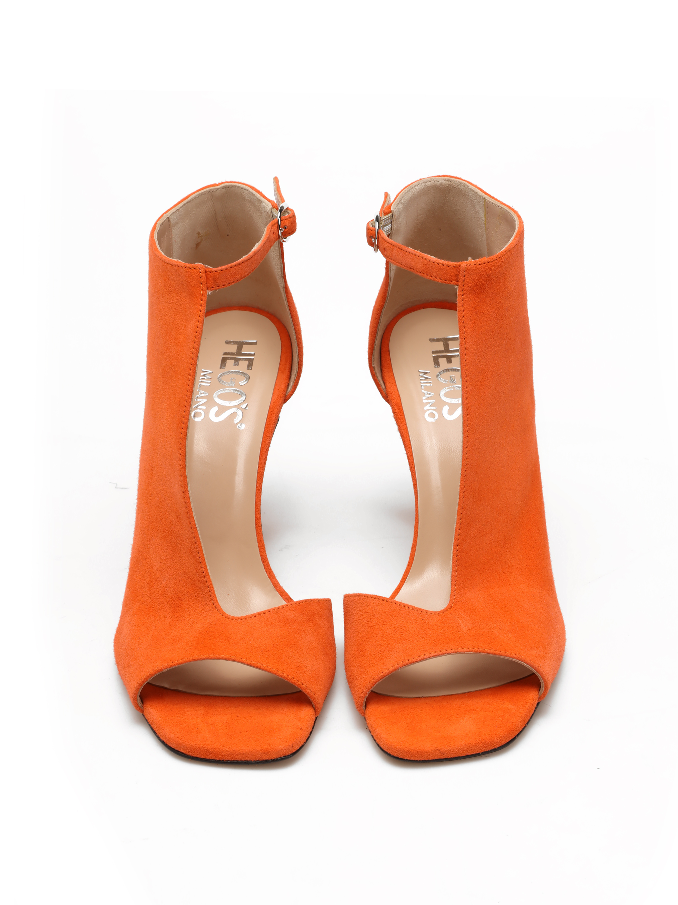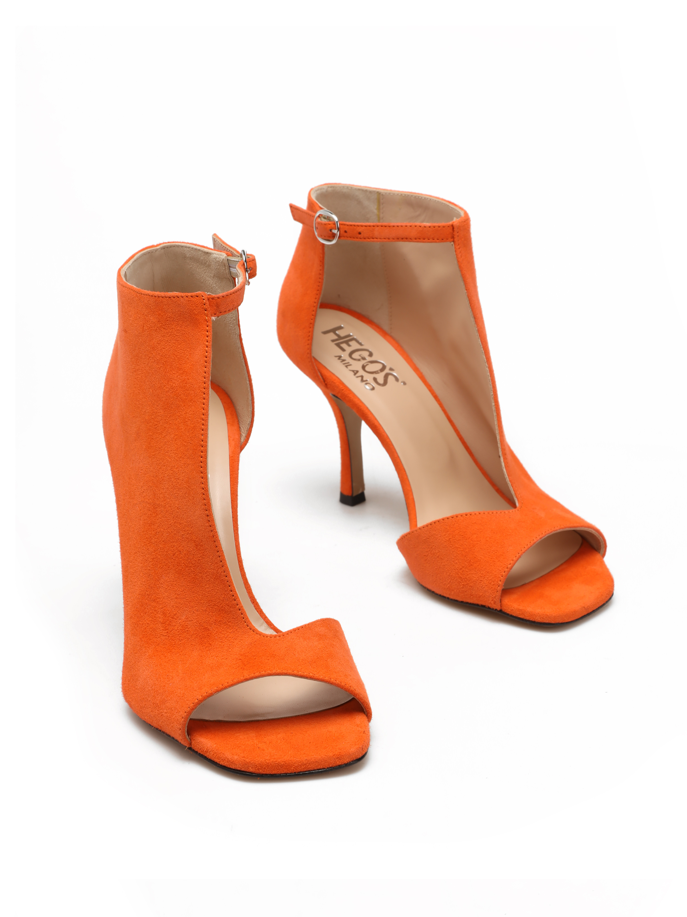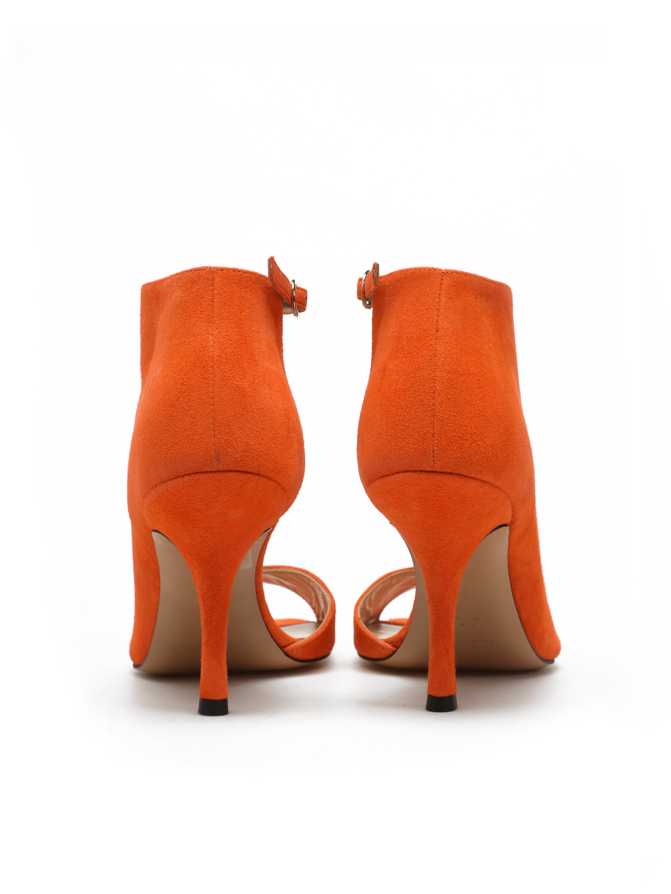 Szpilki z odkrytymi palcami to Trend sezonu. Cholewka za kostkę w modnym, pomarańczowym kolorze wykonana jest z zamszowej skóry. Zaprojektowana została tak, aby odkrywać wewnętrzną część stopy. Przy kostce zapinana regulowanym paskiem na sprzączkę. Model osadzony na stabilnym obcasie na szpilce.