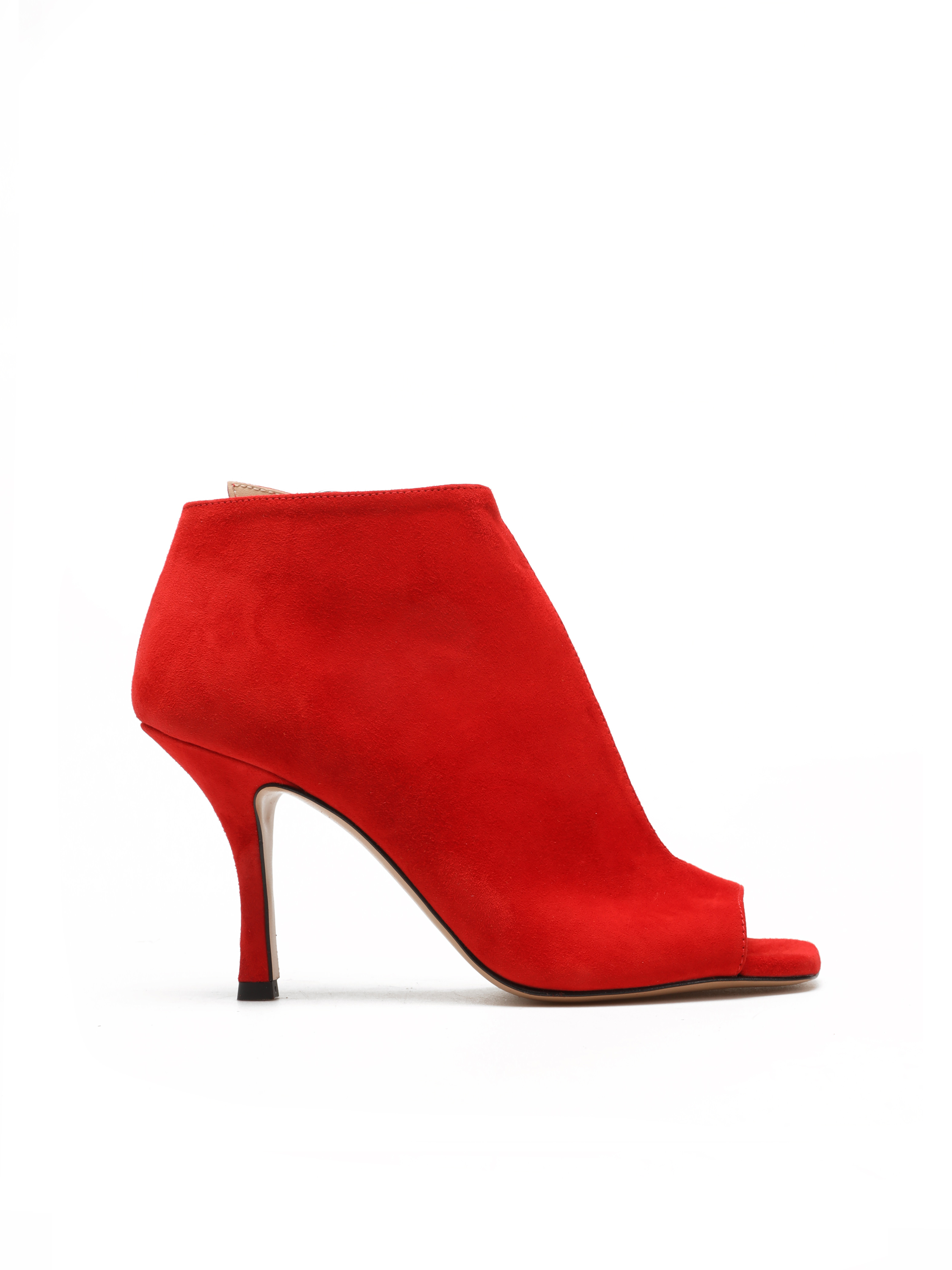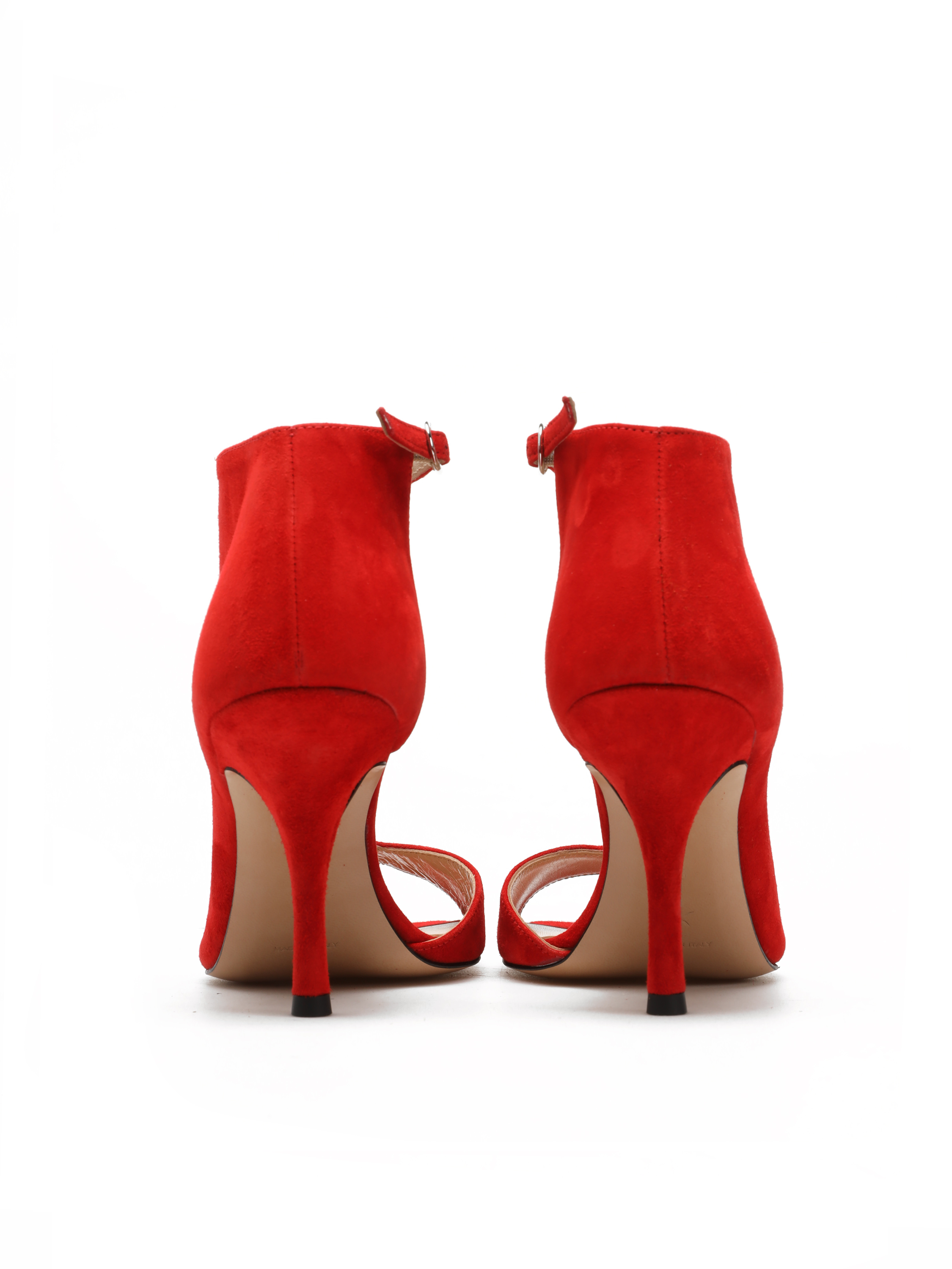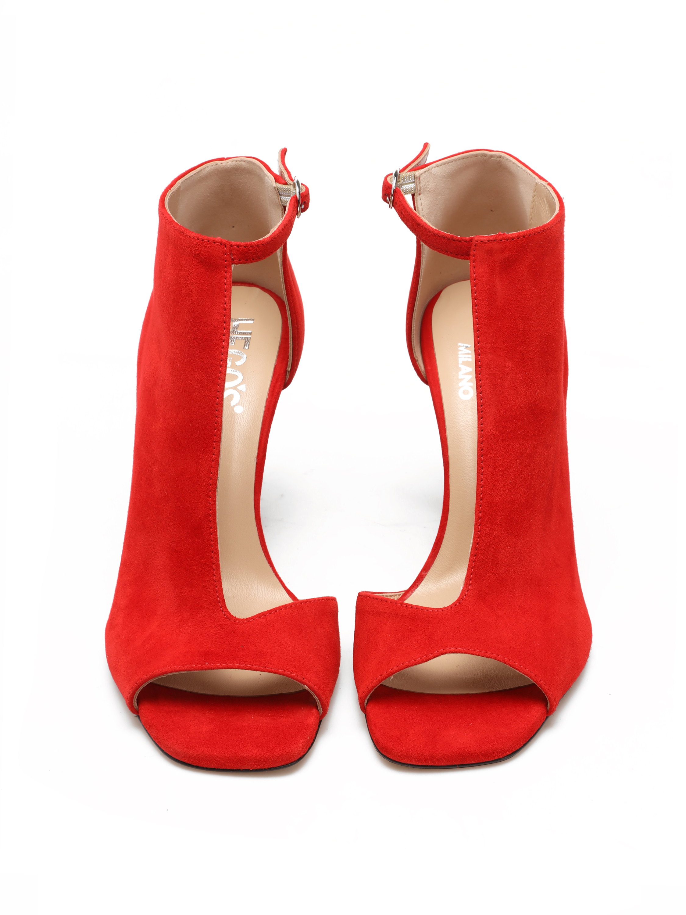 Szpilki z odkrytymi palcami to Trend sezonu. Cholewka za kostkę w czerwonym kolorze wykonana jest z zamszowej skóry. Zaprojektowana została tak, aby odkrywać wewnętrzną część stopy. Przy kostce zapinana regulowanym paskiem na sprzączkę. Model osadzony na stabilnym obcasie na szpilce.