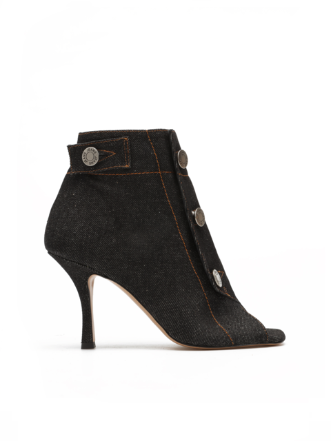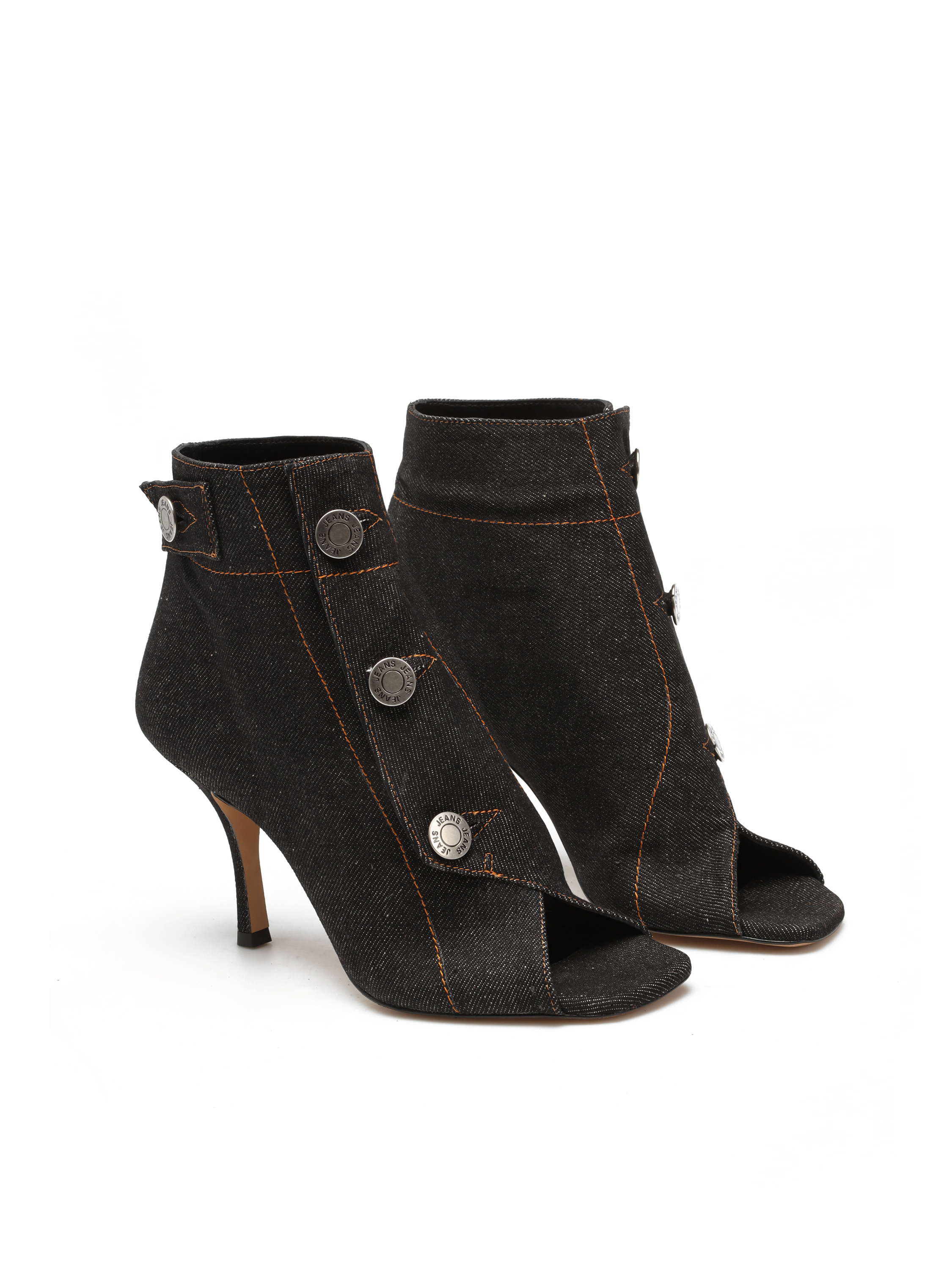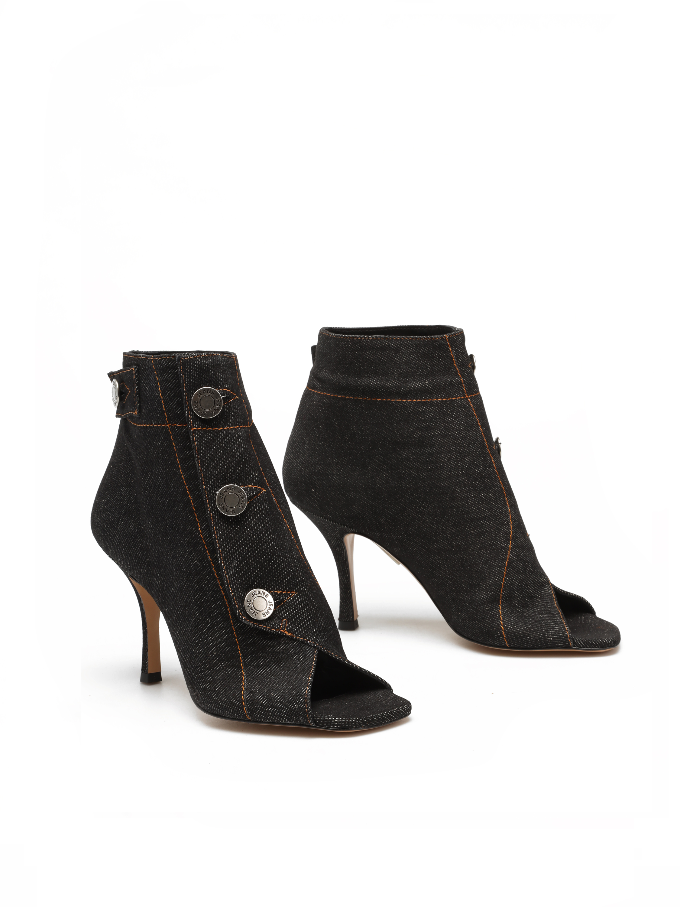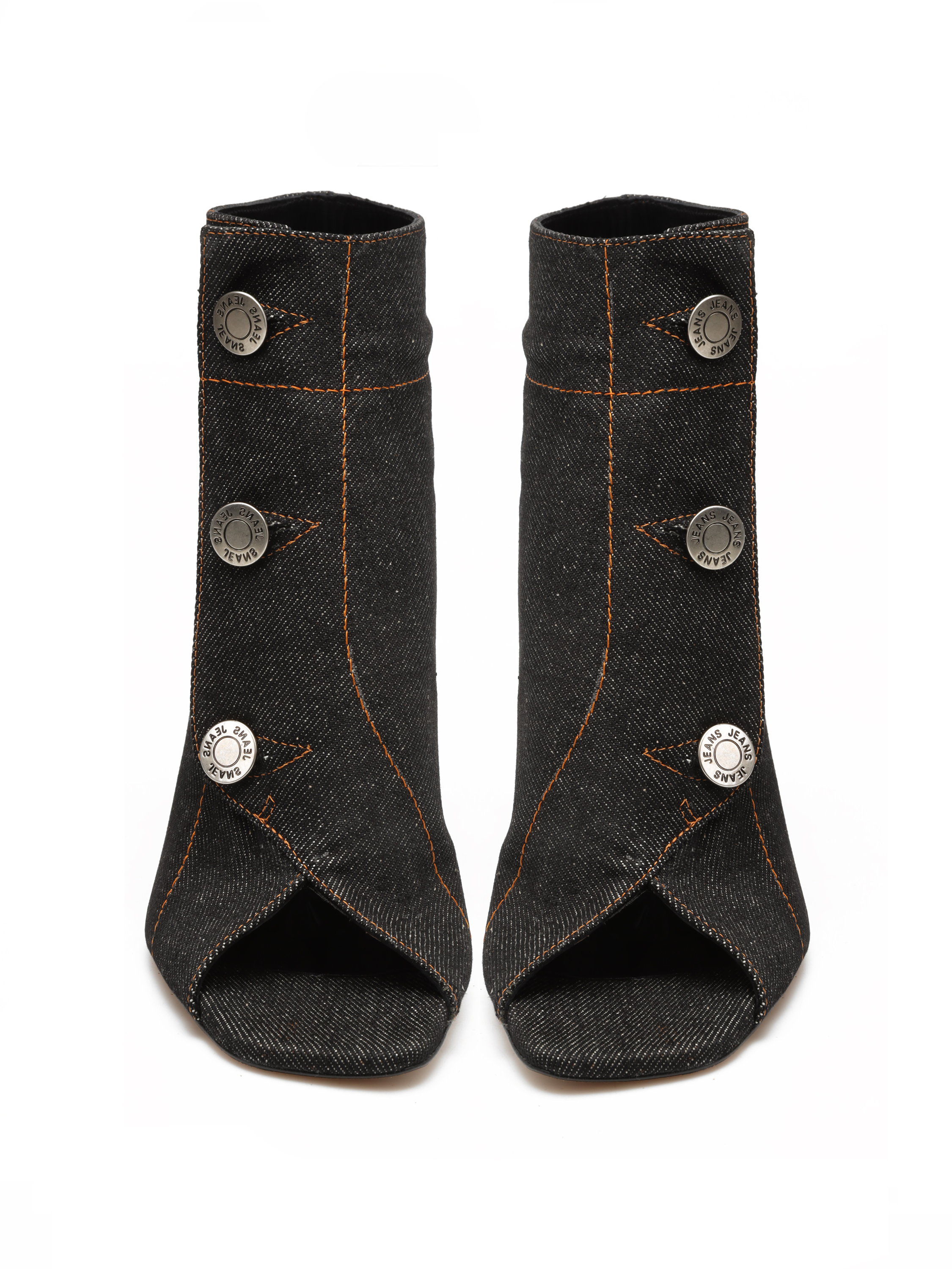 Botki z odkrytymi palcami wykonane są z jeansowego materiału. Cholewka za kostkę w granatowym kolorze zapinana jest na stylowe guziki. Model osadzony jest na stablinym obcasie na szpilce.