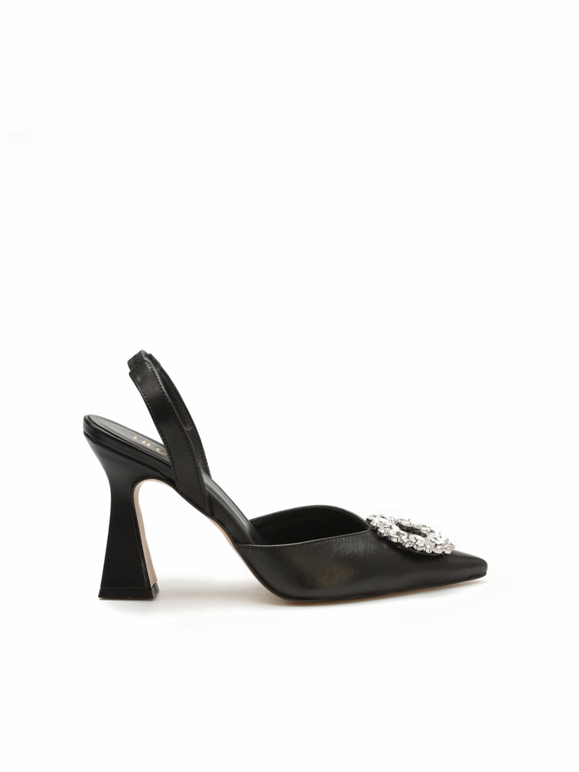 Postaw na 100% kobiecości wybierając czarne szpilki z odkrytą piętą na stabilnym asymetrycznym obcasie. Ich największymi atutami są uniwersalność, delikatność i przepiękny wygląd. Wykonane z najwyższej jakosci skóry zapewnią Ci najwyższy komfort użytkowania. Niebanalna ozdoba na czubie buta sprawi, że Twoja stylizacja obejdzie się już bez biżuterii.
