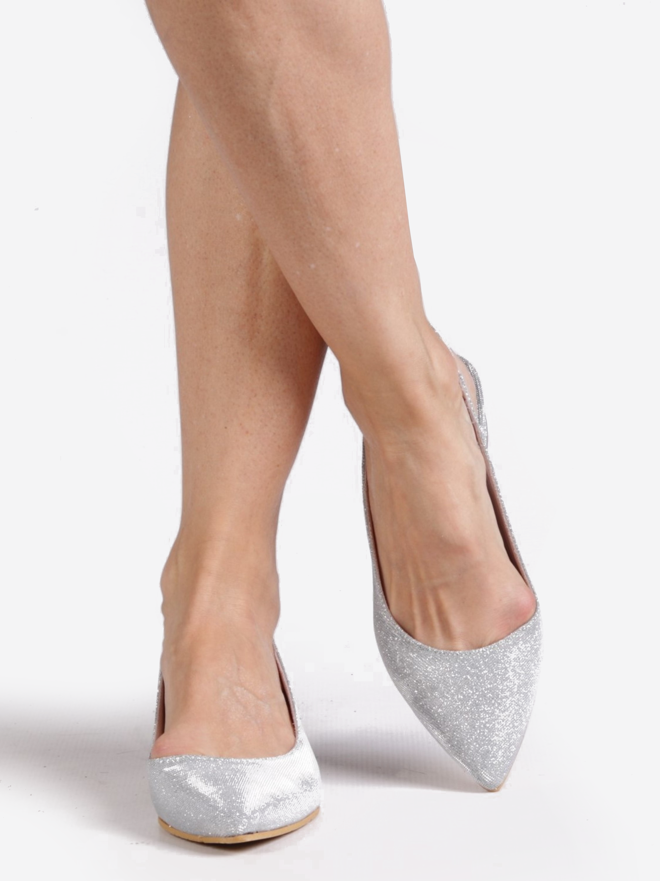 Baleriny z odkrytą pięta to model dla kobiet szukających eleganckich i wygodnych rozwiązań. Połyskująca cholewka posiada regulowany pasek zapinany na sprzączkę. Model w szpic na niskim obcasie na klocku.