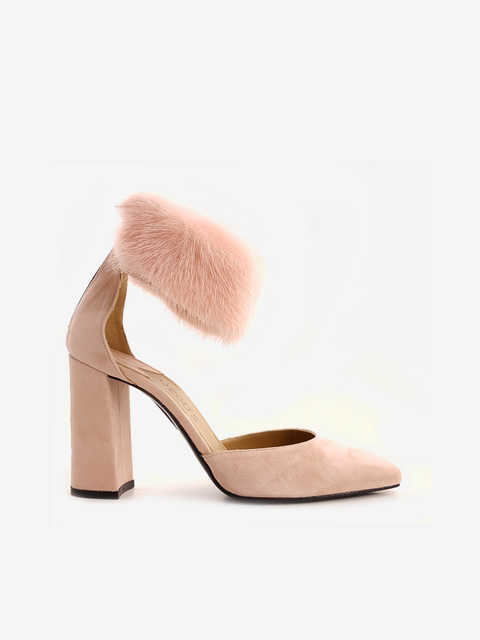 Szpilki w szpic wykonane z zamszowej skóry. Cholewka w delikatnym odcieniu różu. Zapinane na zamek błyskwiczny. Posiadają pasek wokół kostki obszyty syntetycznym futrem. Model osadzony na stabilnym obcasie.