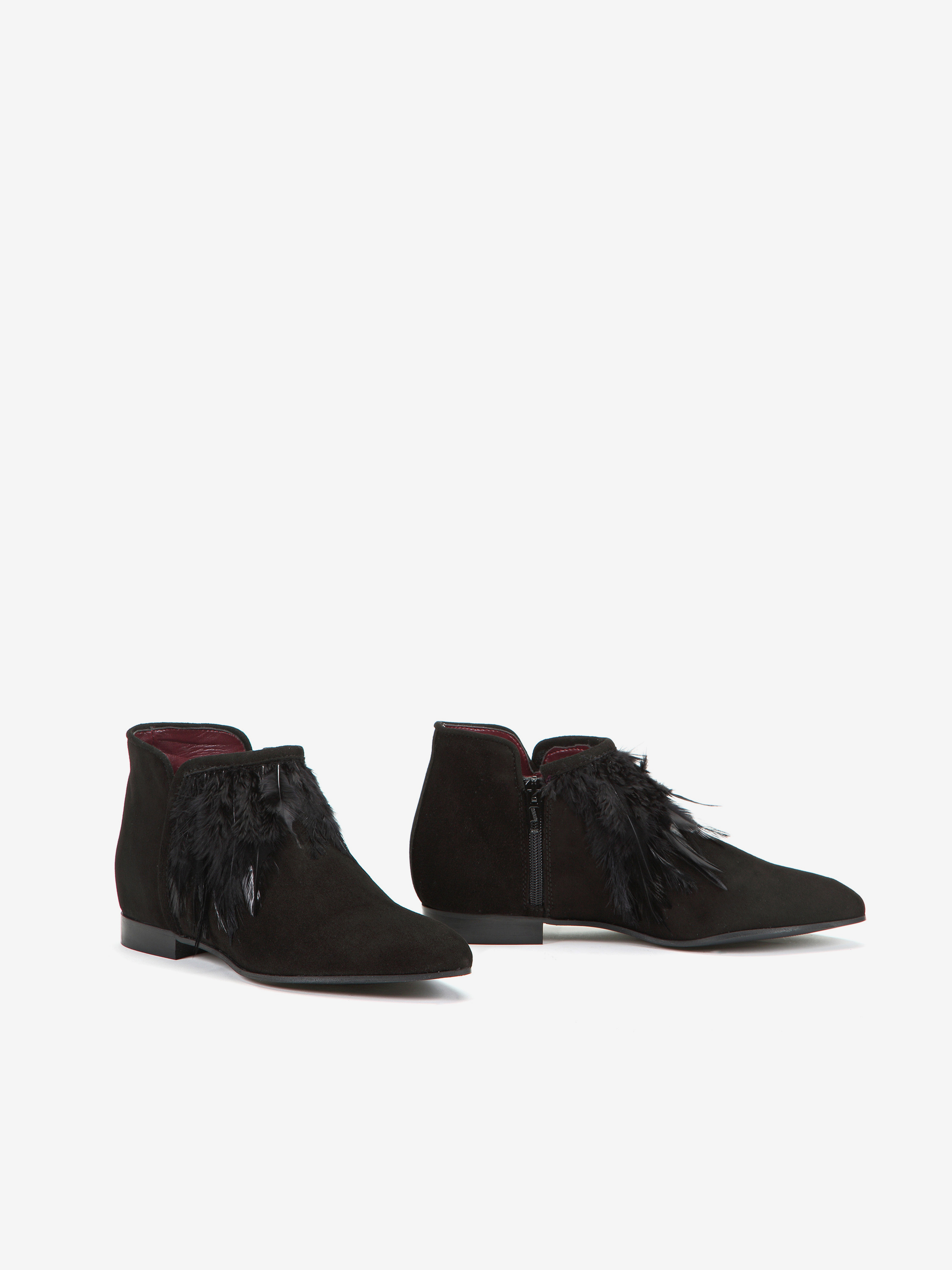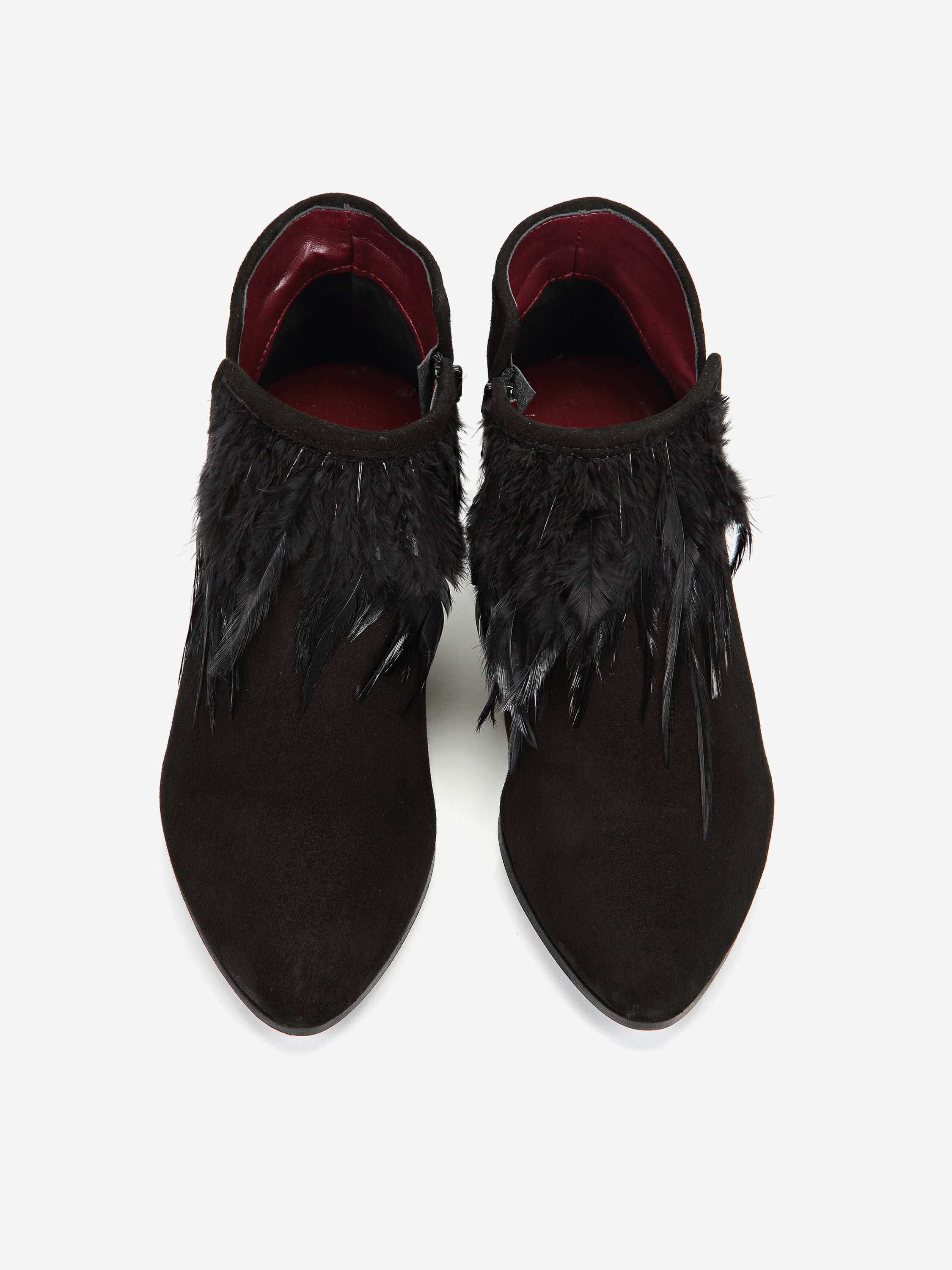 Botki marki HEGO'S wykonane z zamszu w kolorze czarnym,zapinane na suwak od wewnętrznej strony,wykończone ozdobnymi,czarnymi piórami.