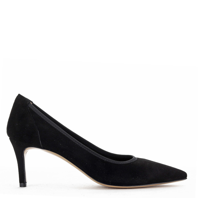 Sportowa szpilka z zamszu bez futrówki wykończona gumką wokół buta na czarnej,skórzanej podeszwie. Posiadają jasną, skórzaną wkładkę.