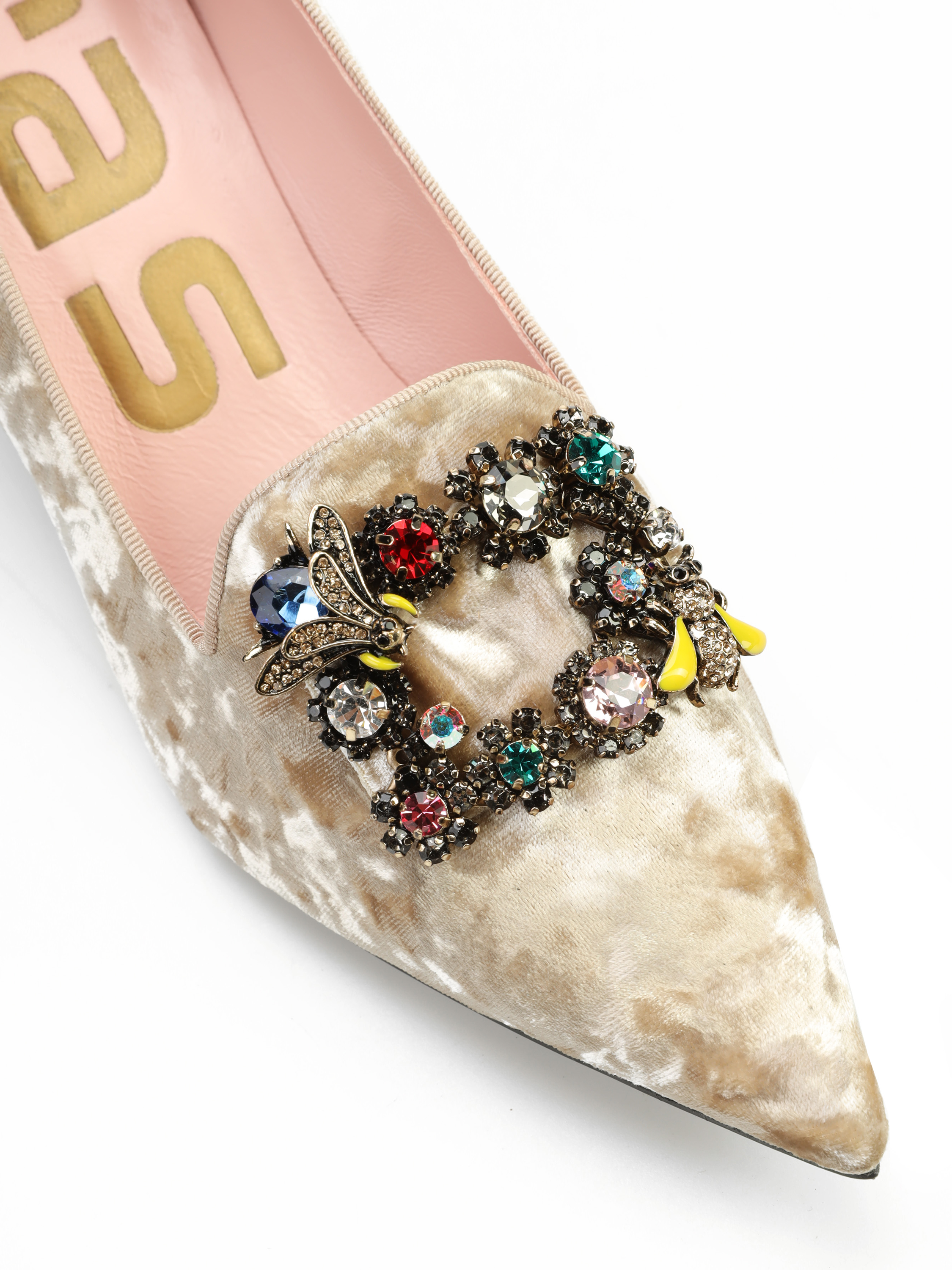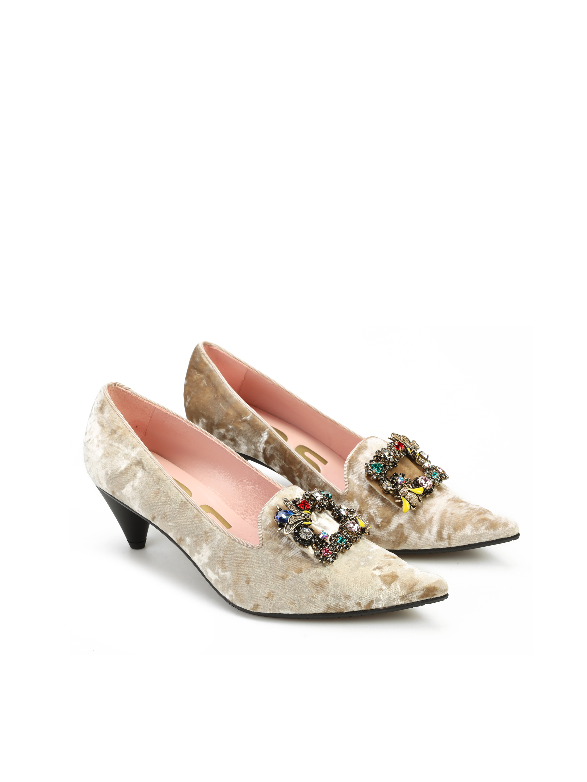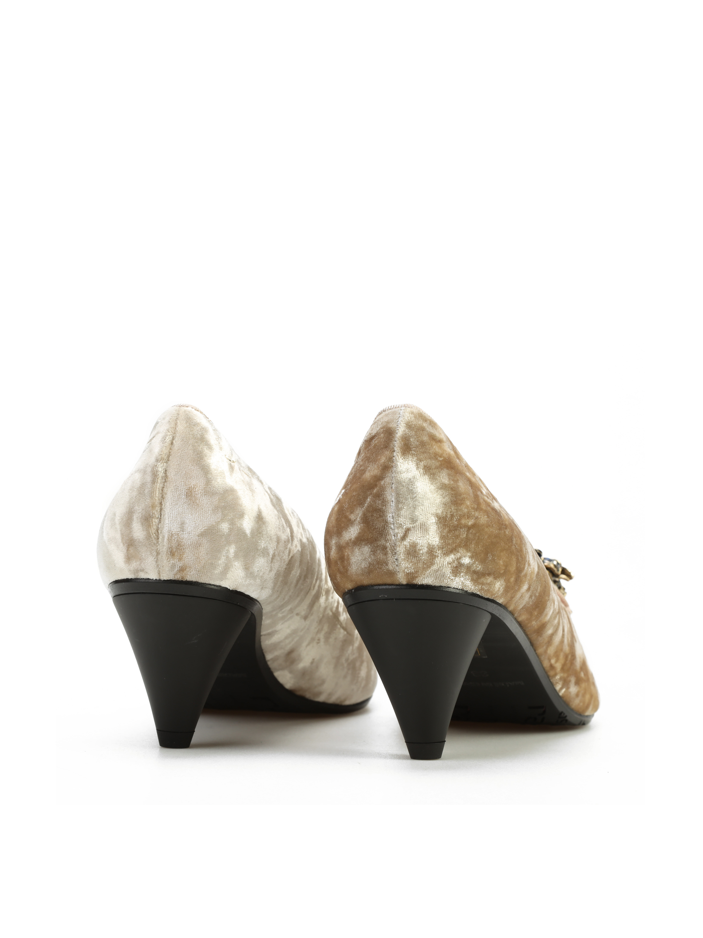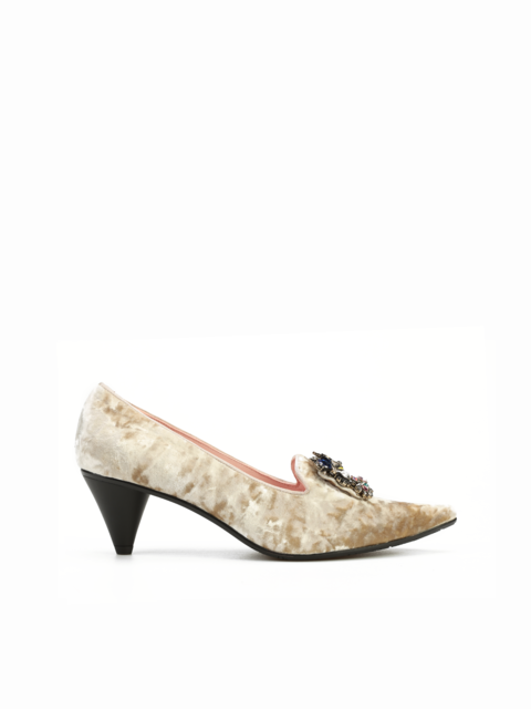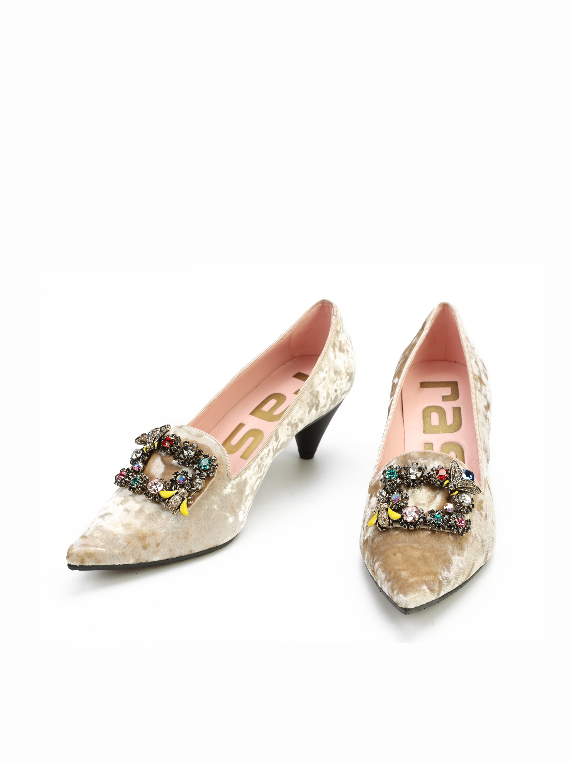 Szpilki na niskim obcasie marki RAS wykonane są z naturalnej skóry. Beżowa, welurowa cholewka ozdobiona została broszką z kolorowych kamieni. Modne i wygodne.