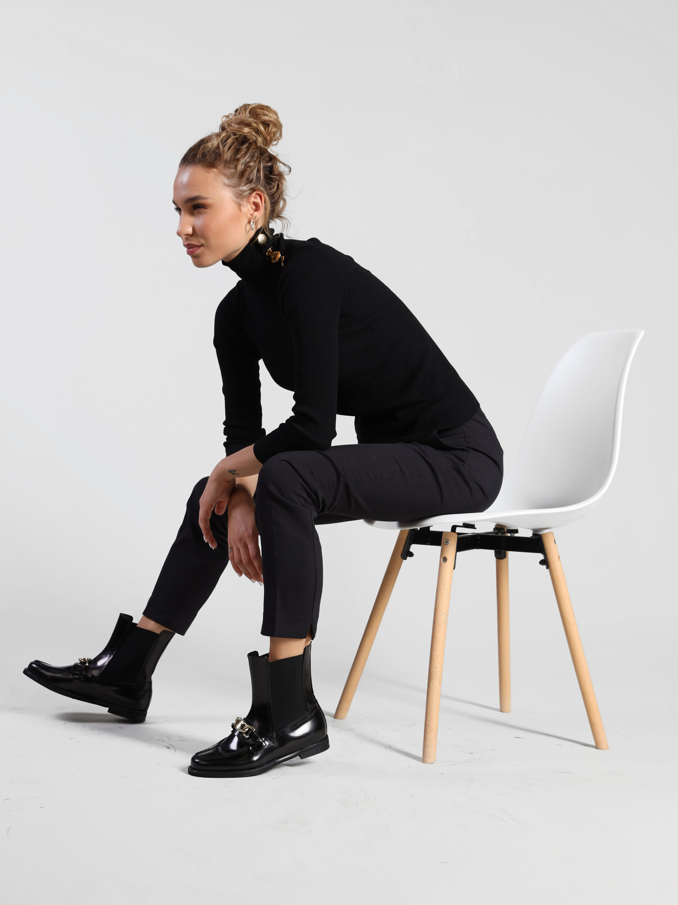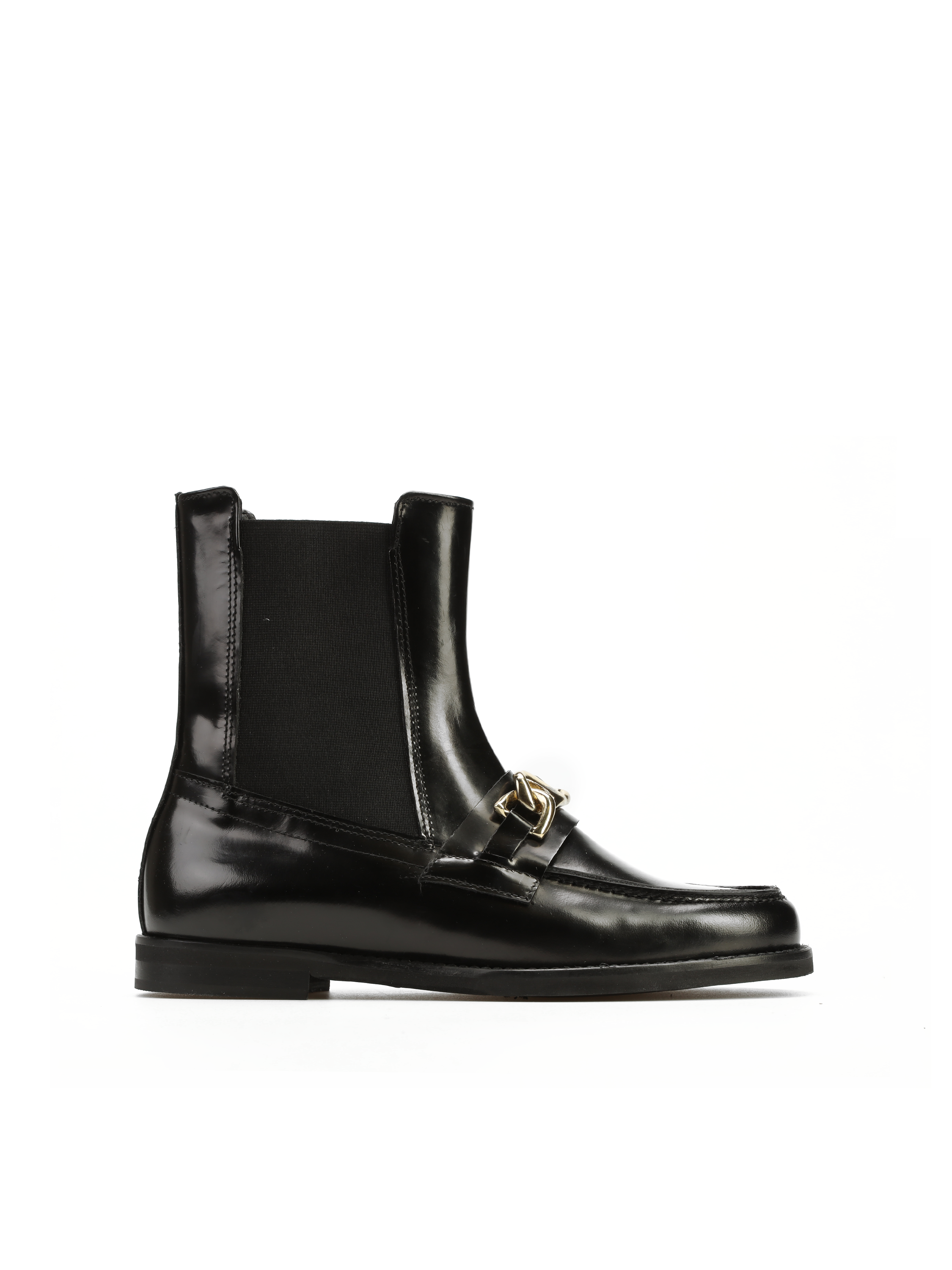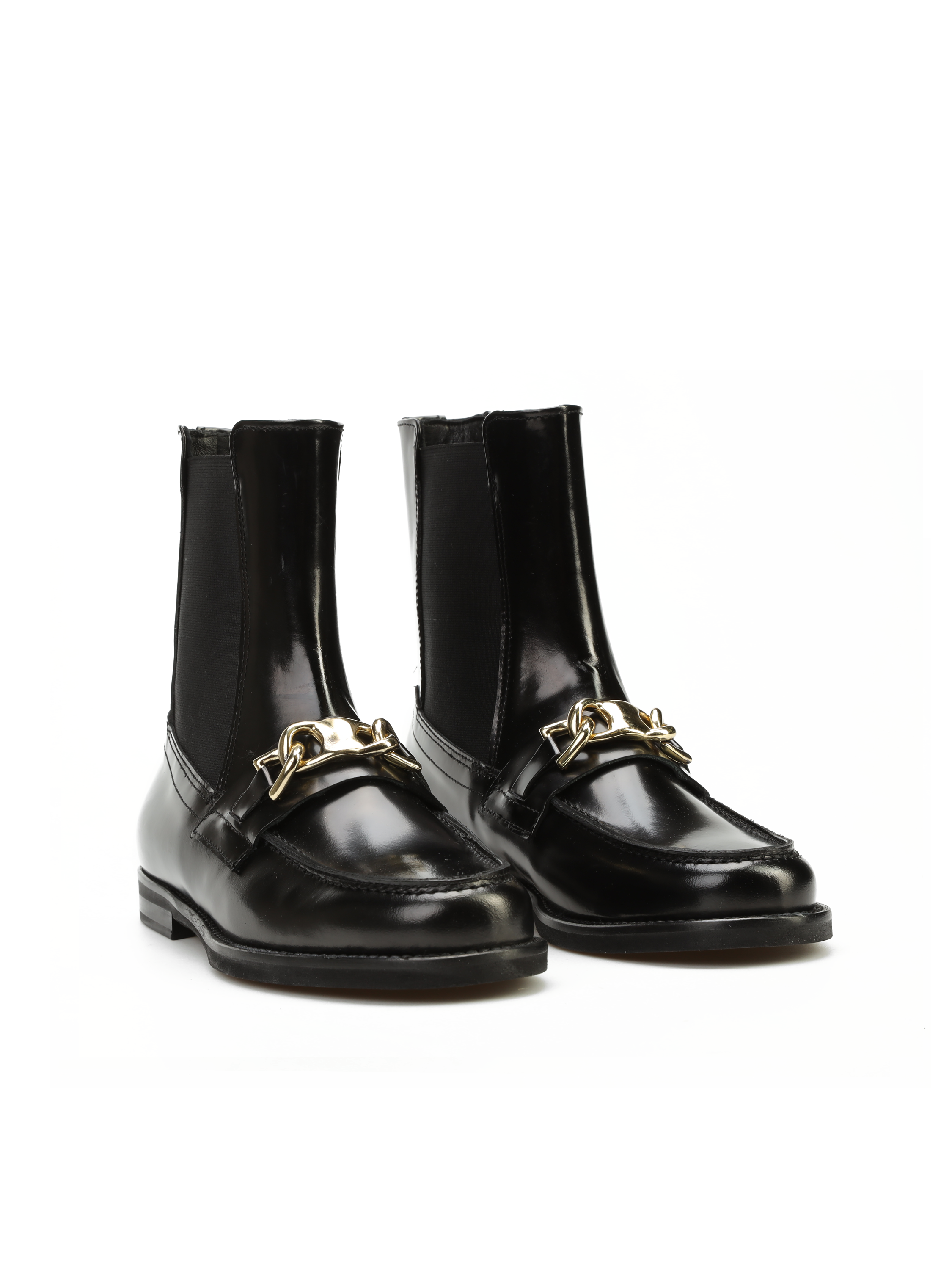 Wsuwane sztyblety na płaskim obcasie wykonane są z wysokopolerowanej skóry naturalnej. Model w klasycznym, czarnym kolorze. Cholewka za kostkę posiada elastyczną gumę, która pozwala dopasować obuwie do nogi. Stylowa, złota klamra to detal, który wyróżnia ten model.