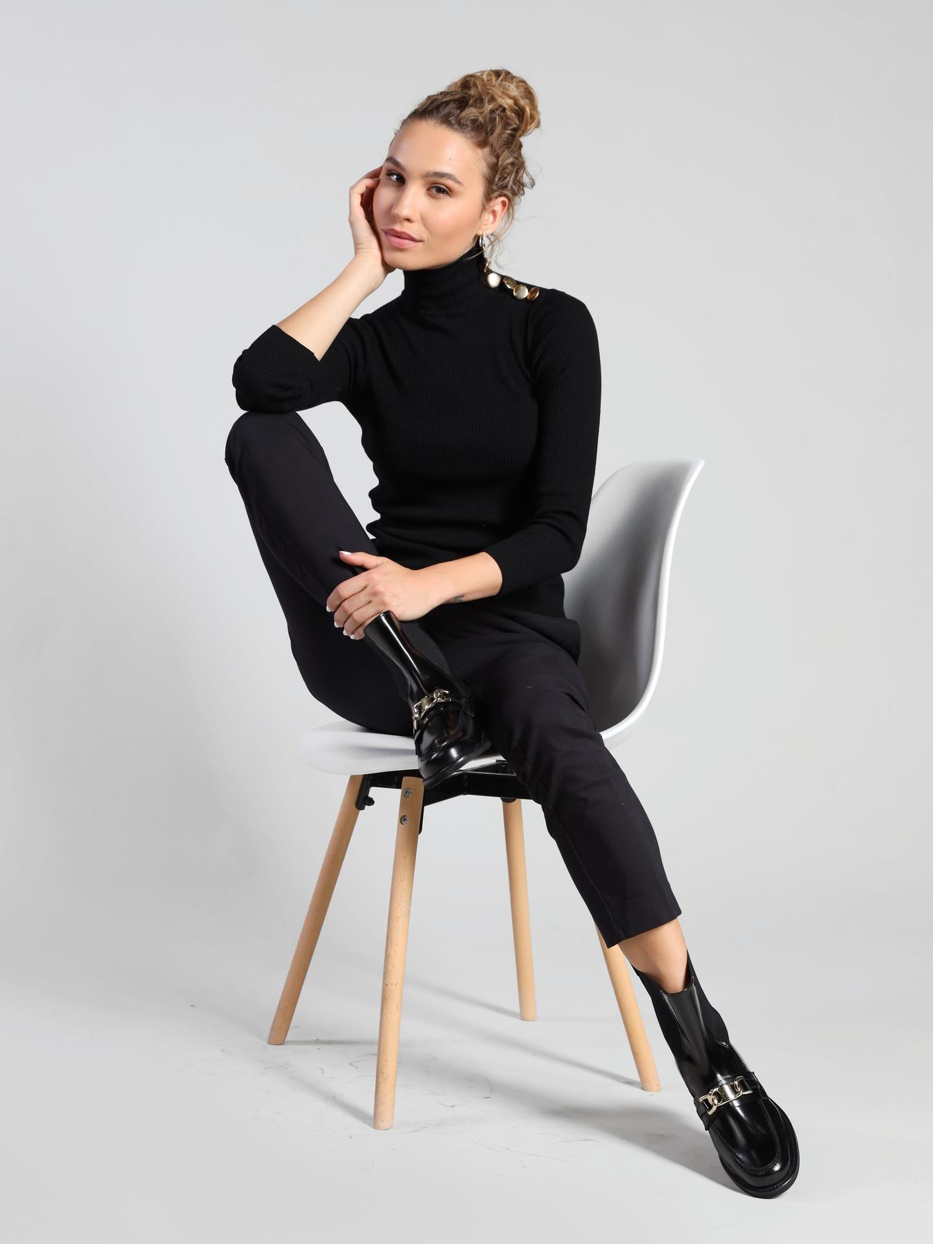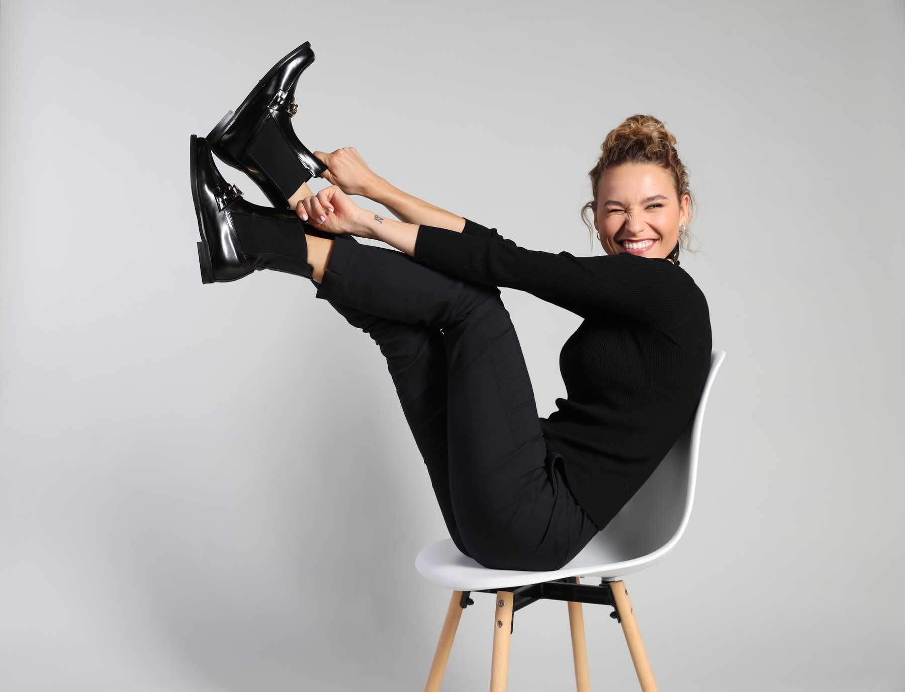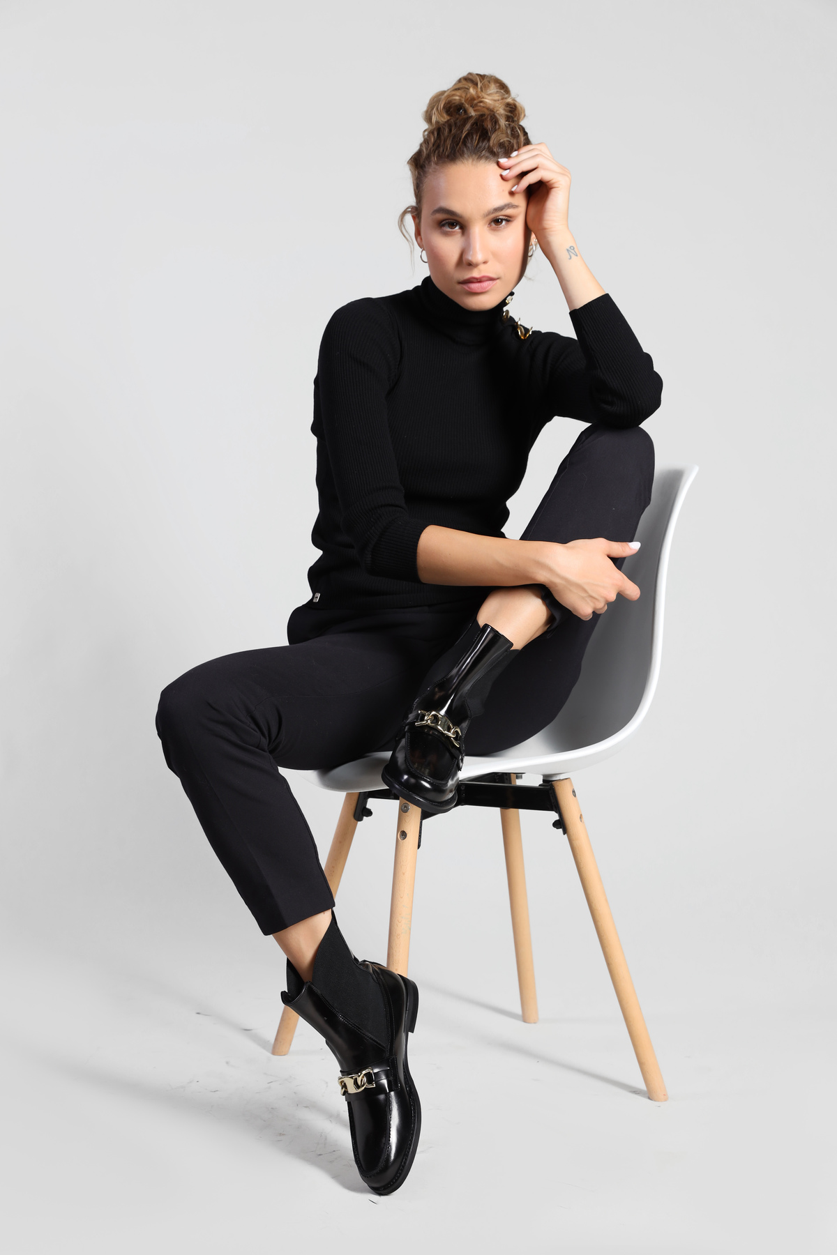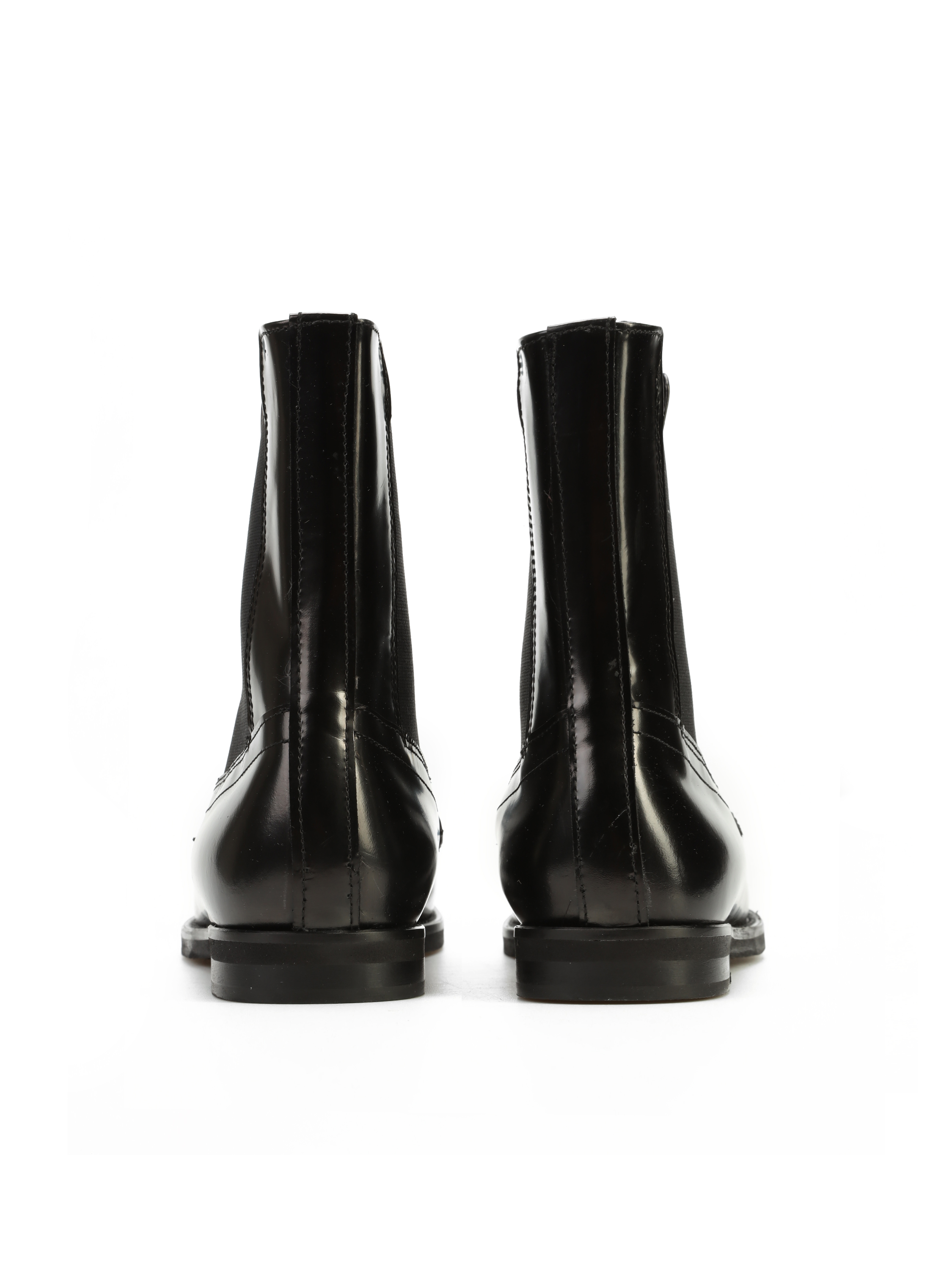 Wsuwane sztyblety na płaskim obcasie wykonane są z wysokopolerowanej skóry naturalnej. Model w klasycznym, czarnym kolorze. Cholewka za kostkę posiada elastyczną gumę, która pozwala dopasować obuwie do nogi. Stylowa, złota klamra to detal, który wyróżnia ten model.