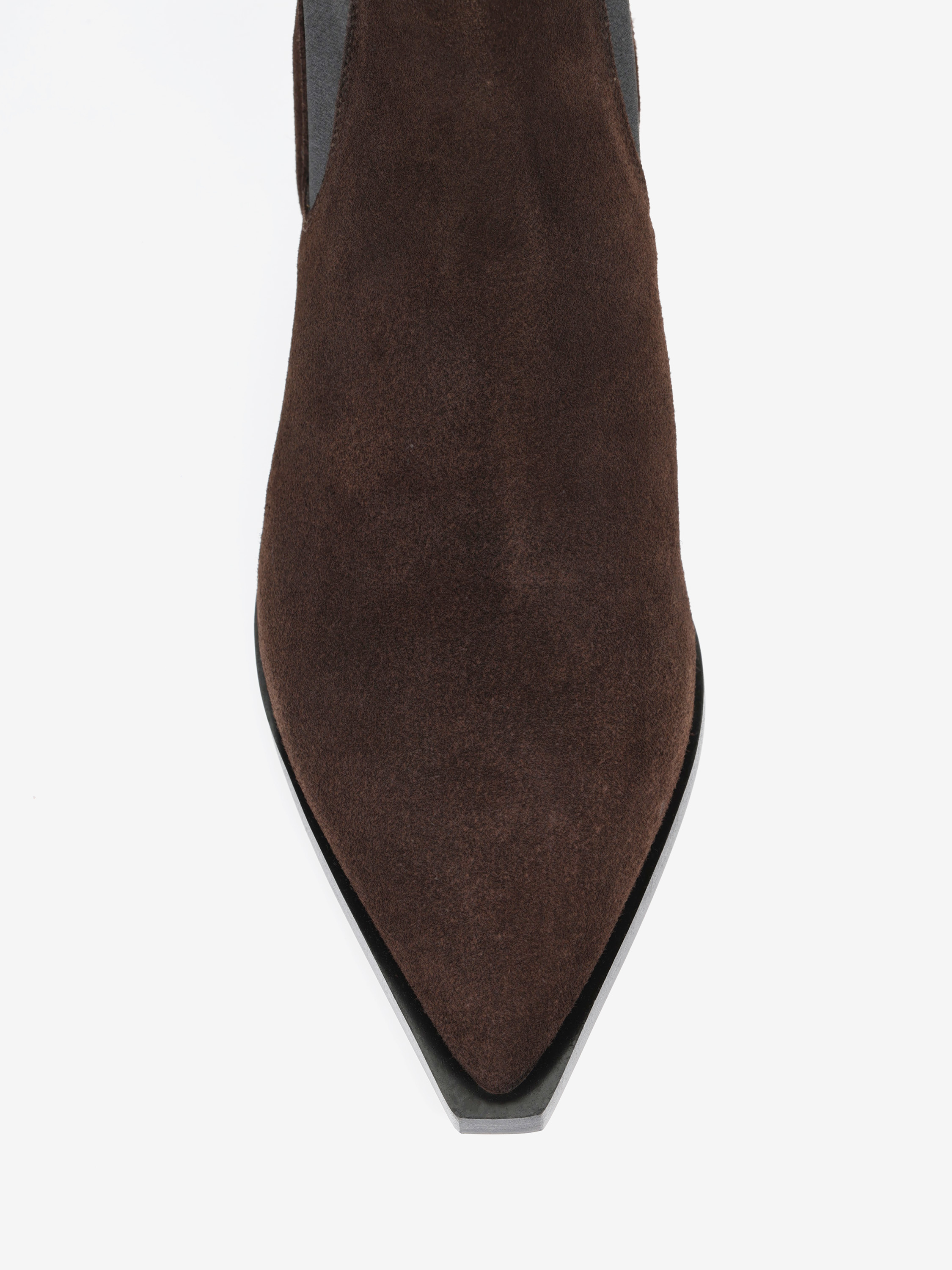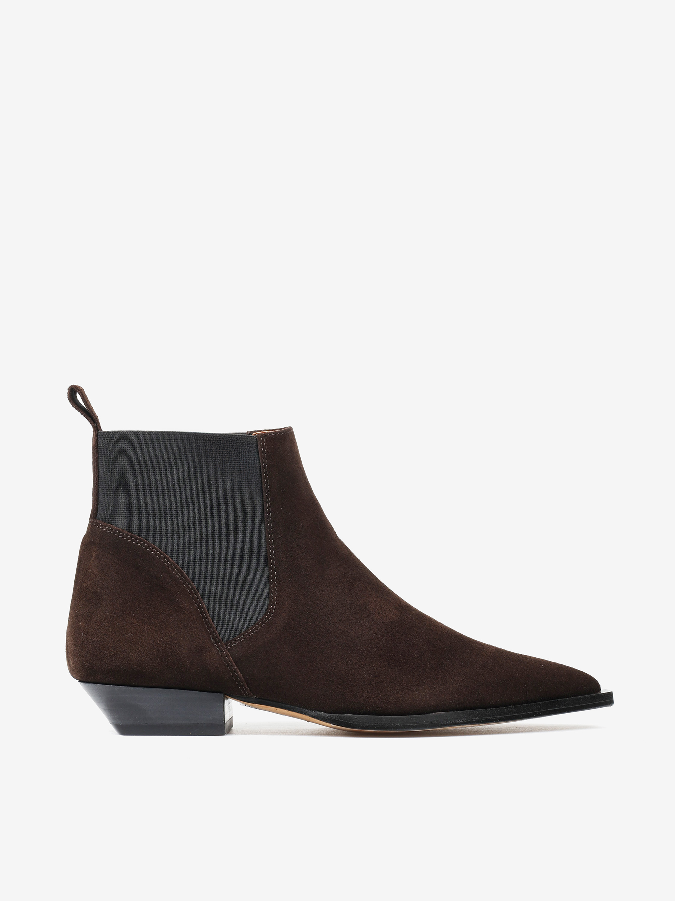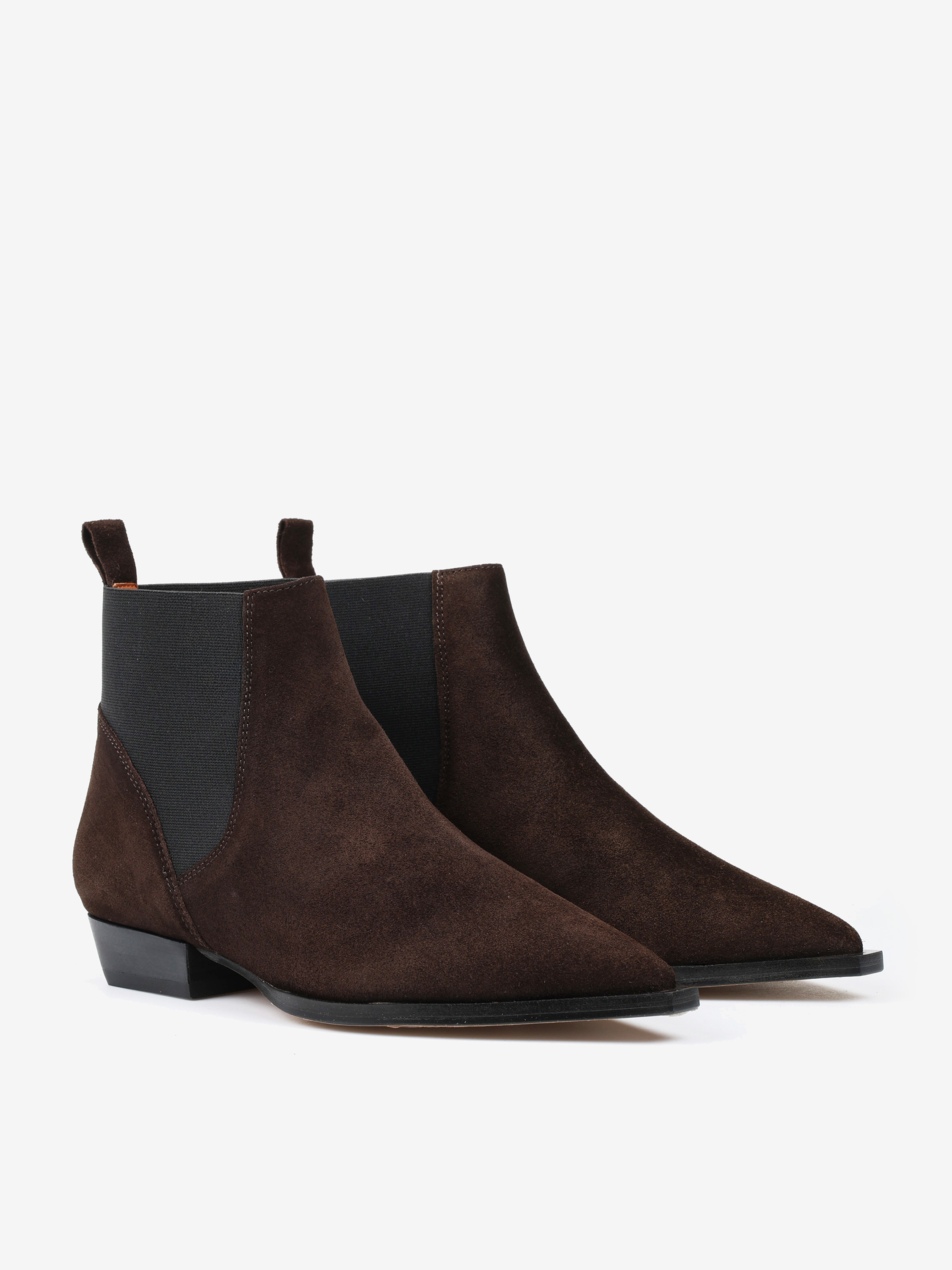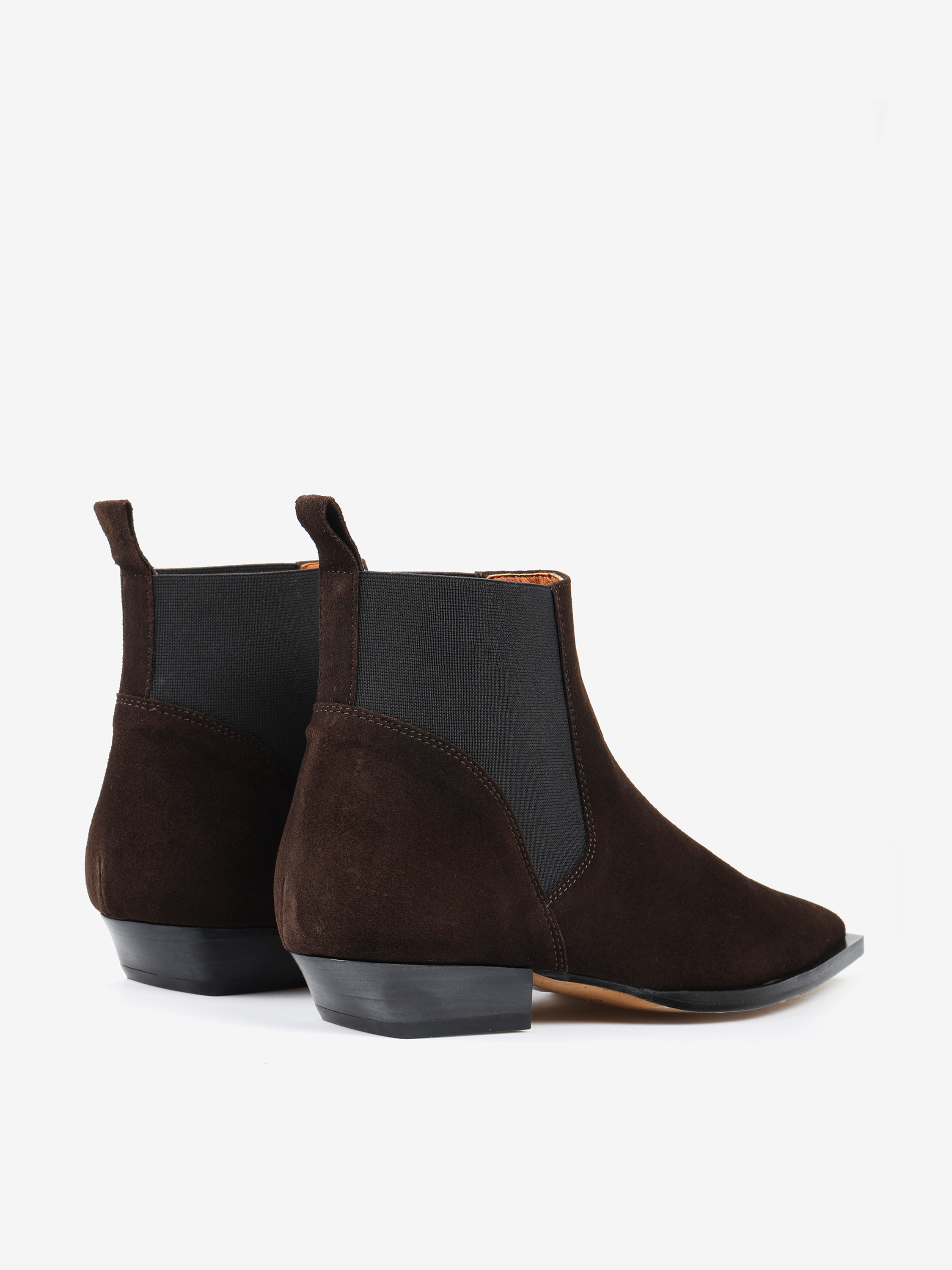 Zamszowe sztyblety w stylu kowbojskim. Noski w szpic i niski obcas.