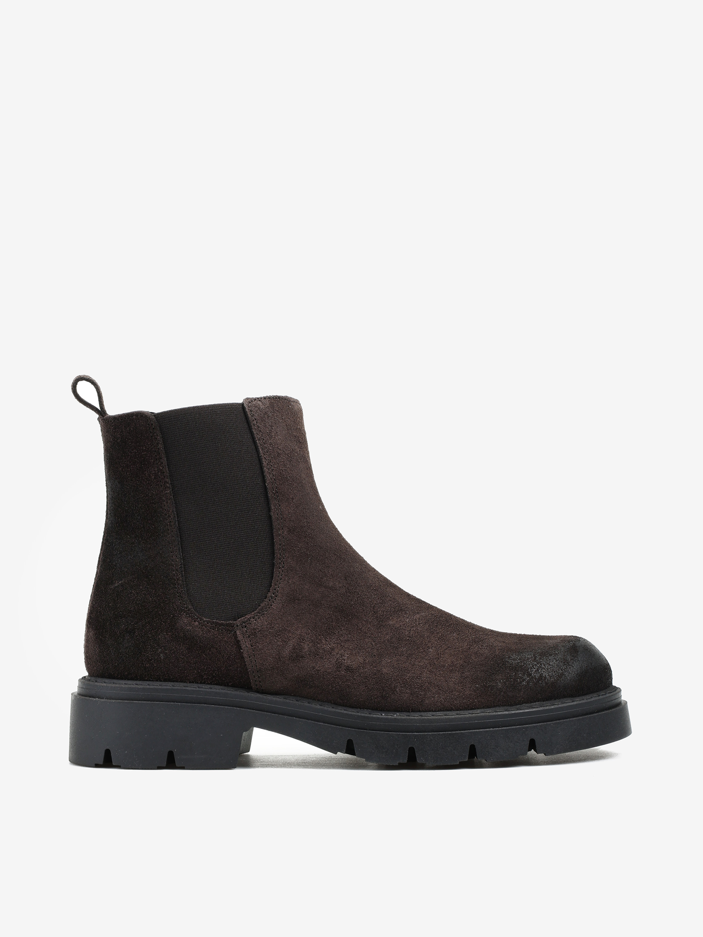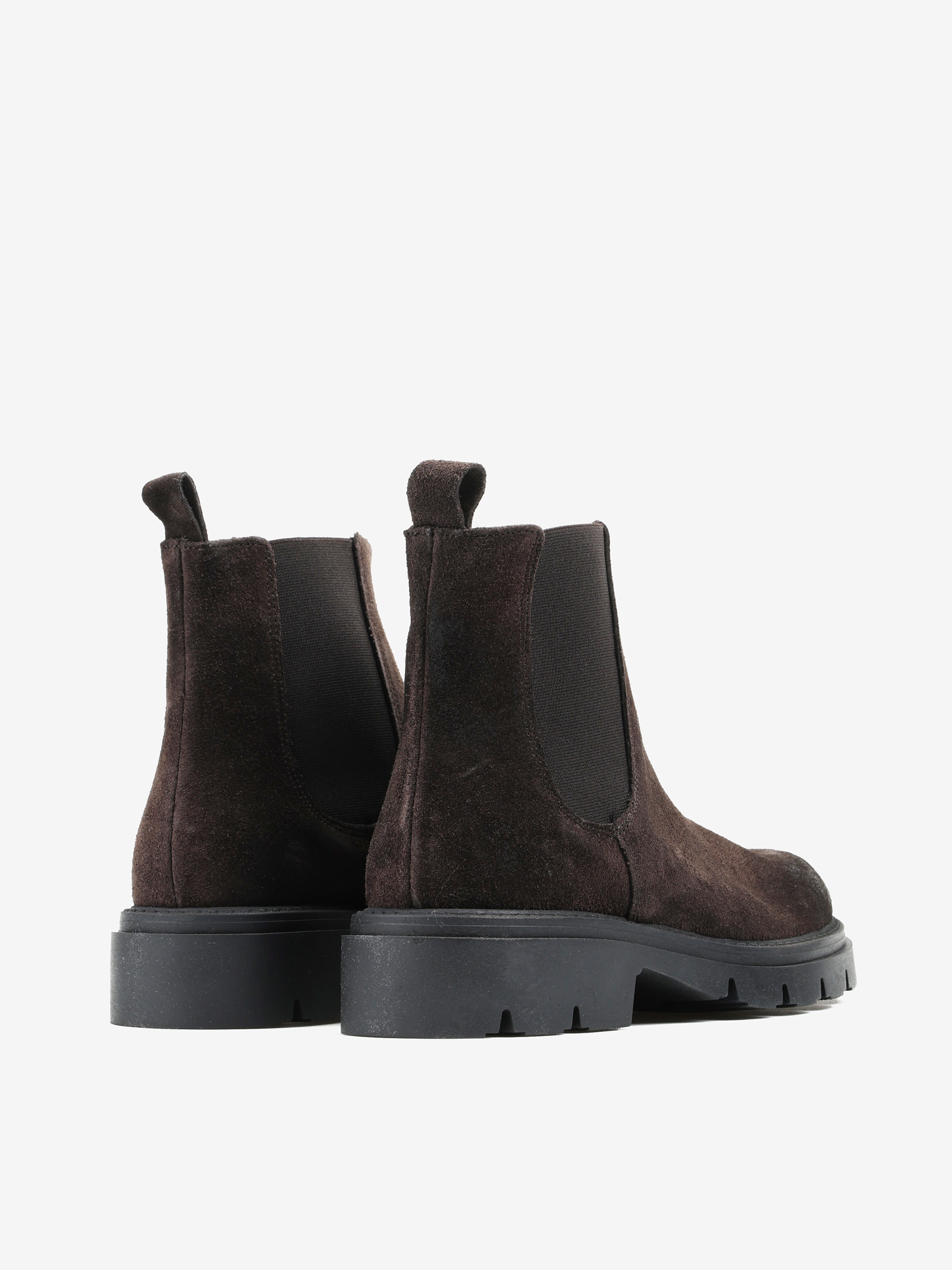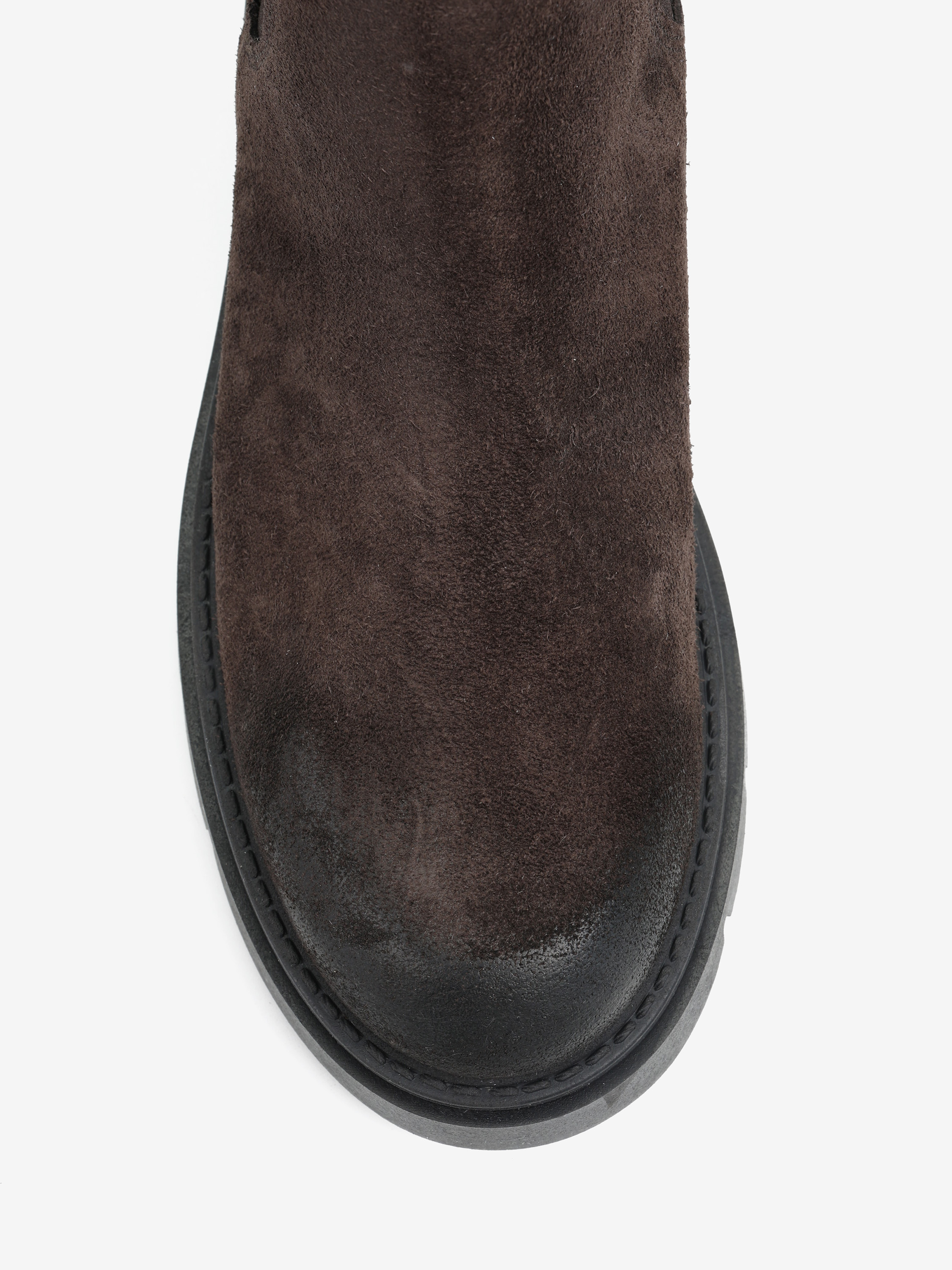 Klasyczne, zamszowe sztyblety z okrągłymi noskami na grubszej podeszwie.
