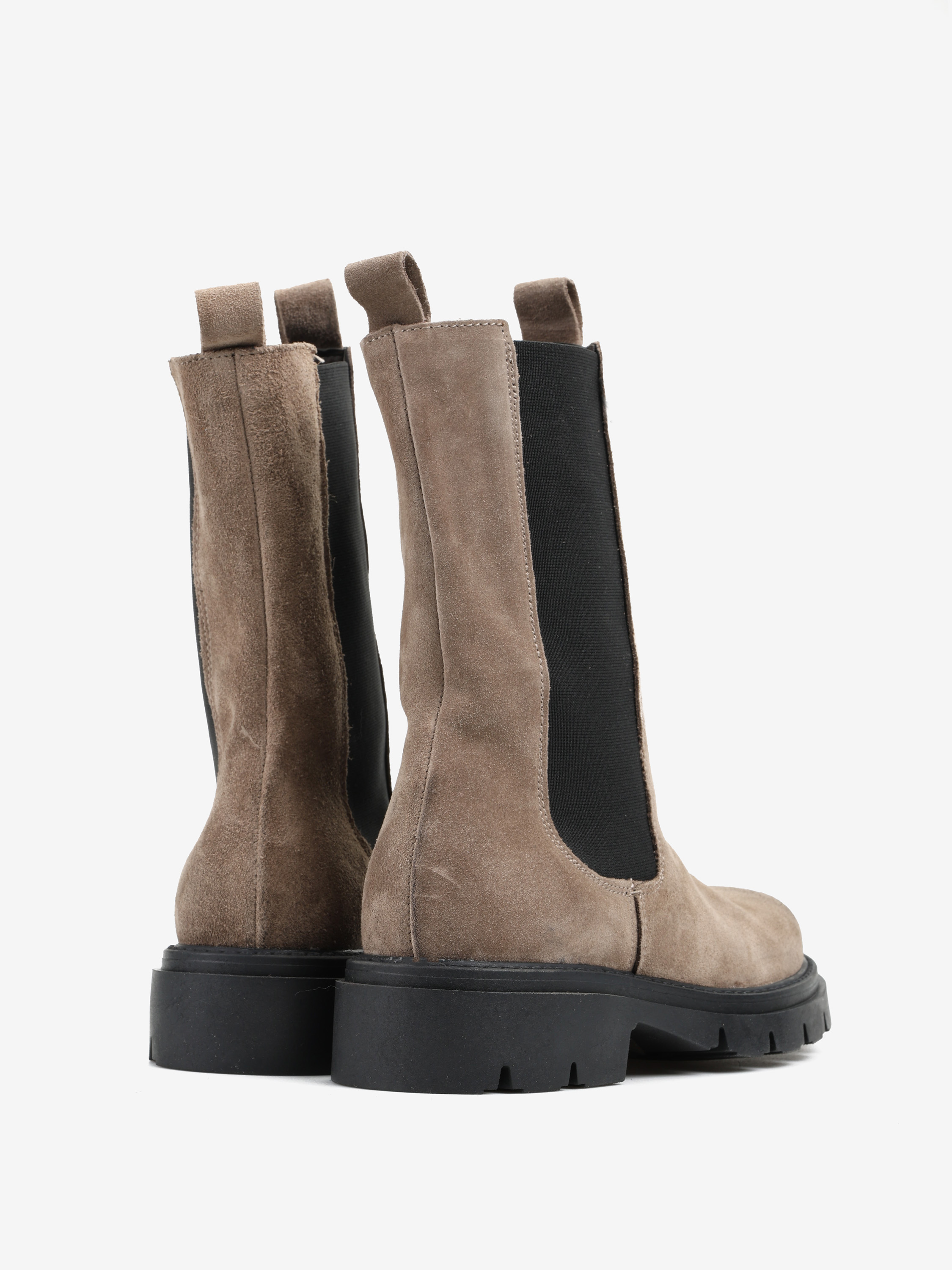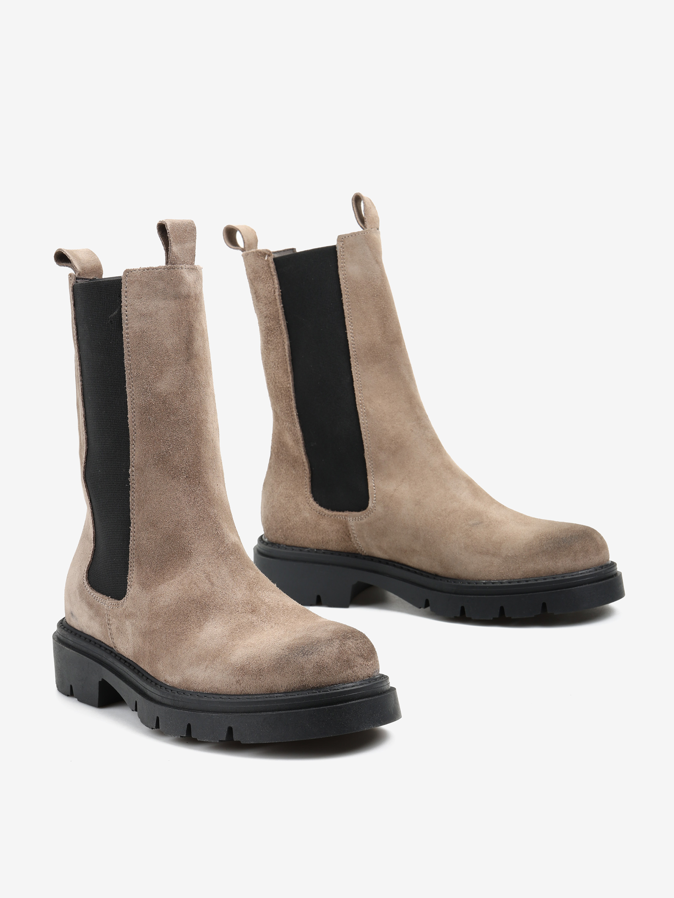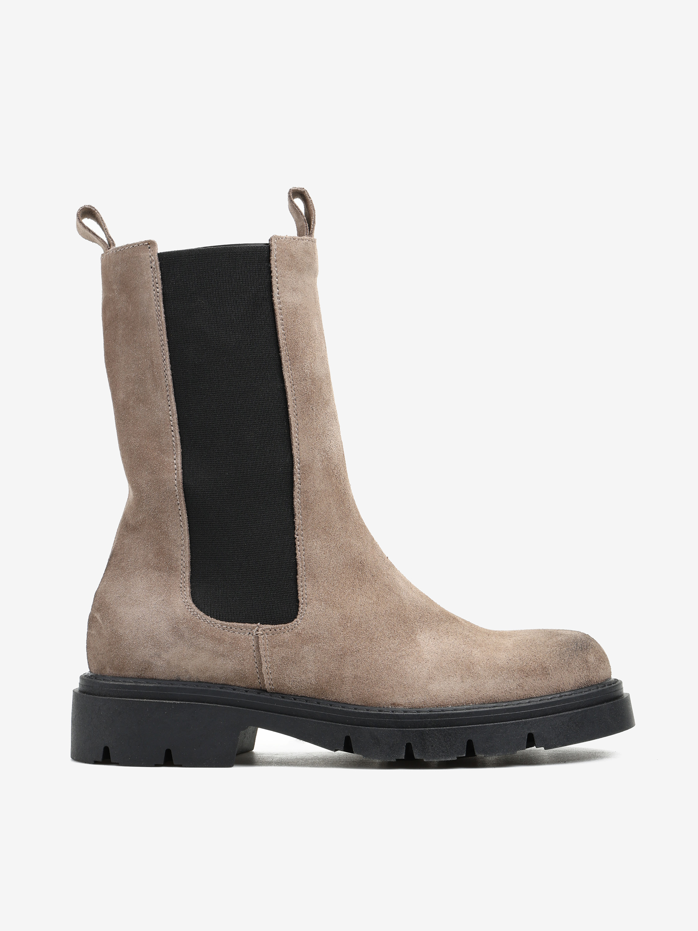 Zamszowe sztyblety na grubszej podeszwie. Wysoka cholewa i okrągły nosek.