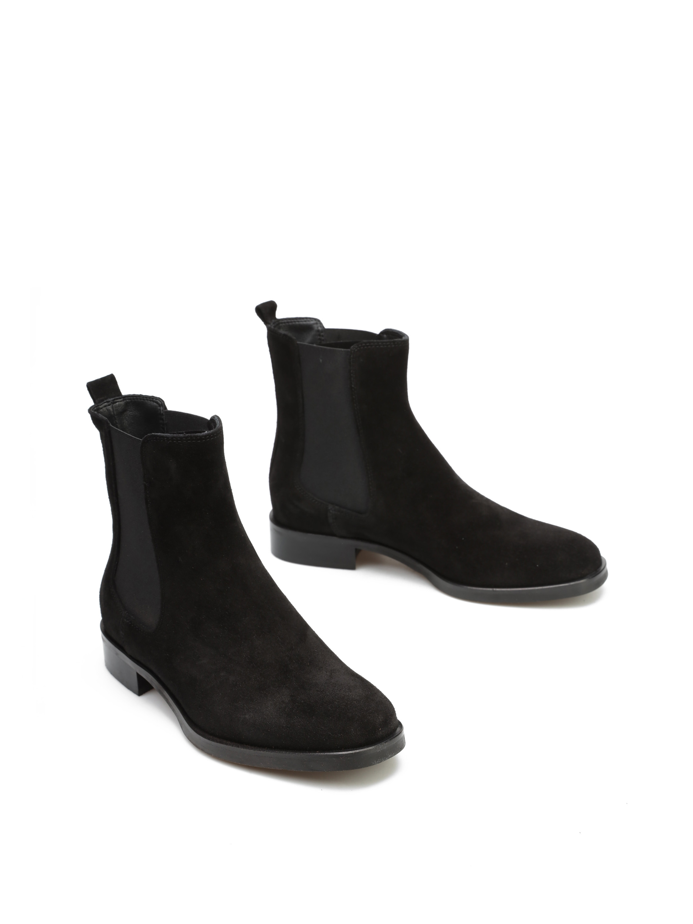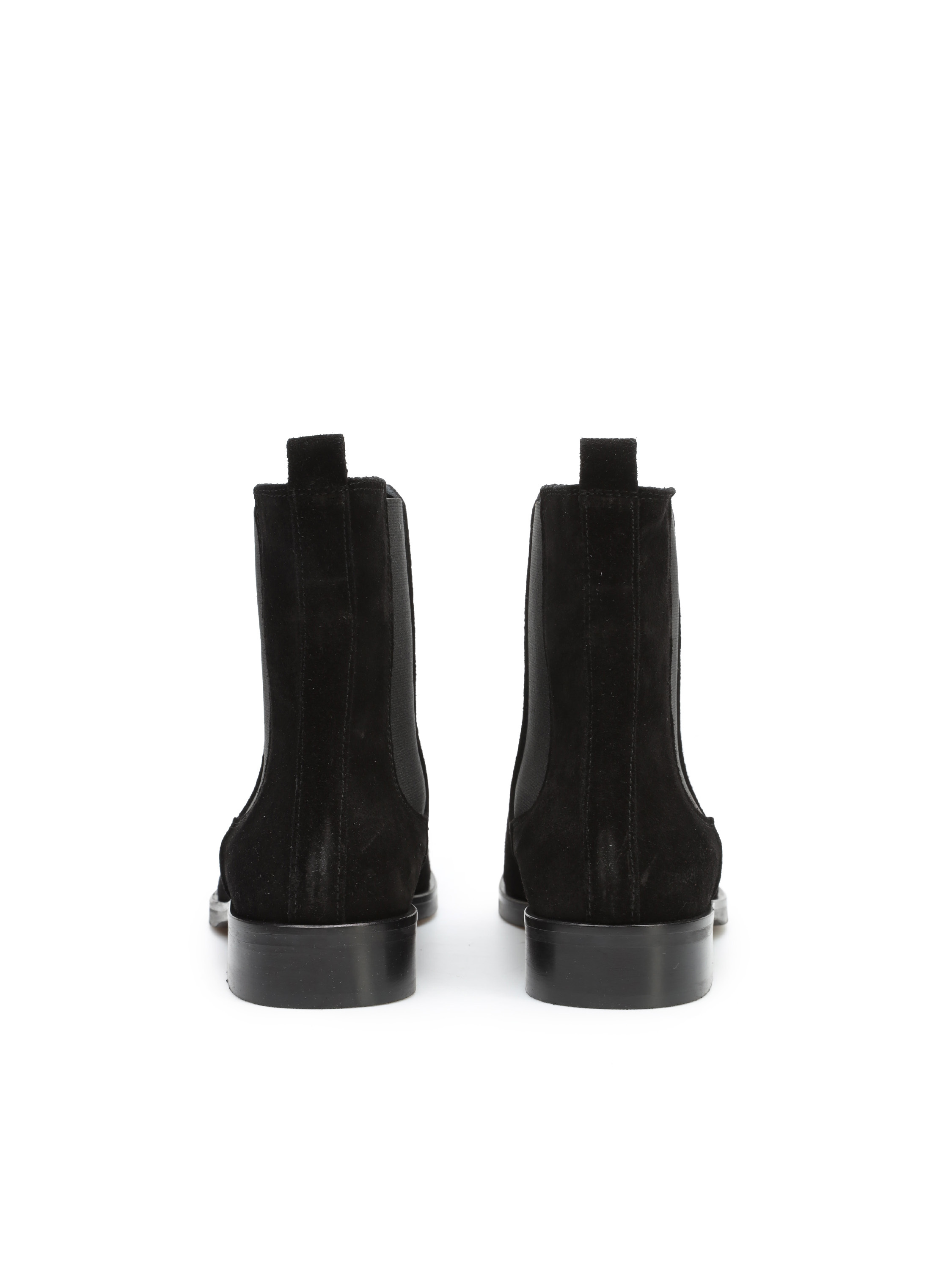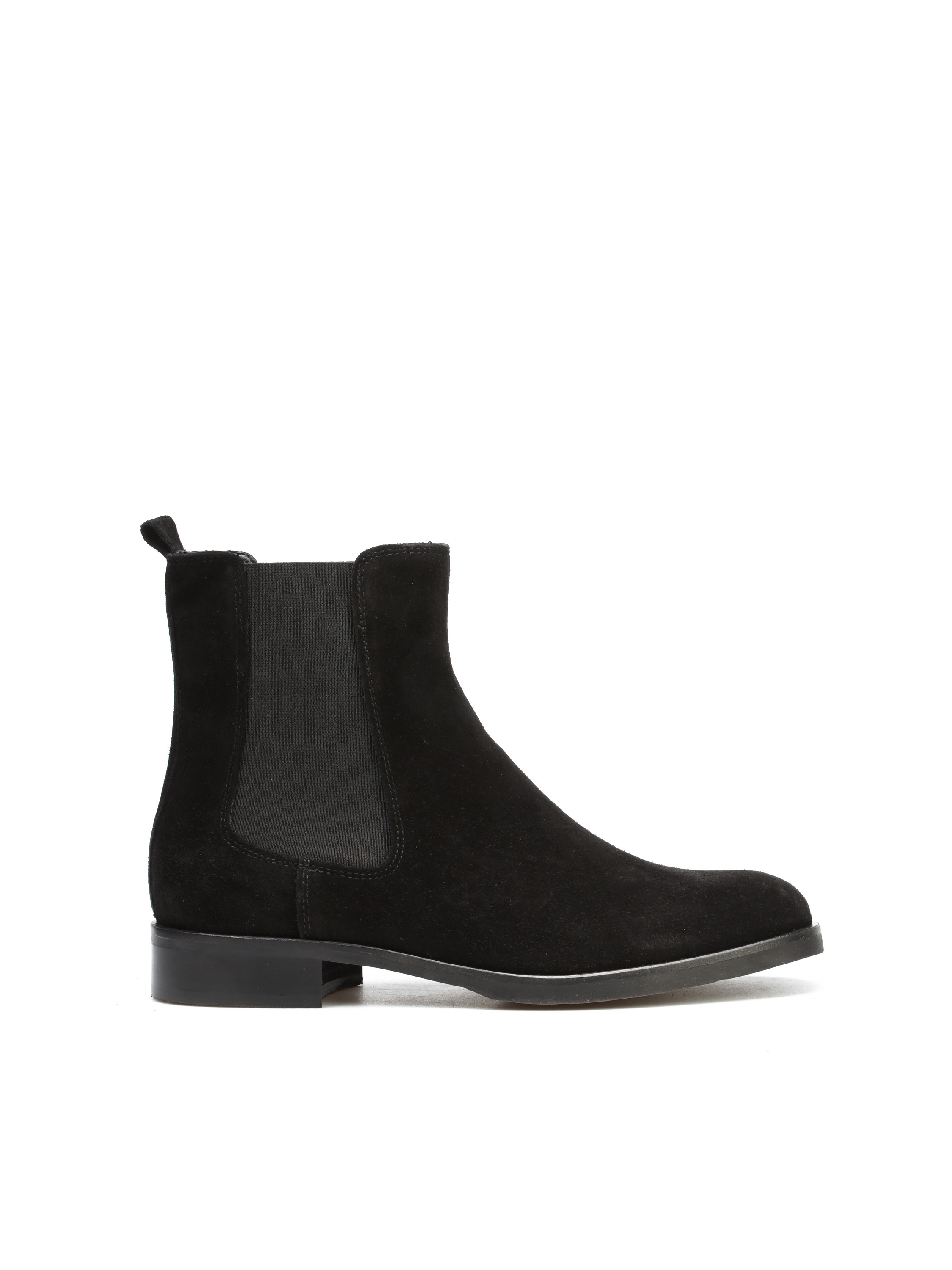 Wsuwane sztyblety wykonane są z zamszowej skóry. Cholewka za kostkę w ponadczasowym, czarnym kolorze posiada wszytą gumę, która pozwala dopasować obuwie do nogi. Model na płaskim obcasie.