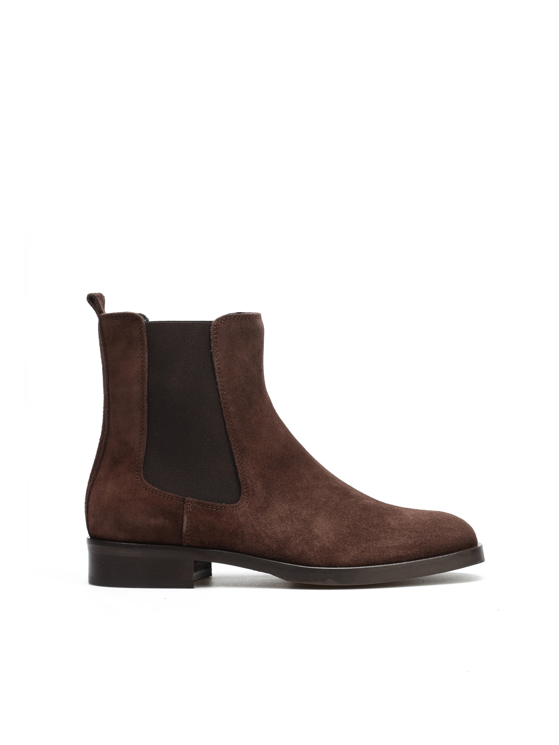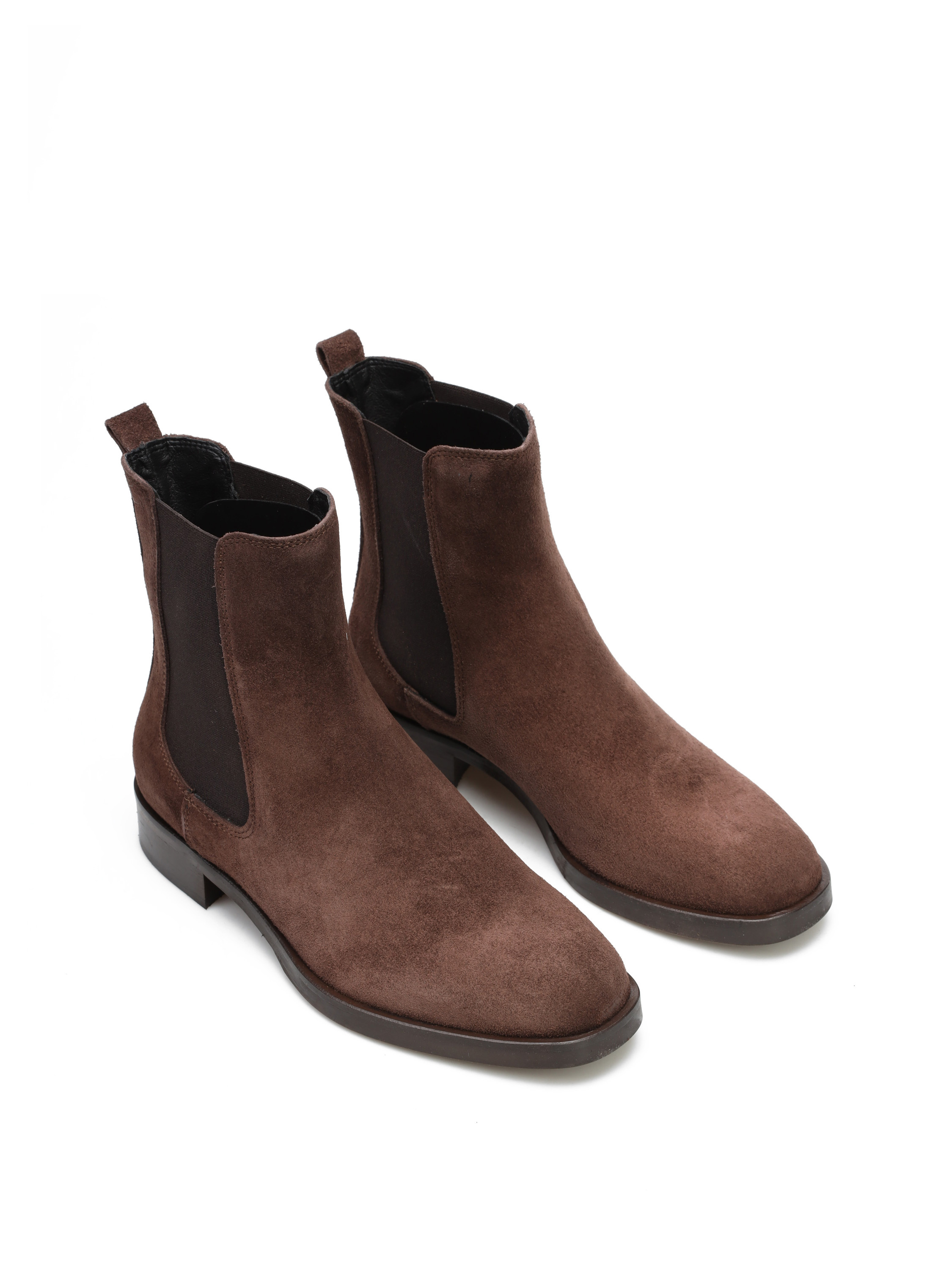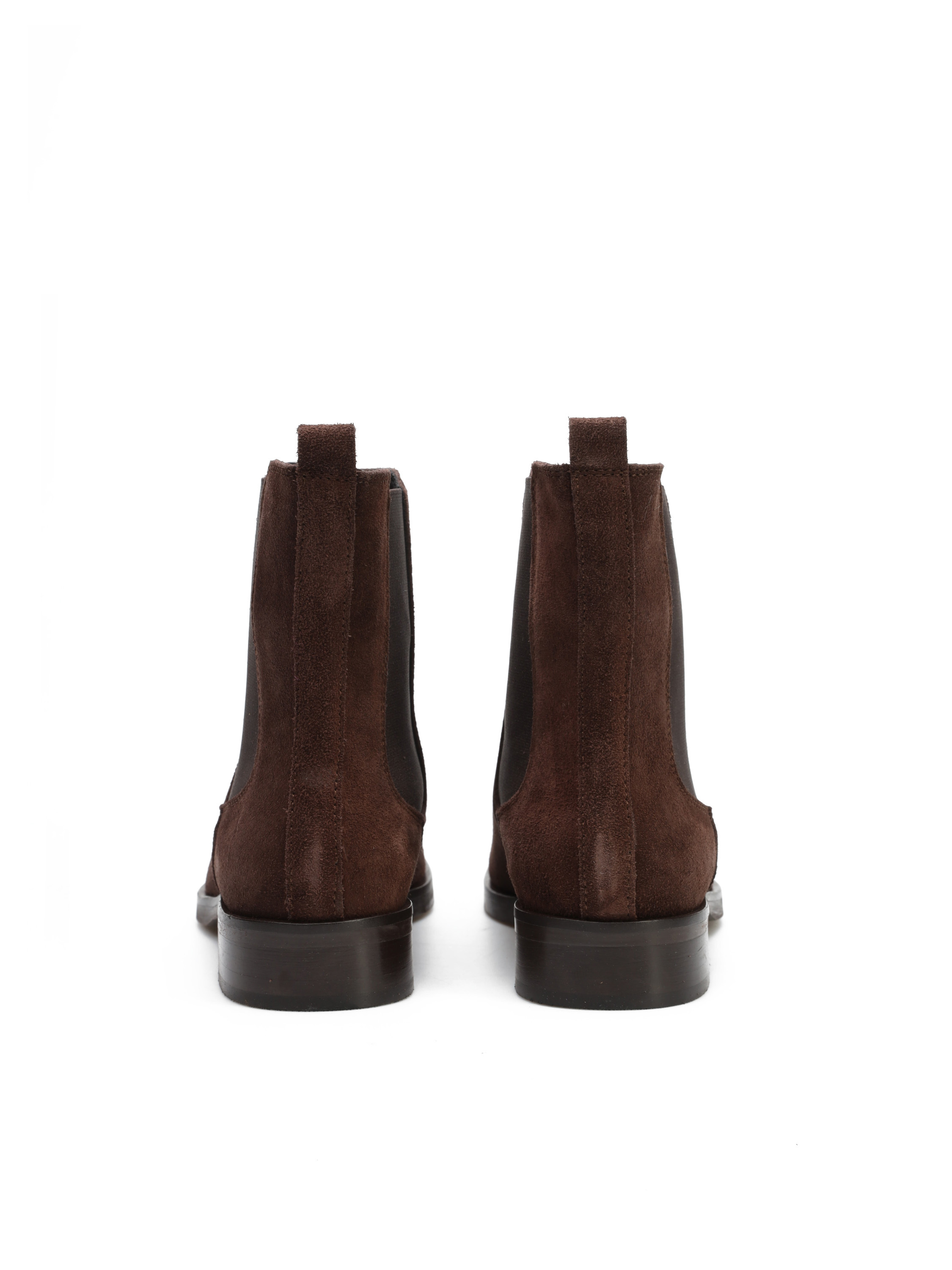 Wsuwane sztyblety wykonane są z zamszowej skóry. Cholewka za kostkę w najmodniejszym, czekoladowym kolorze posiada wszytą gumę, która pozwala dopasować obuwie do nogi. Model na płaskim obcasie.