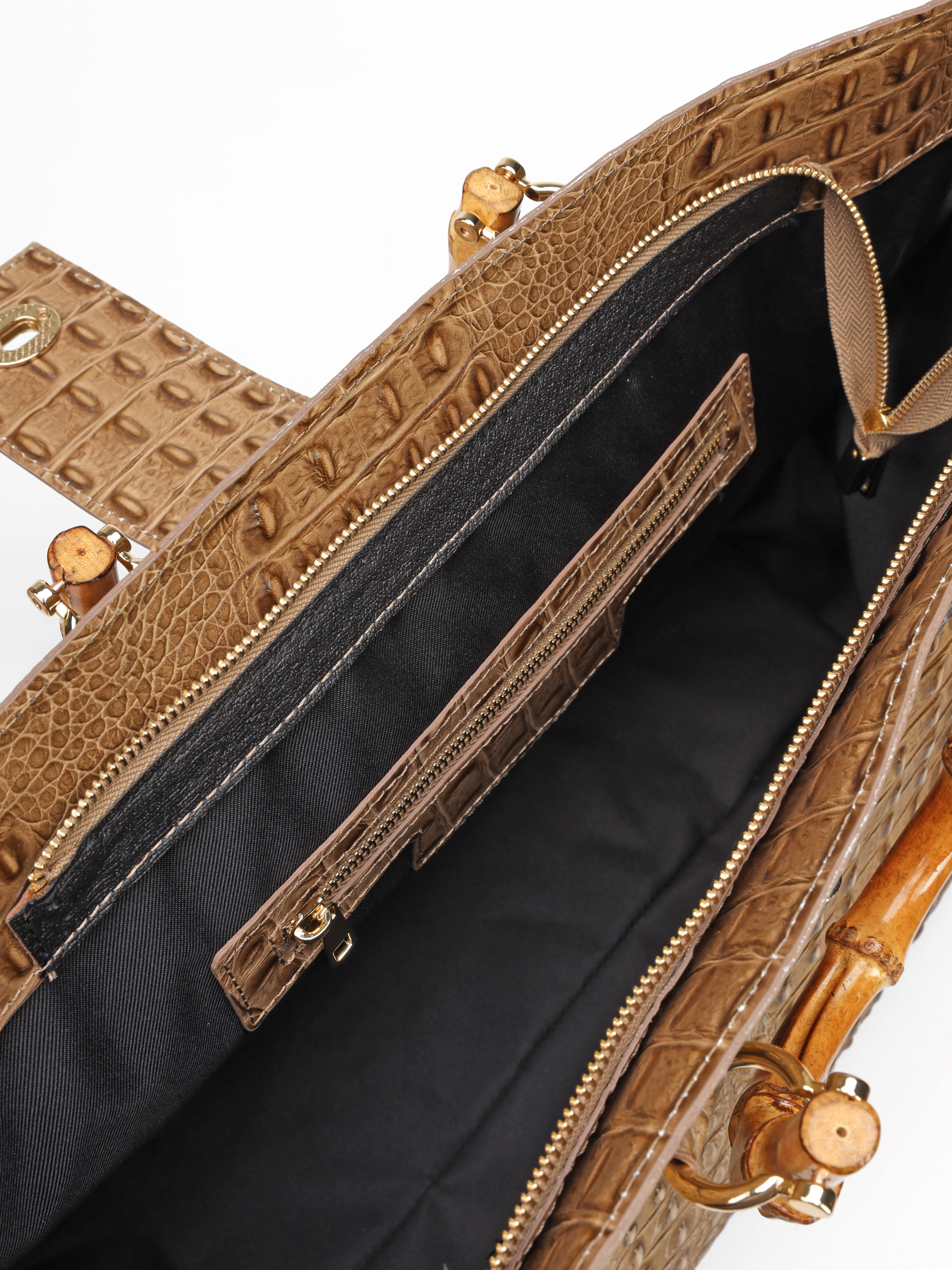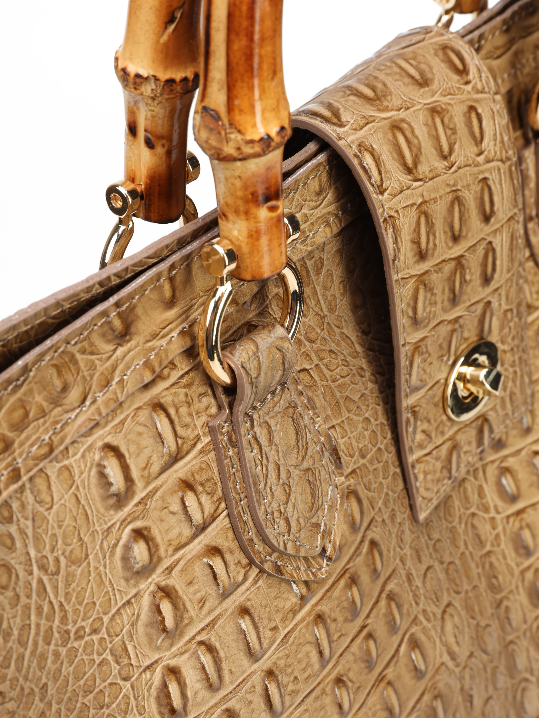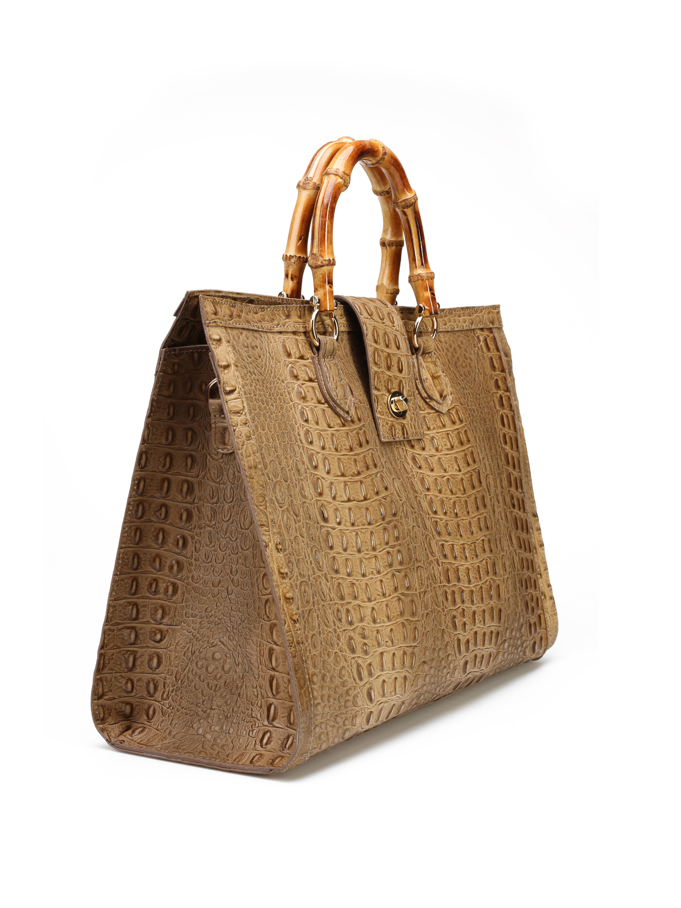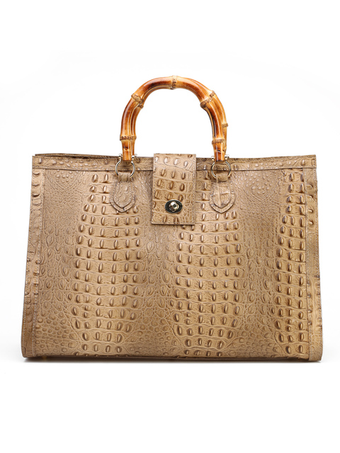 Duża torebka damska HEGO'S Milano wykonana jest włoskiej, naturalnej skóry. Wnętrze posiada dużą przestrzeń oraz kieszeń zapinaną na zamek błyskwiczny. Detale w postaci tłoczonej skóry oraz bambusowa, stylowa rączka wyróżniają ten model. Torebkę moża również nosić z paskiem na ramieniu.