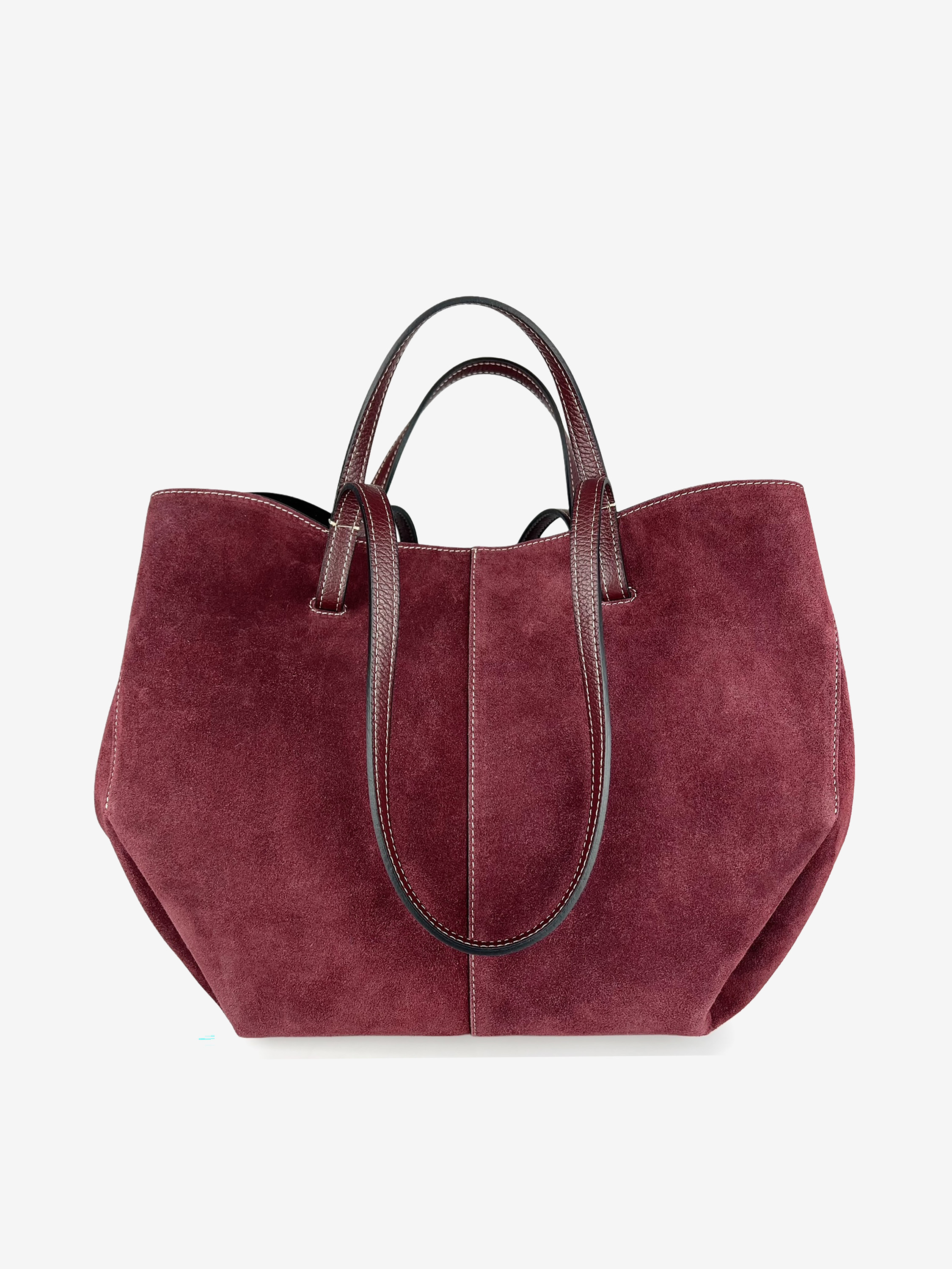 Shopper wykonany z naturalnej skóry zamszowej w kolorze bordo. Wnętrze torebki jedna przestrzeń + mała kosmetyczka. Posiada podwójne rączki, dzięki temu można być do ręki i na ramię.