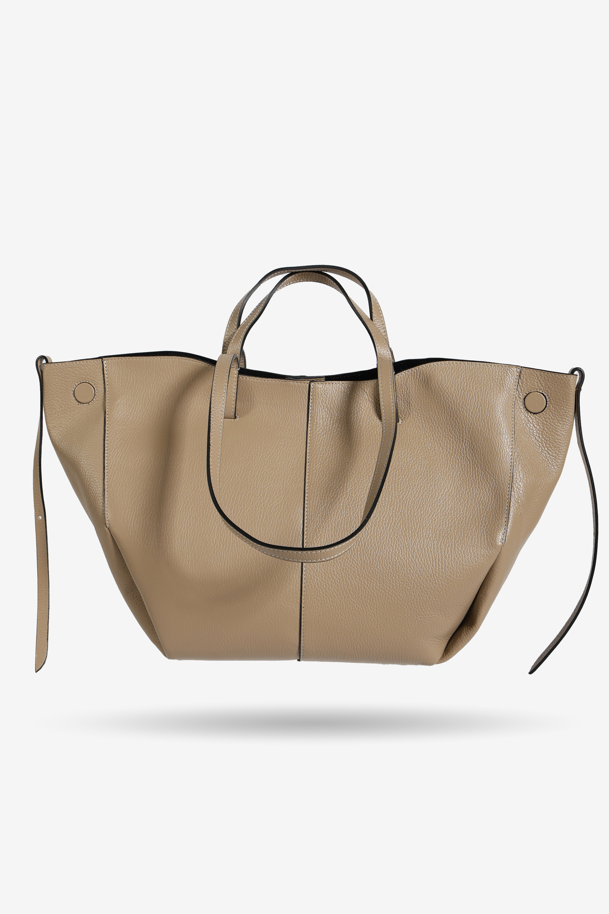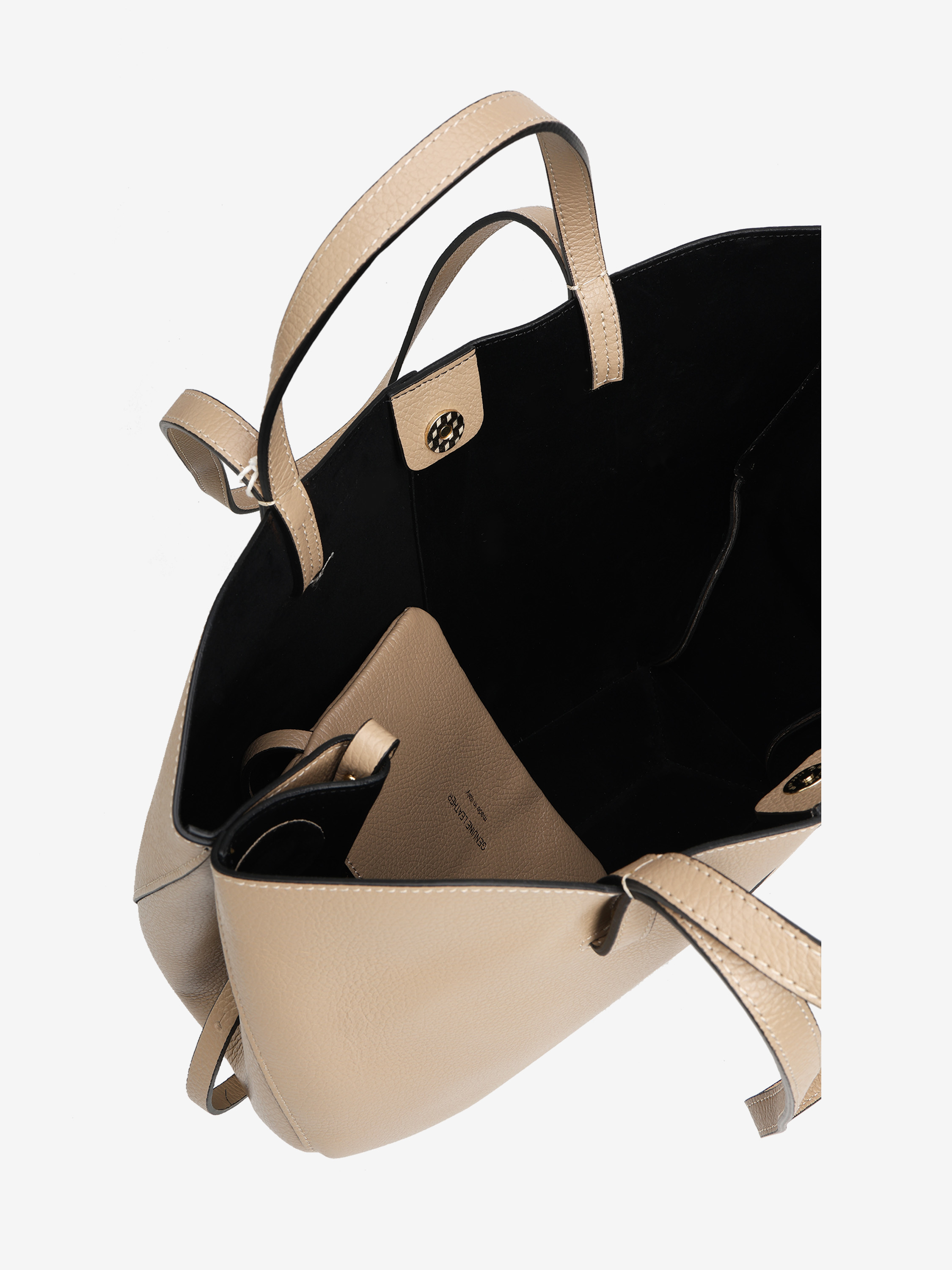 Torebka HEGO'S Milano w kształcie koszyka z rozkładanymi bokami, co pozwala na dwa sposoby noszenia. Jest pojemna, z praktyczną kosmetyczką w środku, łącząc elegancję z funkcjonalnością. Idealna na co dzień.