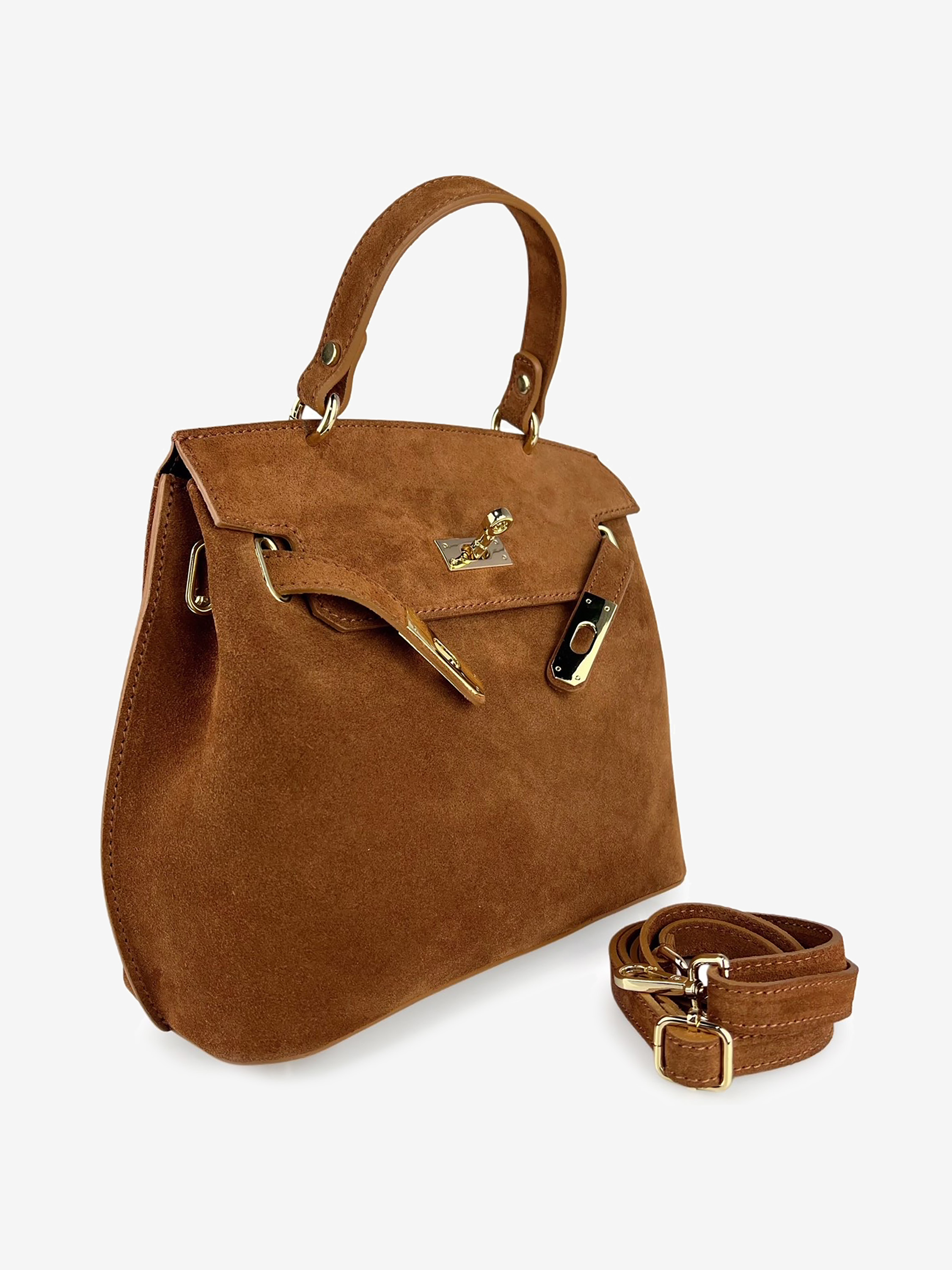 Zamszowa torbka z kolekcji HEGO'S Milano w koniakowym kolorze. Wewnętrz mała kieszeń zapinana na suwak oraz długi pasek na ramię.