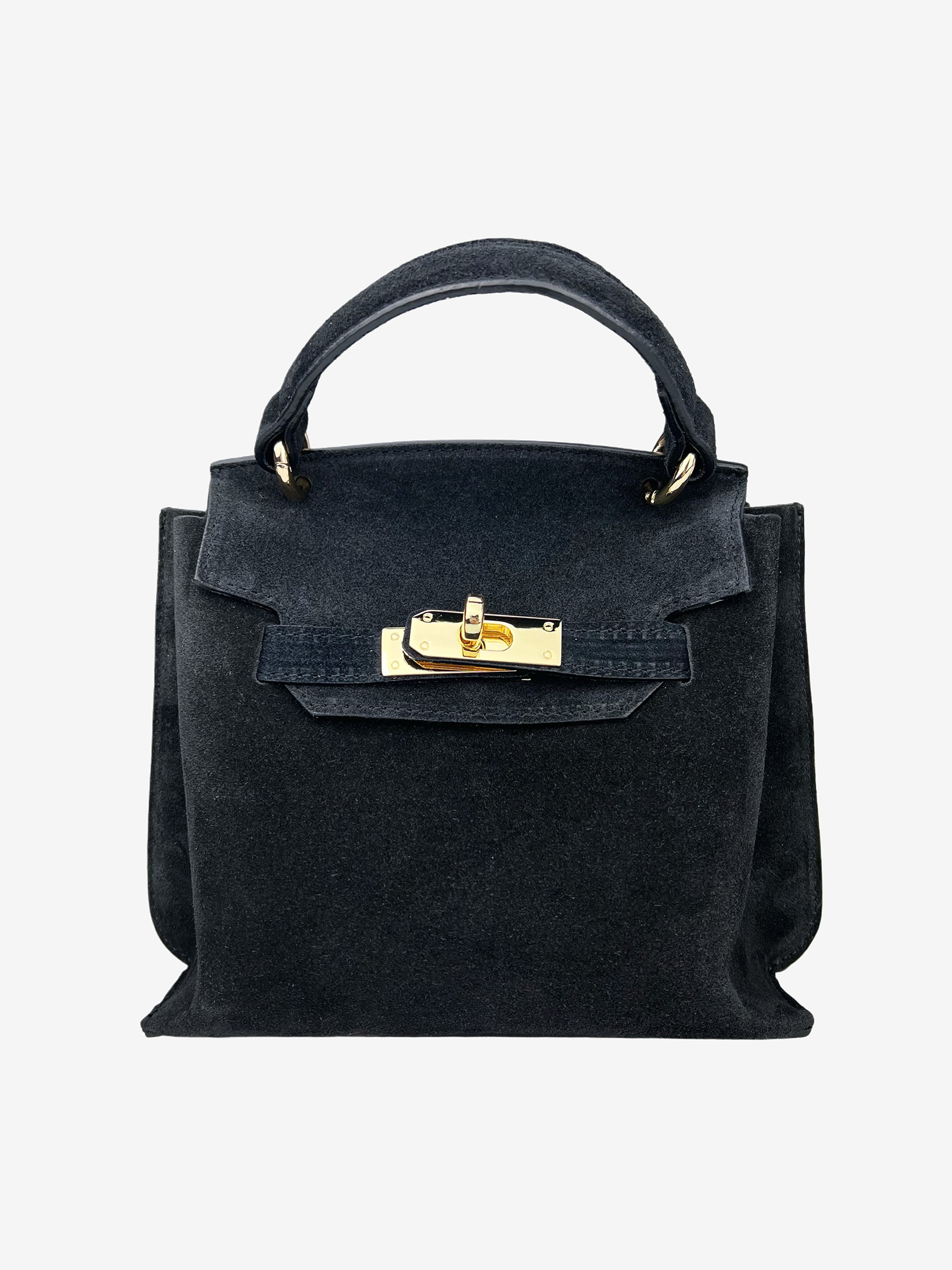 Mała zamszowa torebka z ozdobnym, złotym zapięciem. Dodatkowy, odczepiany pasek do noszenia na ramieniu.